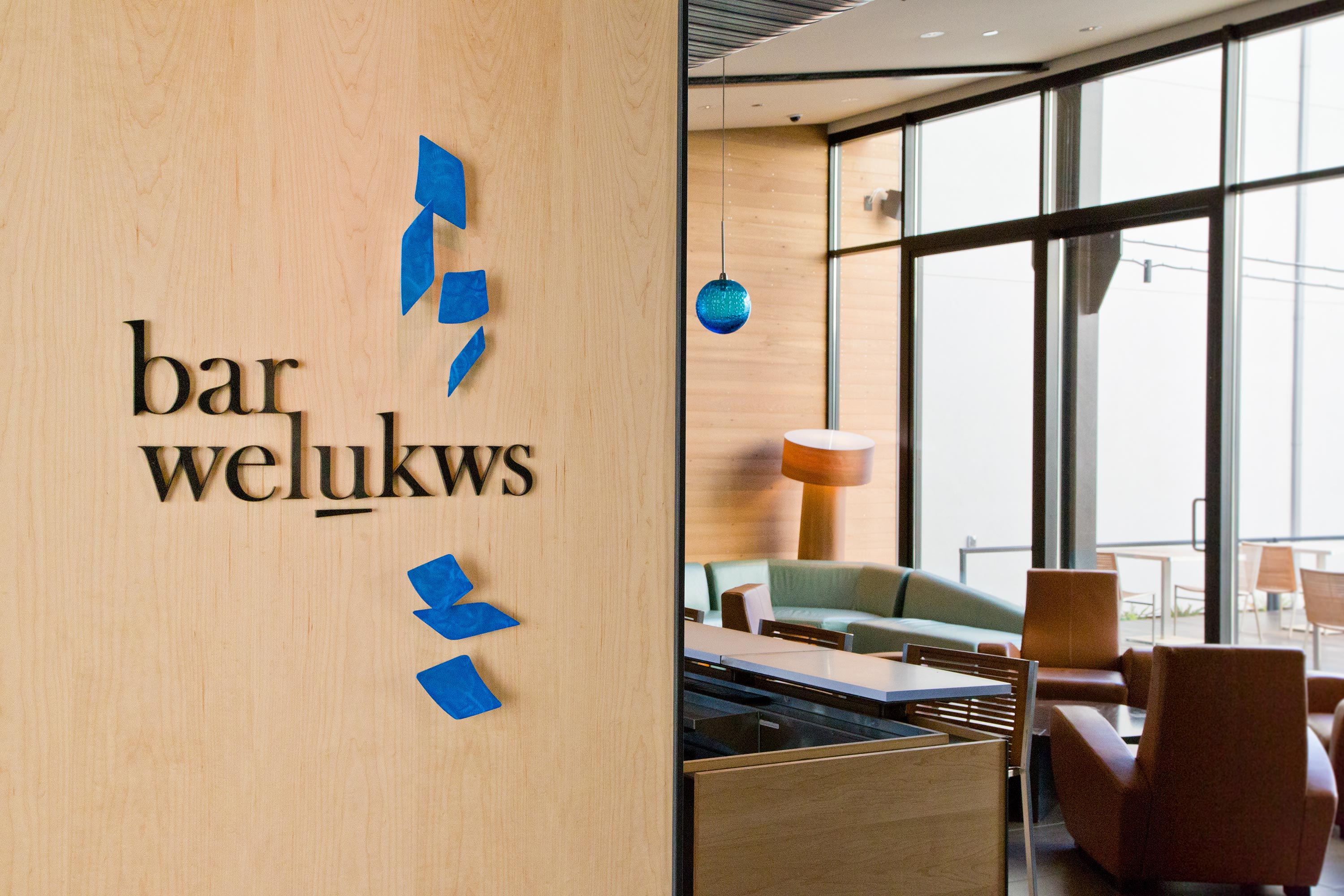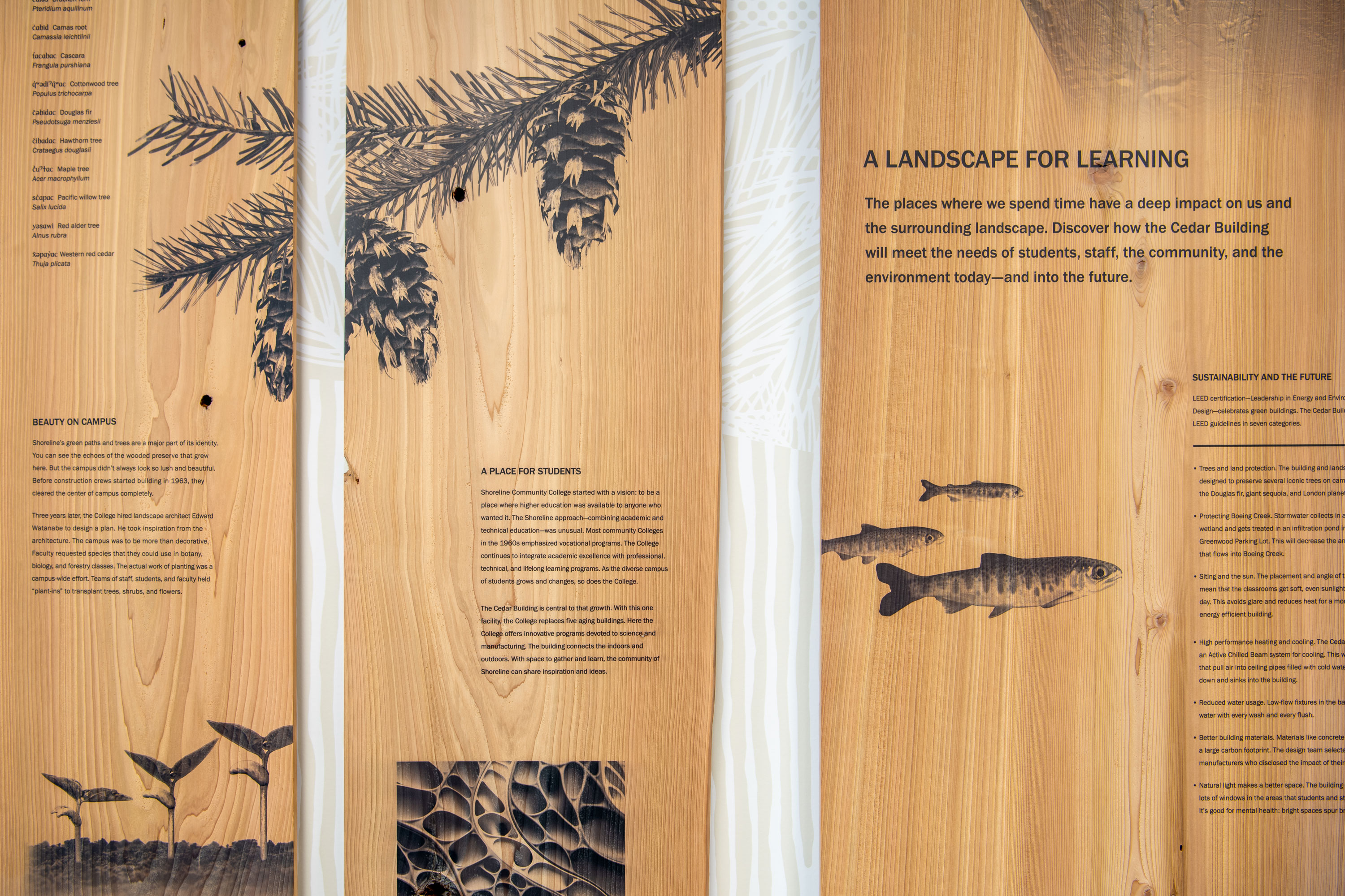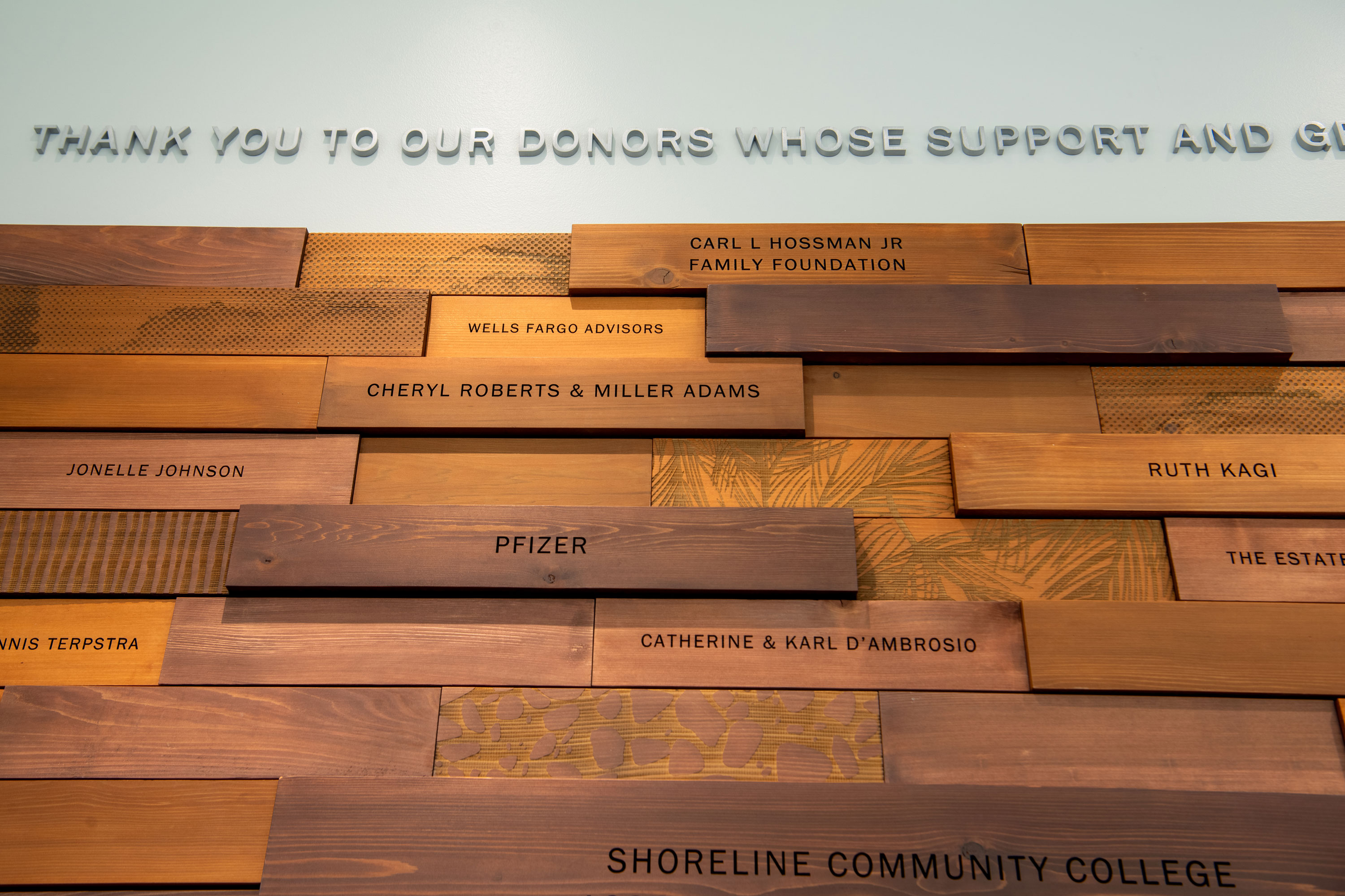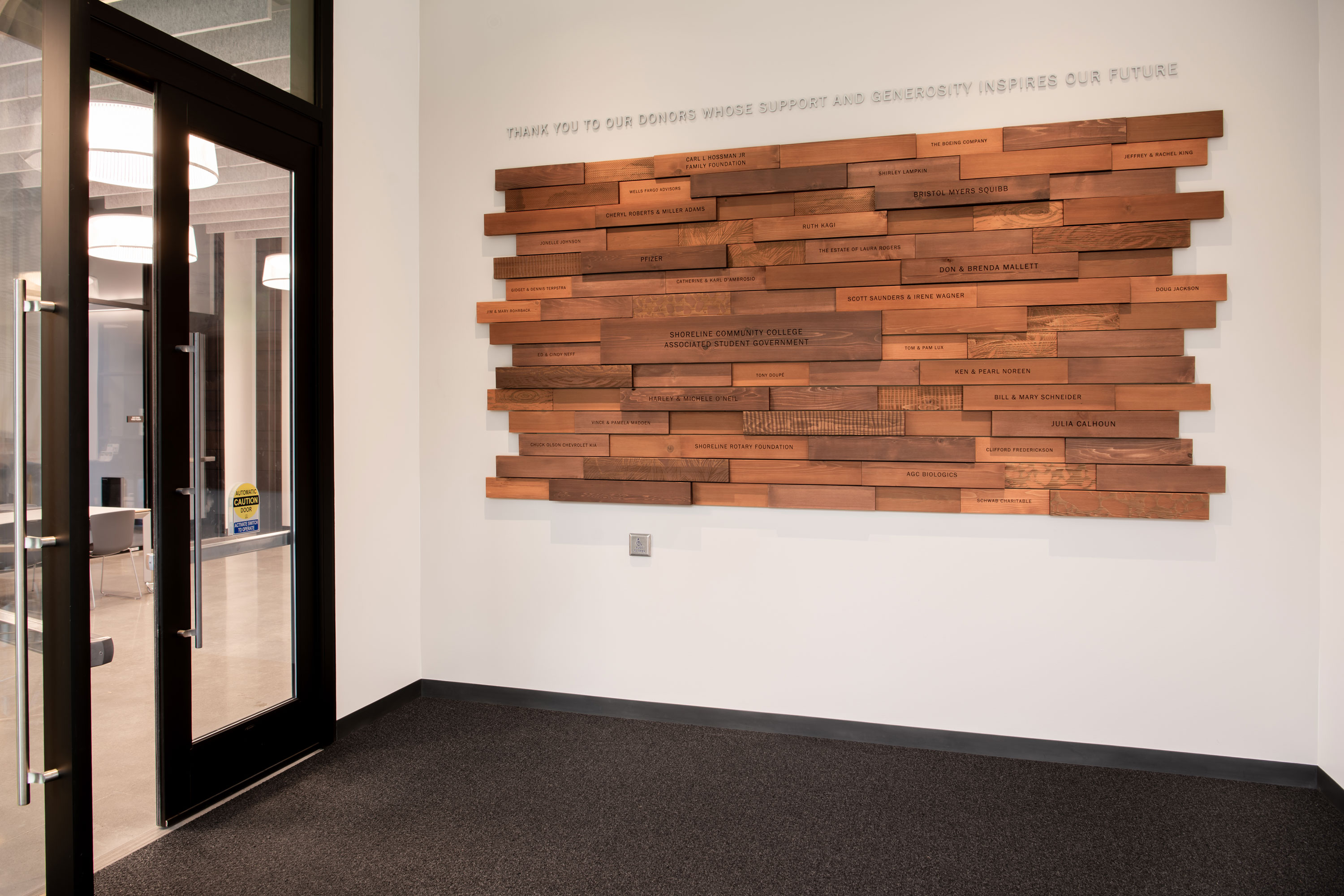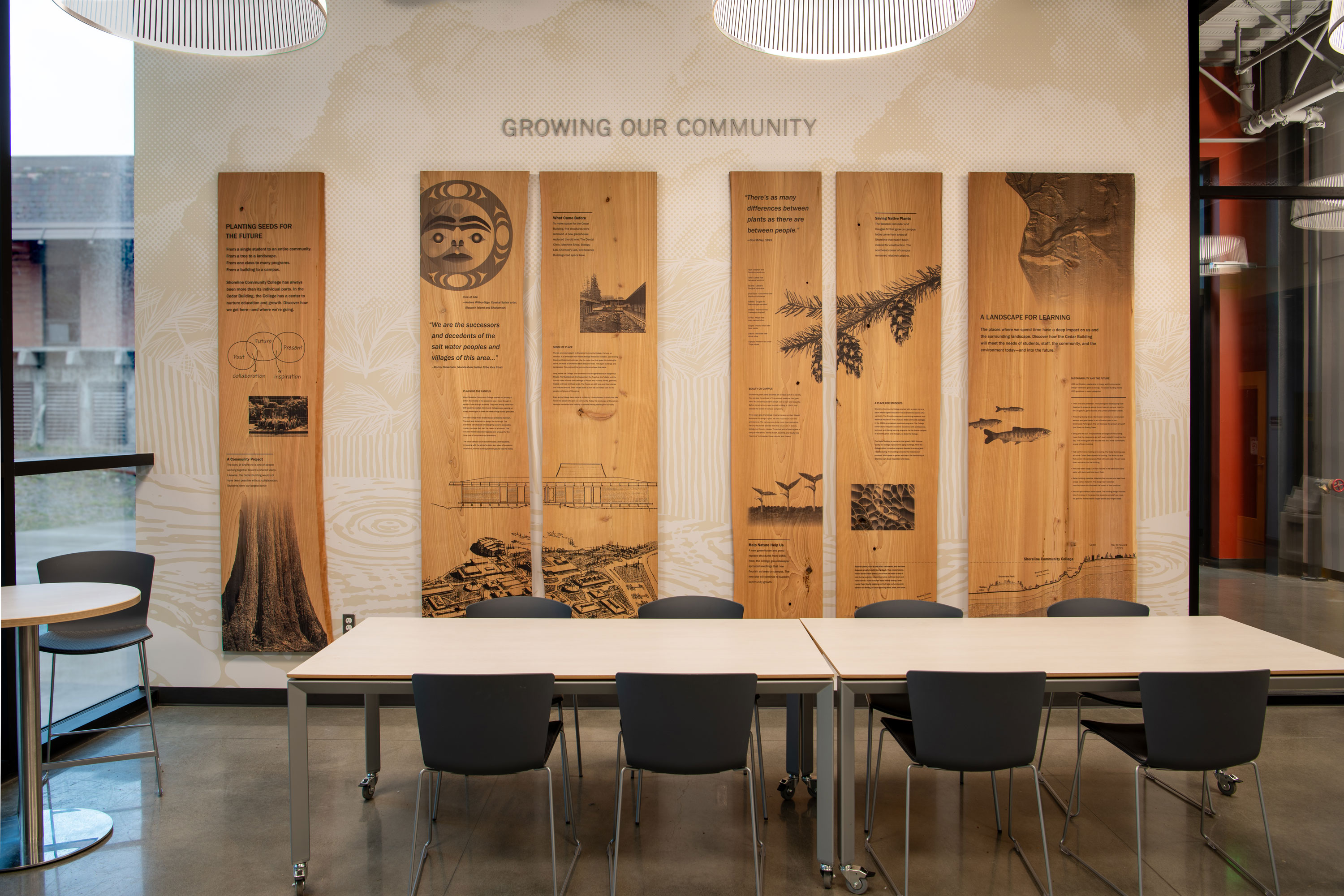 The Cedar building is named after the prolific Western Red Cedar trees, x̌əpay̓ac in Southern Lushootseed, which are beloved by Pacific Northwest Tribal Nations. Many styles of canoes are made from the trunks of the x̌əpay̓ac, the inner bark and roots are used to weave baskets and hats, and the leaves can be used to support respiratory systems. The Cedar building features two installations to honor this important Tribal resource and document the historic founding of the College and its evolution to a modern campus. The installations include, an interpretive display fabricated from cedar slabs in the main lobby and a donor wall at the entry assembled of cedar tiles, both constructed with natural wood elements to celebrate these revered campus trees and acknowledge the ongoing partnership with the Tribes.