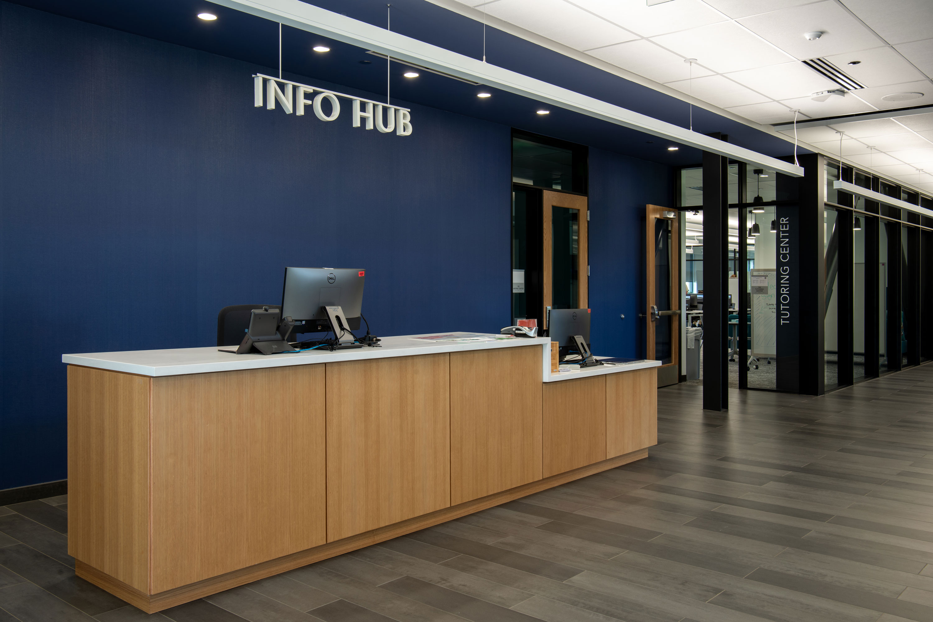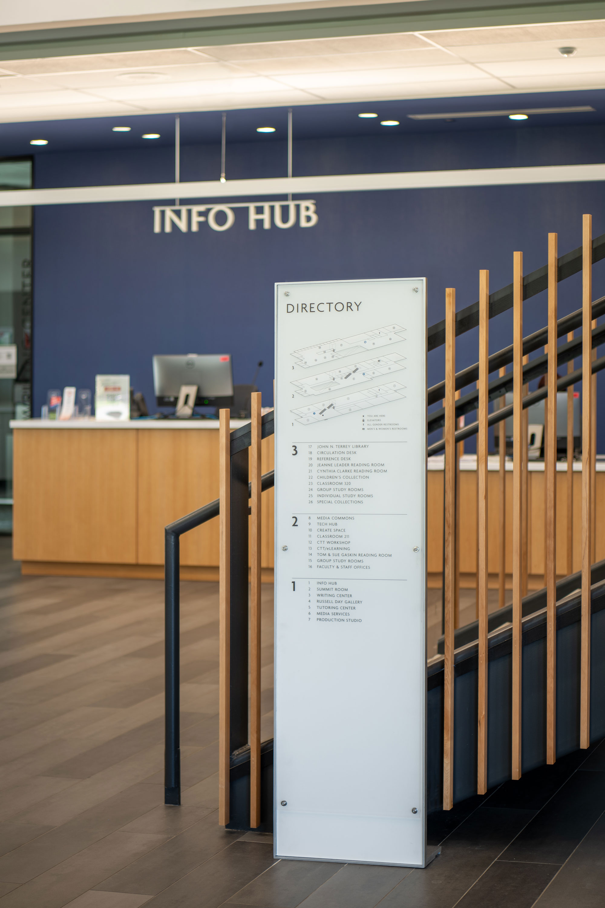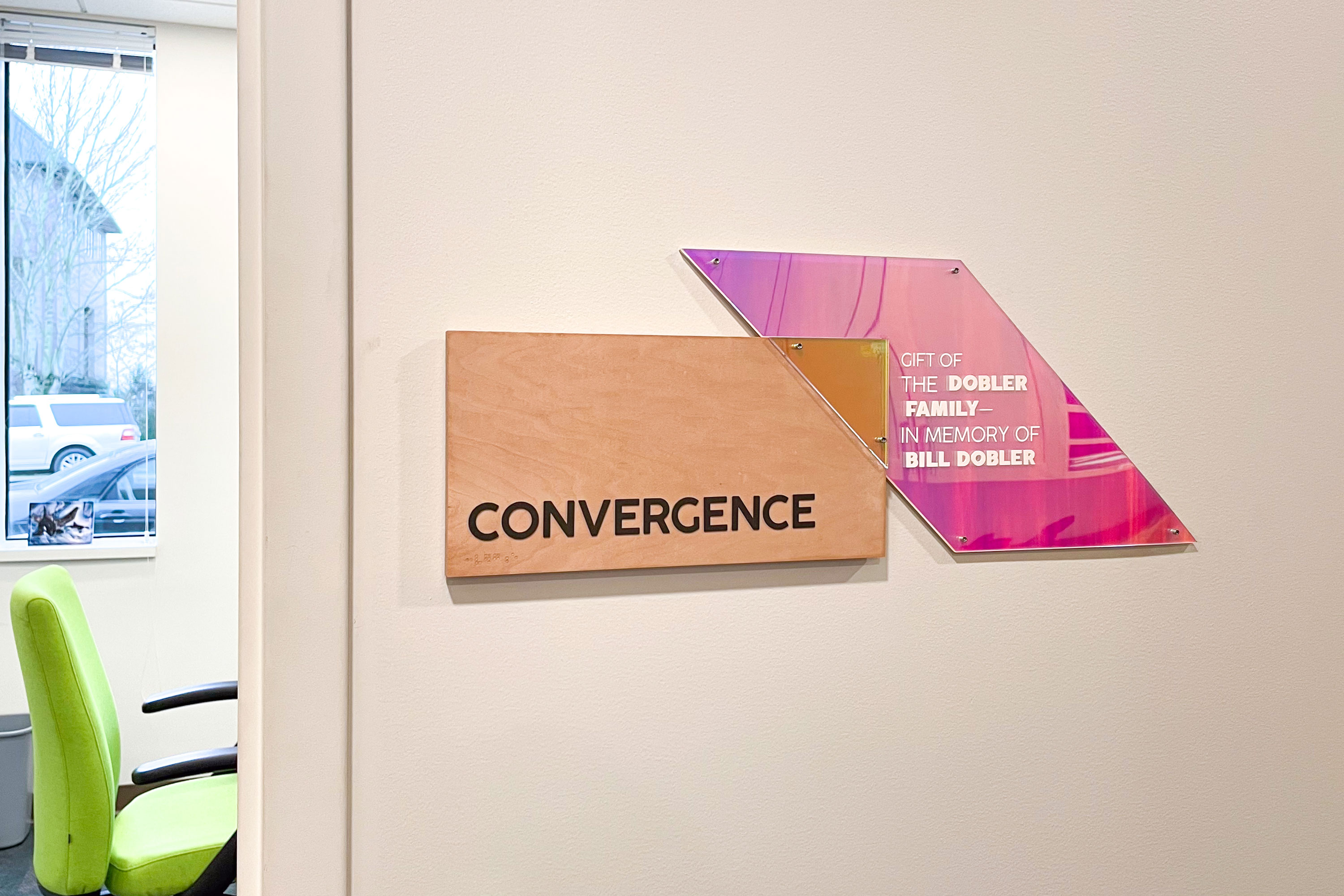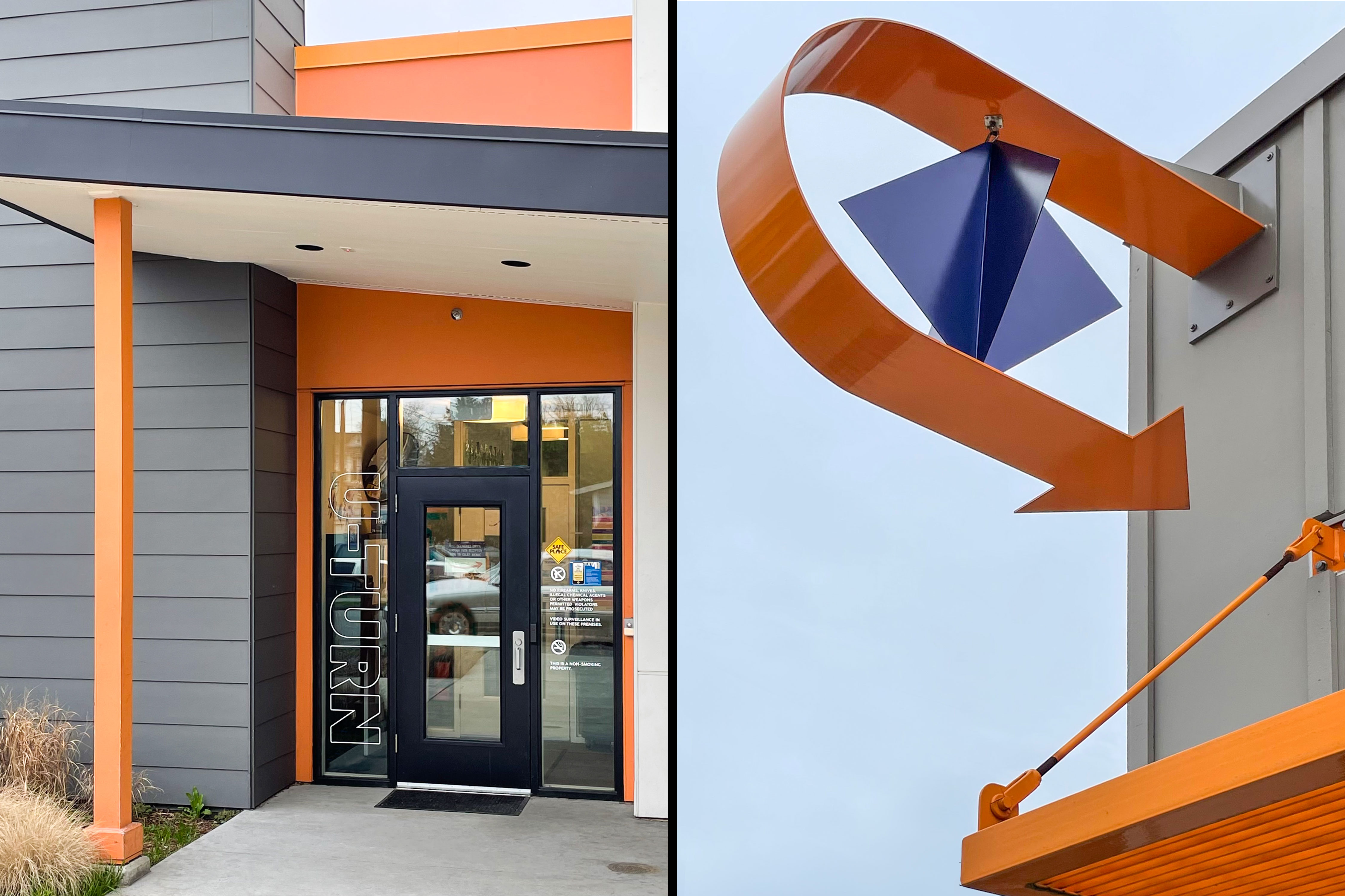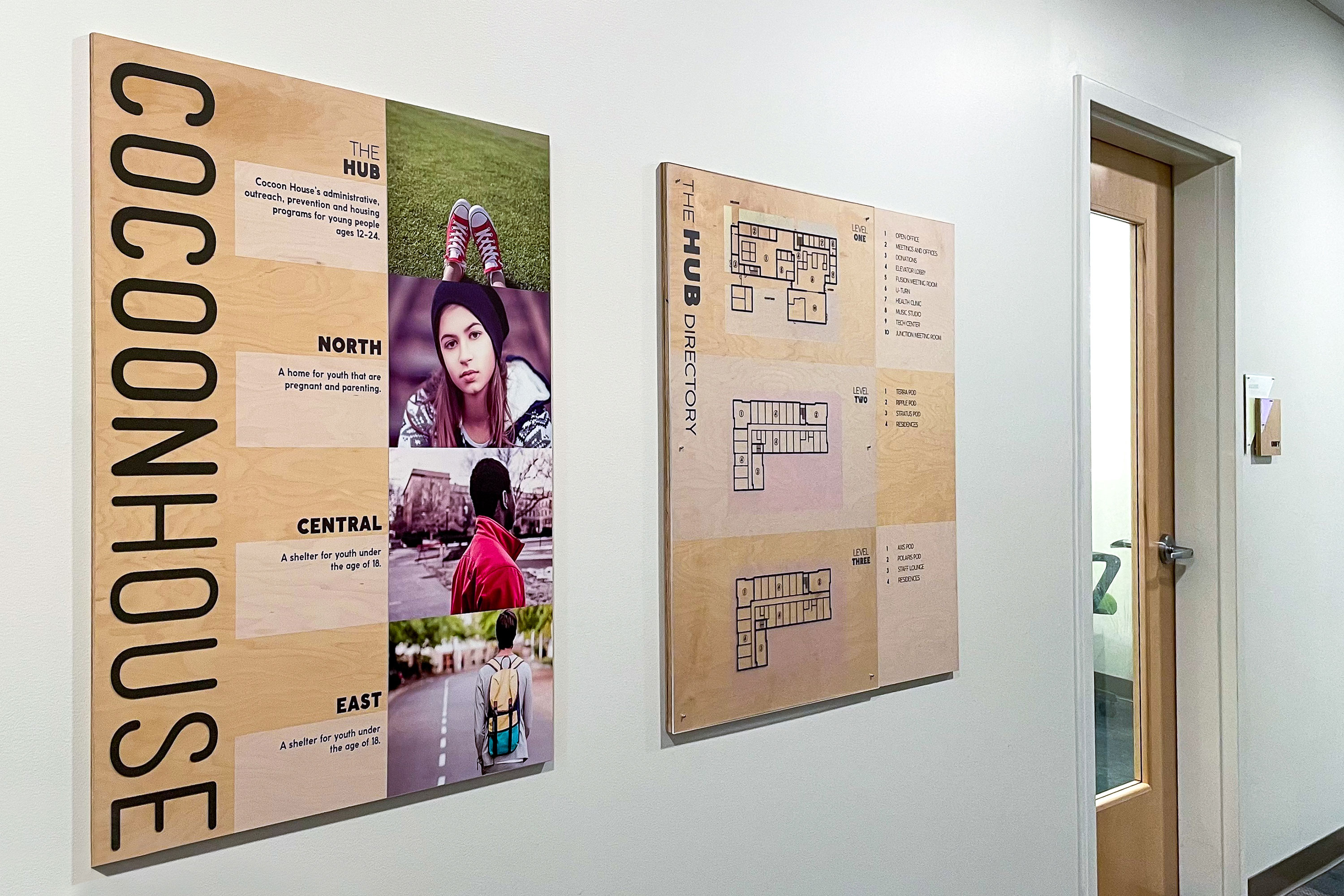 Made possible by an influential group of community donors, the environmental graphics include a donor wall design featuring inviting materials and color accents conveying the strong sense of community embodied at The Hub. In addition, the vital youth day center within The Hub, U-Turn, is celebrated with a playful kinetic sign near its entrance to enhance visibility and create a welcoming invitation to visit the center. For visitors, an interior directory provides an overview of Cocoon House services with an orientation map to communicate the breadth of services at The Hub.