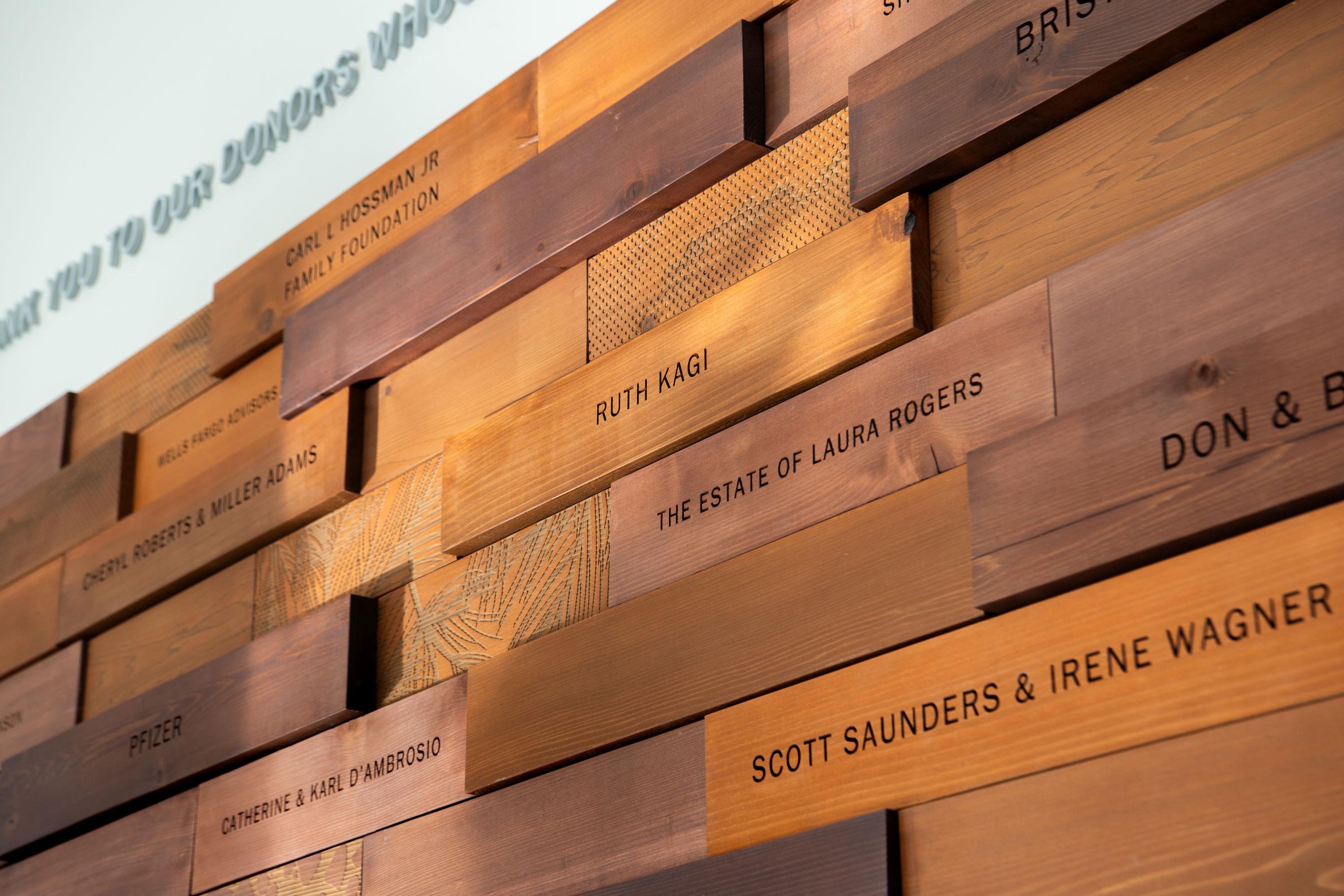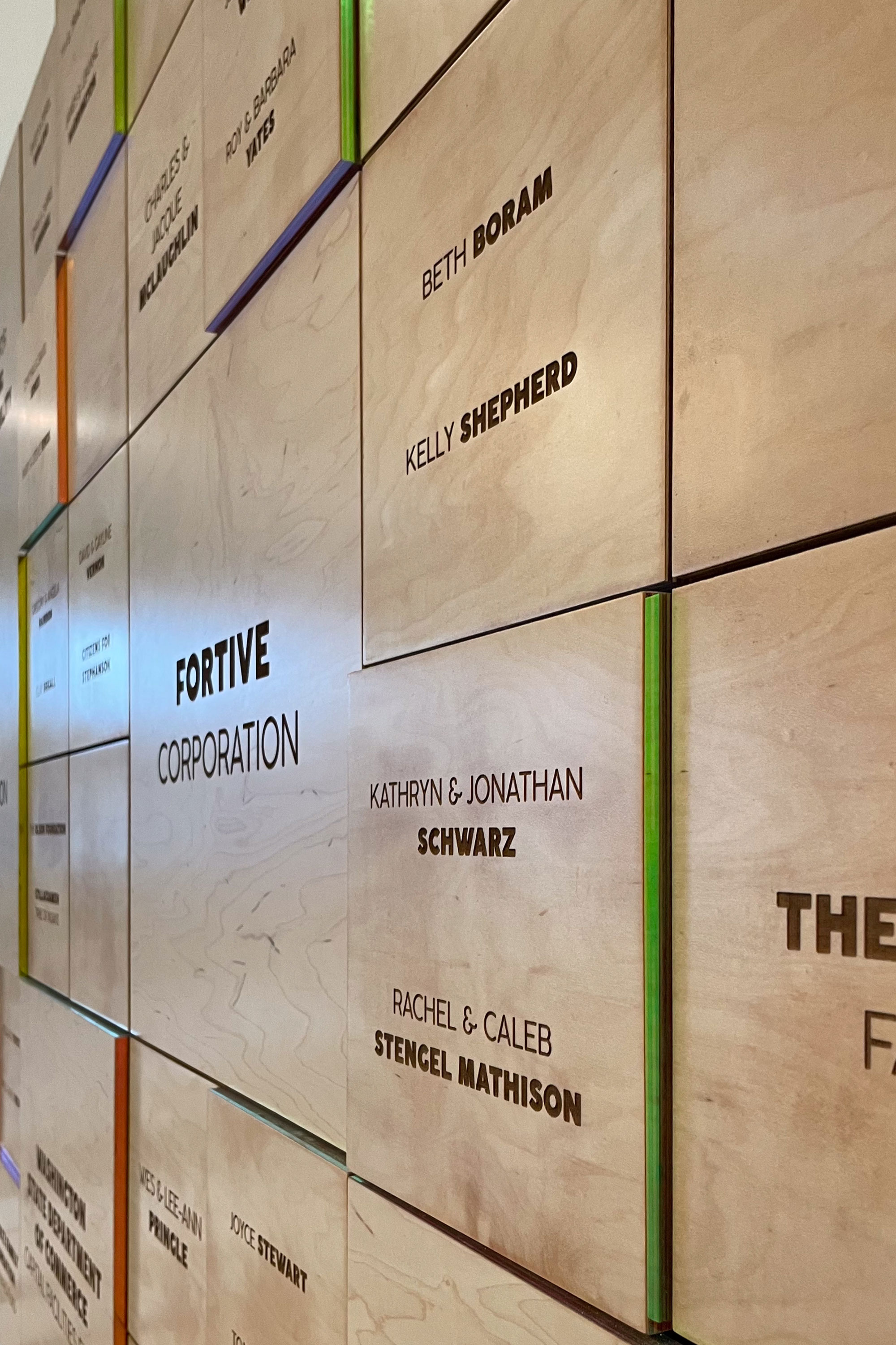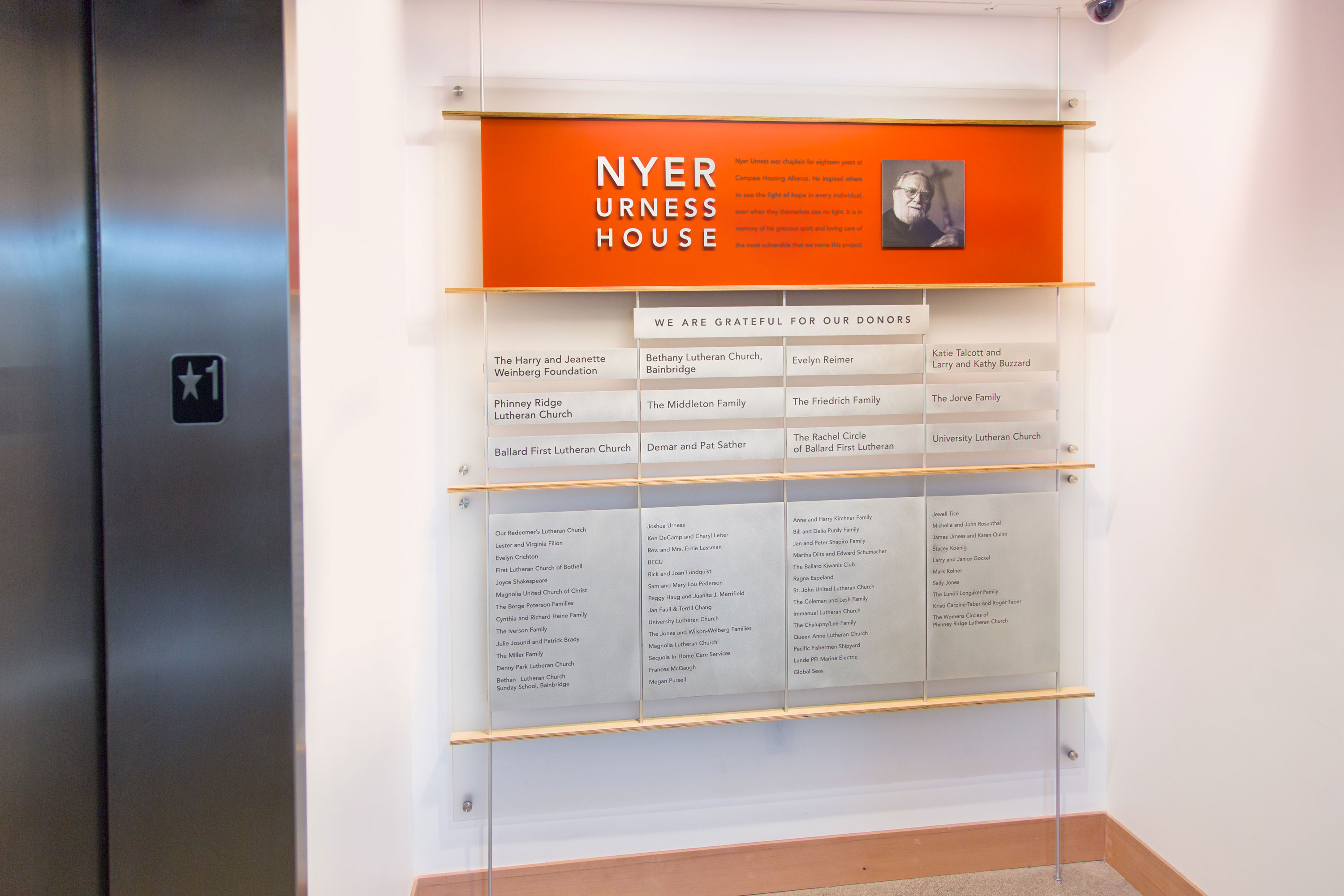 The building designed by Weinstein AU is filled with light and a simple bright palette of modern materials. Drawing upon this design language, Nyer Urness House donors are honored throughout the building on commemorative signage at main rooms and featured together on a Donor Wall display in the entry lobby. The Donor Wall and building dedication to Nyer Urness are presented with etched metal panels displaying the names of all those who generously gave to the project. In one wall display, these lightweight materials are consistent with the modern appeal of the lobby space, using colored resin, natural finish maple apple-ply and simple metal fasteners. On the exterior facade, the building name in dimensional metal lettering and color glass welcomes all to Nyer Urness House.