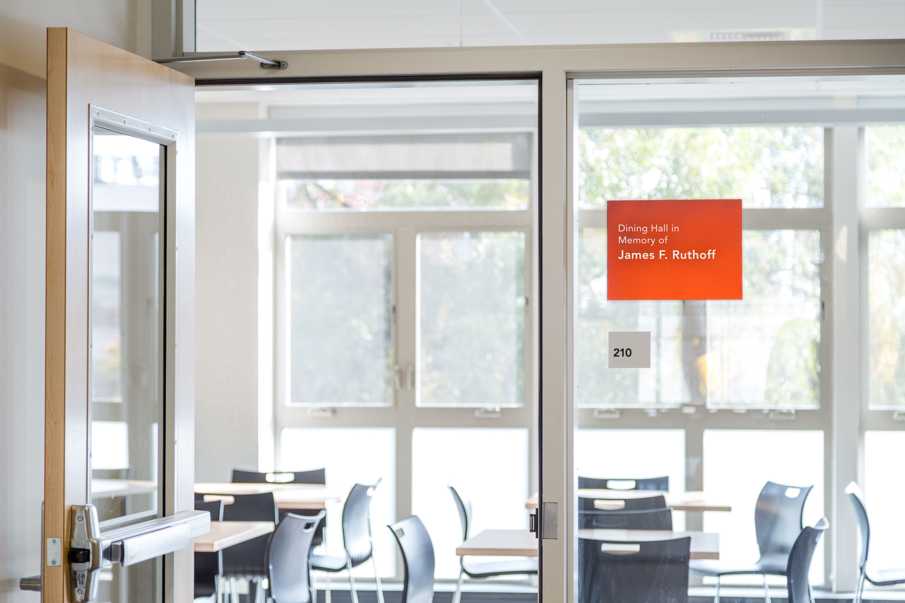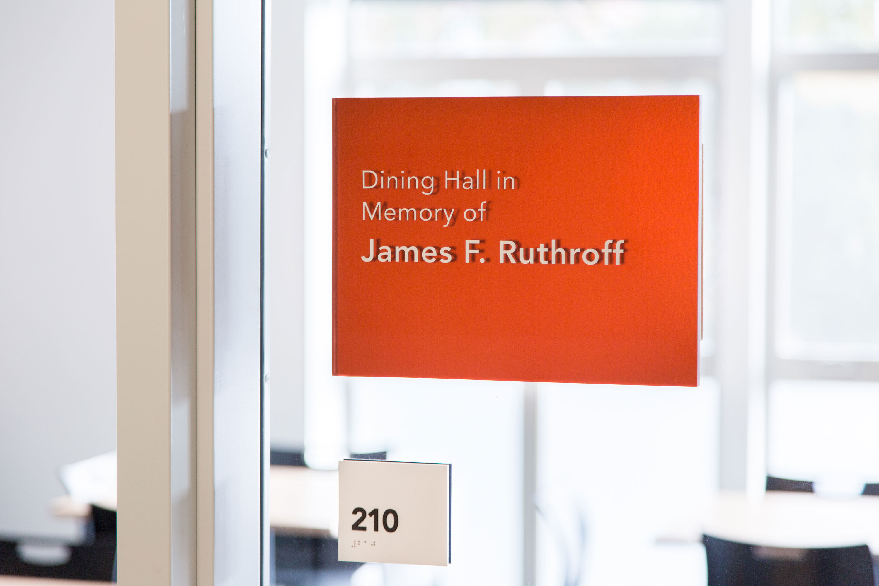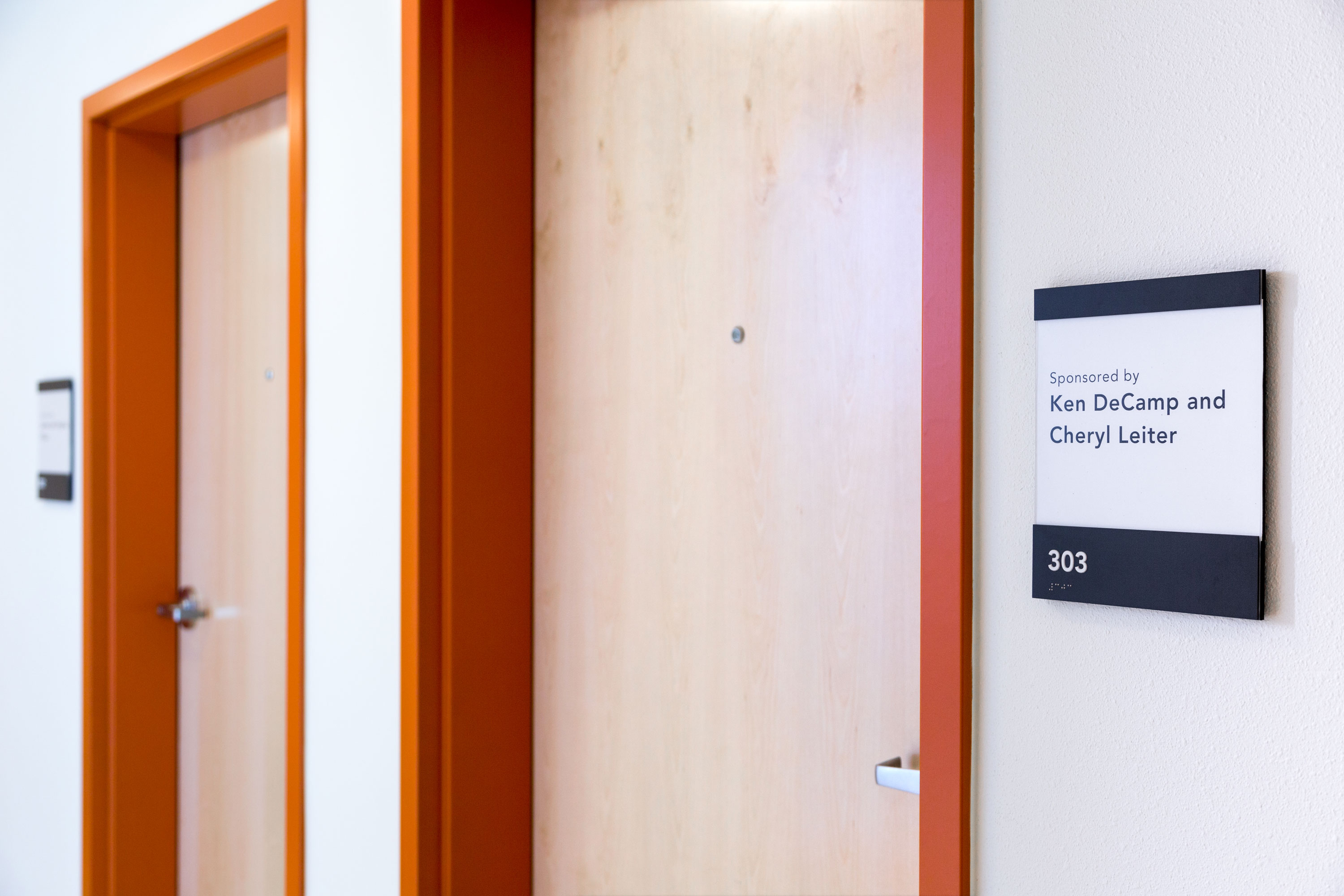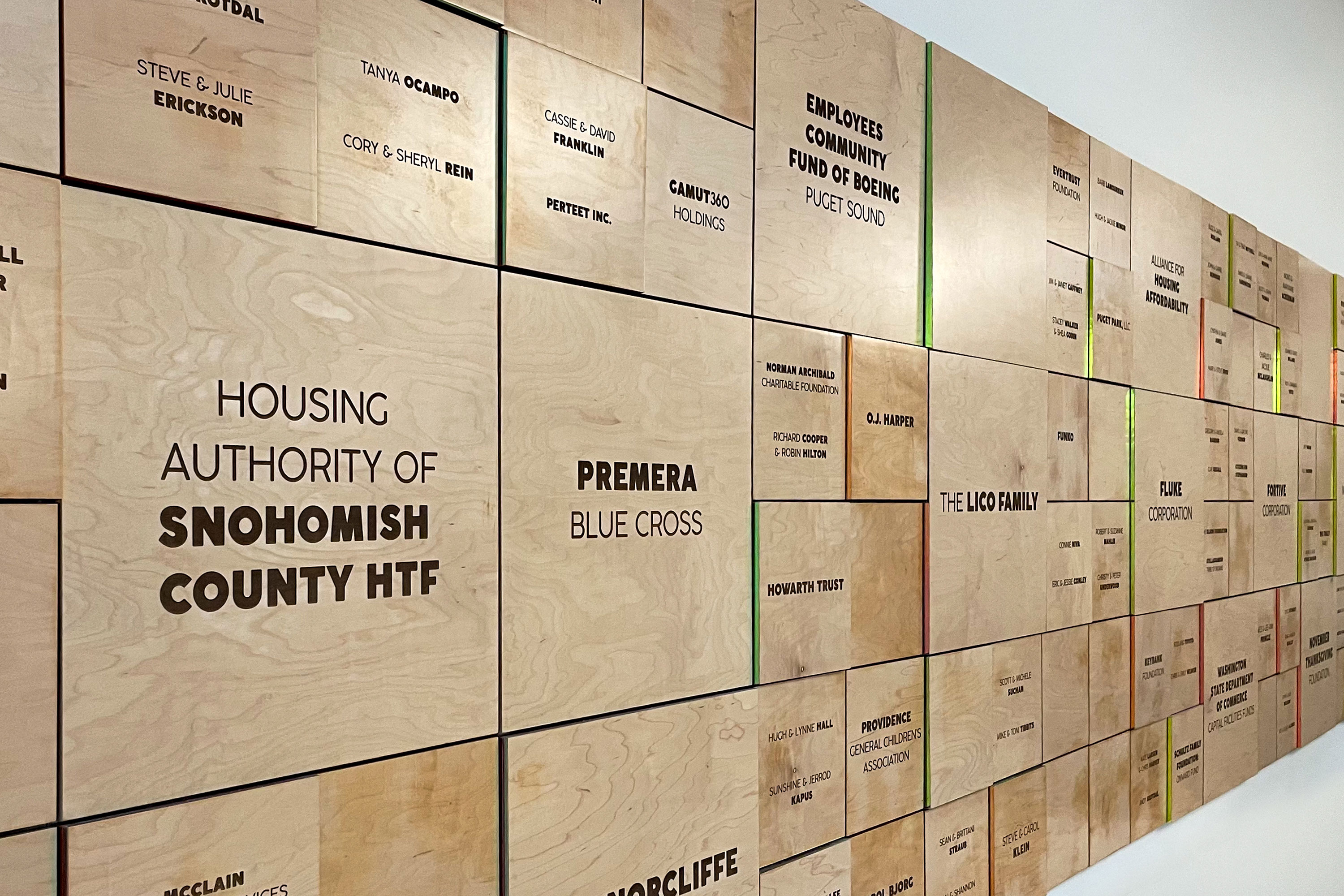 The building designed by Weinstein AU is filled with light and a simple bright palette of modern materials. Drawing upon this design language, Nyer Urness House donors are honored throughout the building on commemorative signage at main rooms and featured together on a Donor Wall display in the entry lobby. The Donor Wall and building dedication to Nyer Urness are presented with etched metal panels displaying the names of all those who generously gave to the project. In one wall display, these lightweight materials are consistent with the modern appeal of the lobby space, using colored resin, natural finish maple apple-ply and simple metal fasteners. On the exterior facade, the building name in dimensional metal lettering and color glass welcomes all to Nyer Urness House.