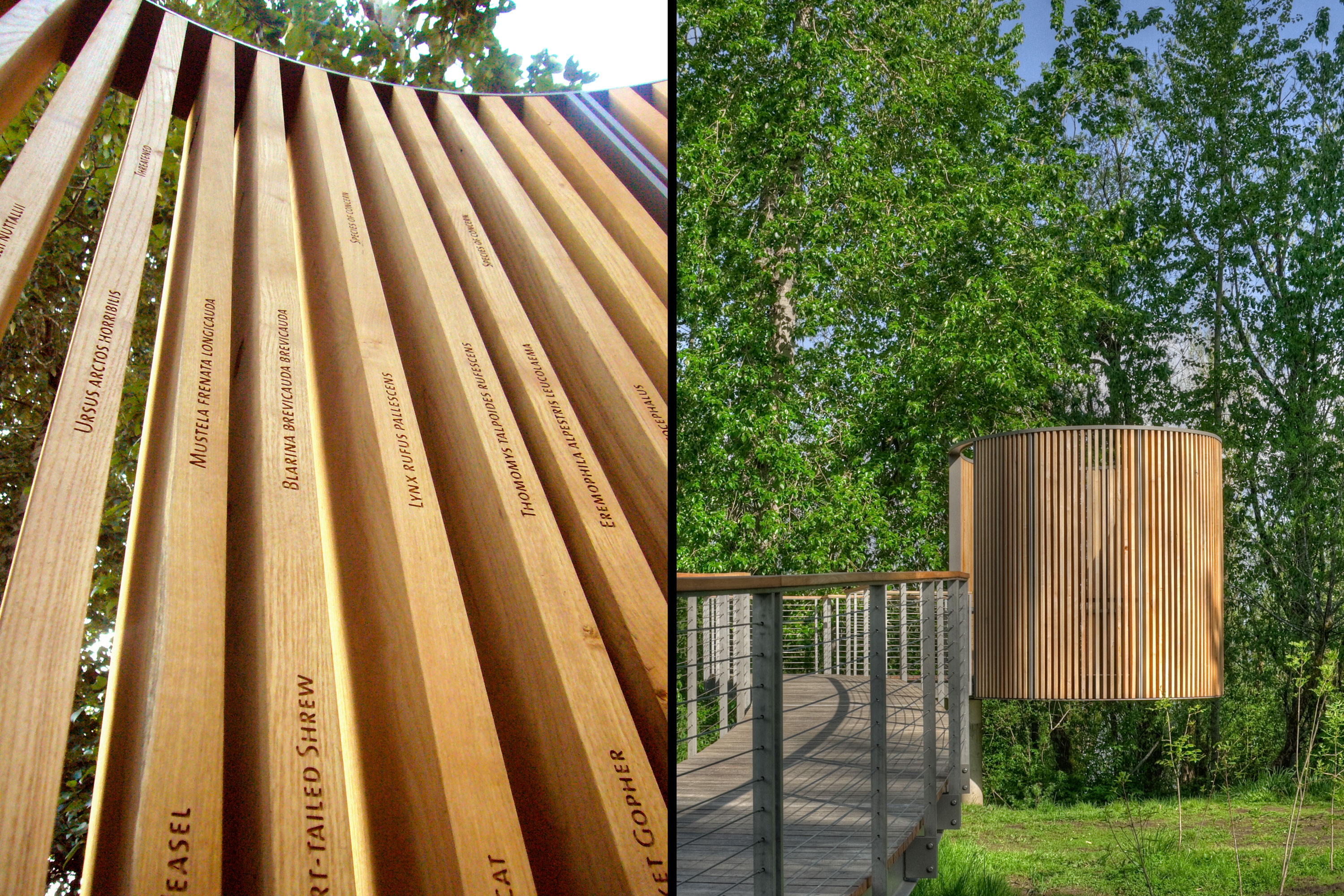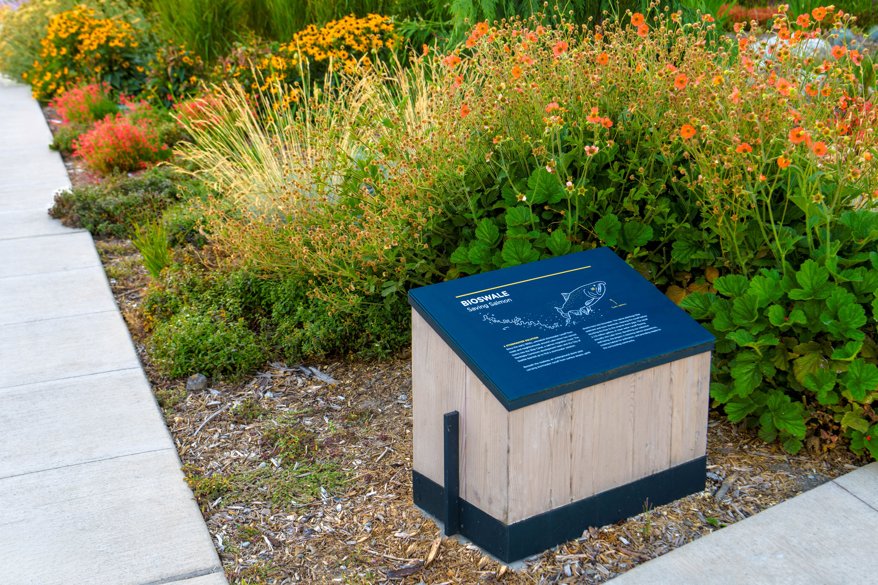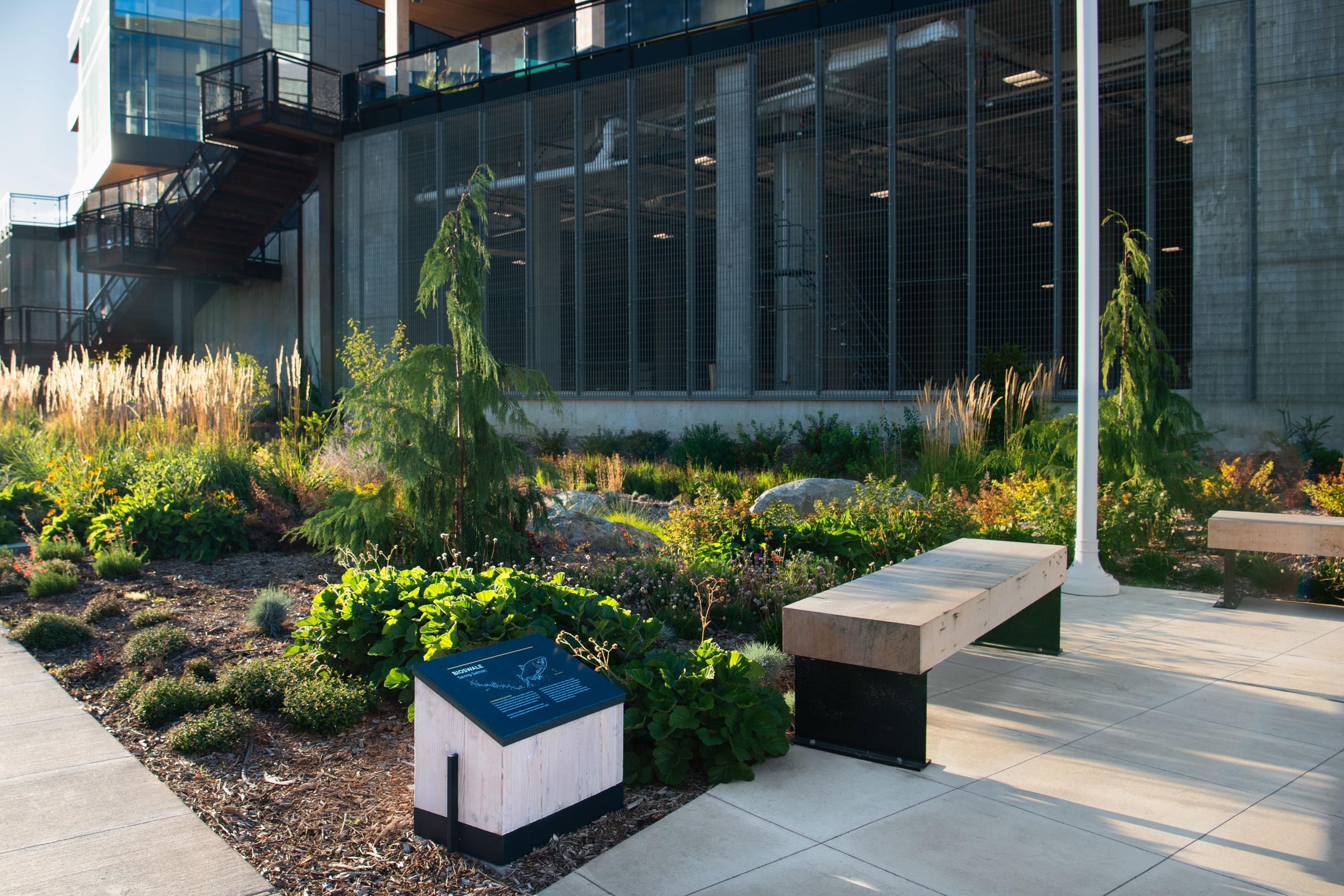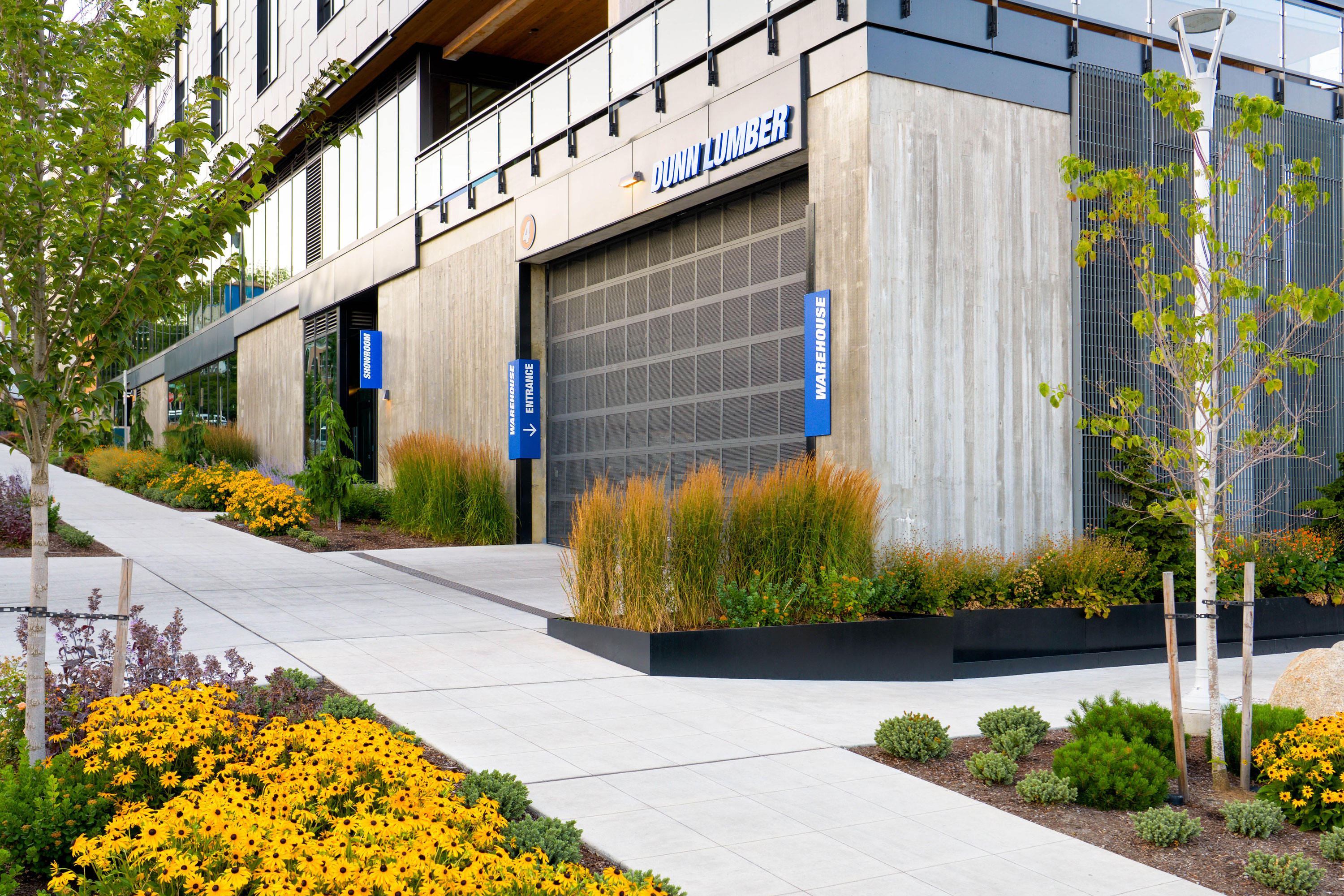 Site Identity and wayfinding elements were crafted from glulam remnants reclaimed during the mass timber construction. In addition to these sign elements providing material continuity and orientation on site, the design includes interpretive panels on Dunn Family history, mass timber construction technique, and sustainable features of the landscape design. On the lower-level Dunn Lumber maintains a new warehouse and showroom extending their history on site and into the future.