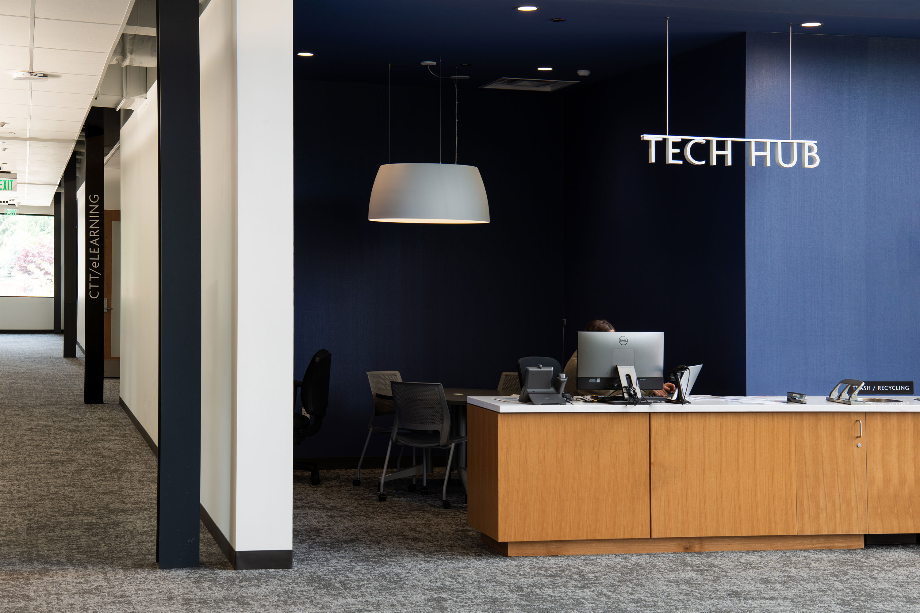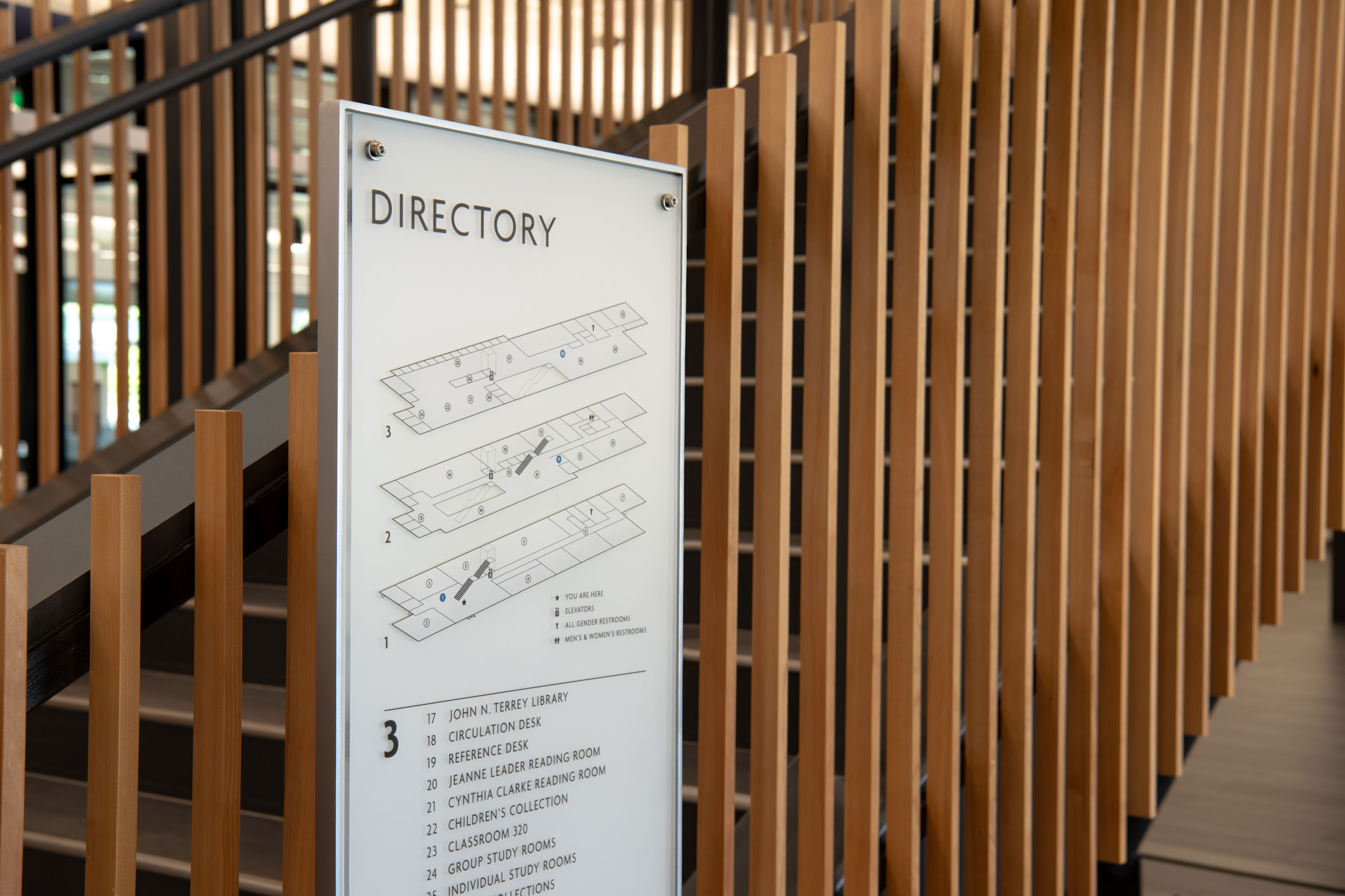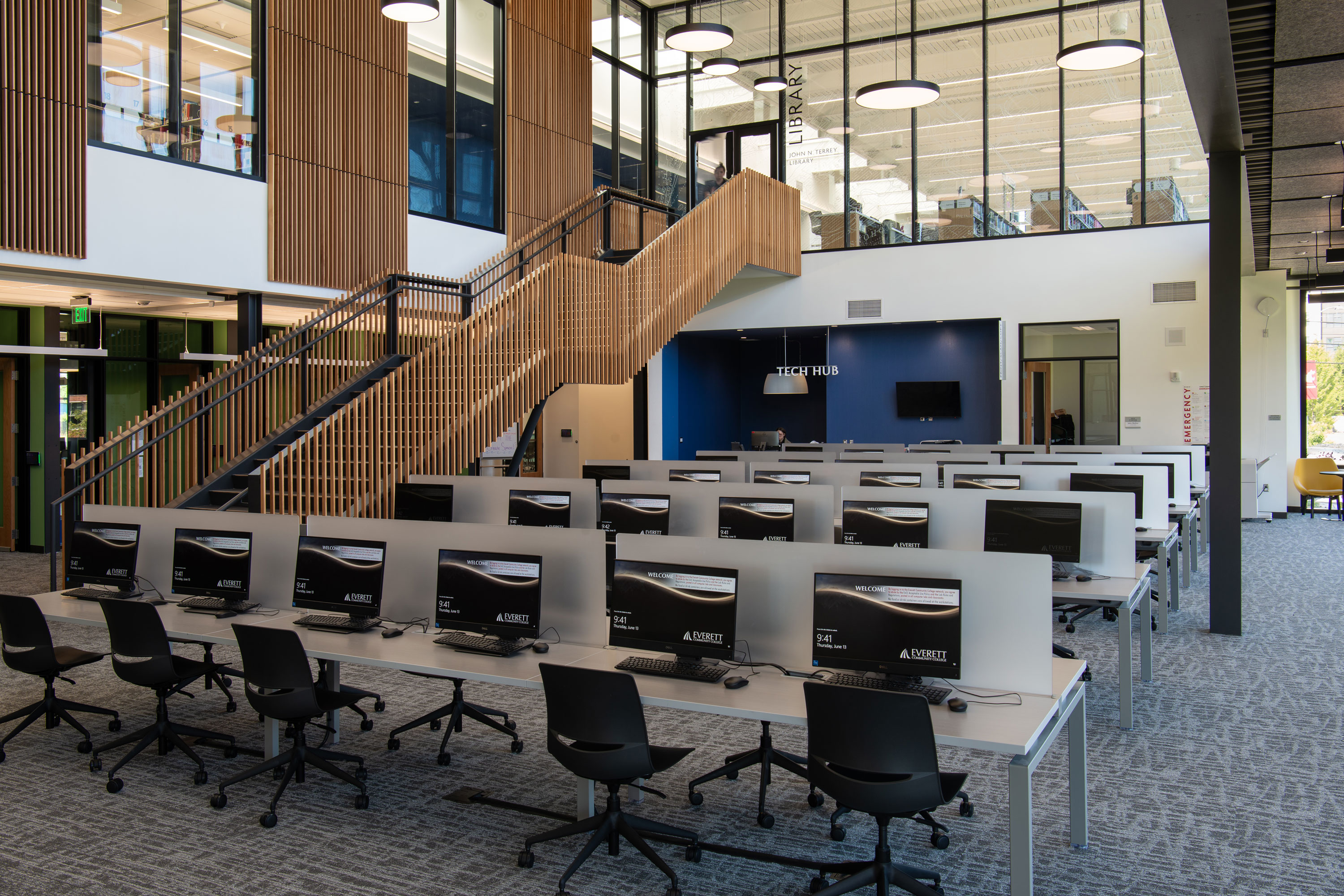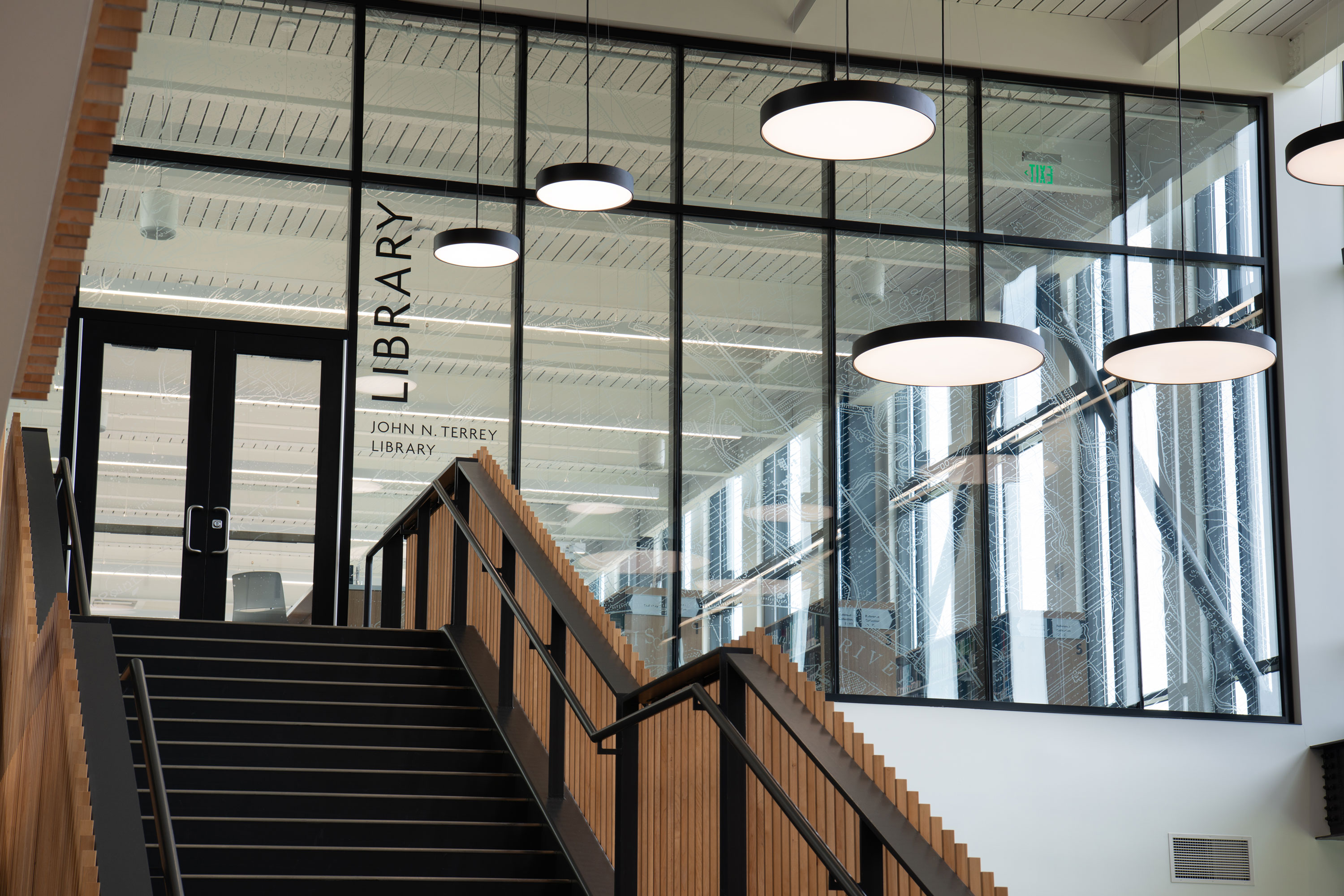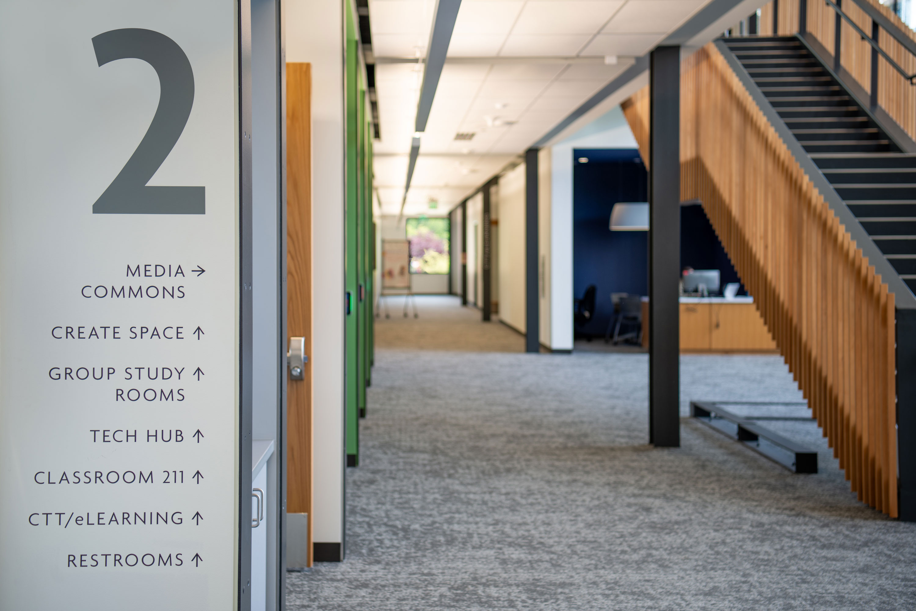 The LRC building is a magnet for students—a central stair rises through an atrium that connects the building’s programs, from active uses at the ground level to group study and media commons on the second floor and terminating with quieter individual study and reading rooms at the library. Spaces are organized to facilitate wayfinding and promote peer-to-peer engagement. The environmental graphic design extends the architectural and material design language throughout the building with a design scheme that builds upon historic Snohomish River Delta imagery coupled with hub area identities and a comprehensive program for the library stacks.