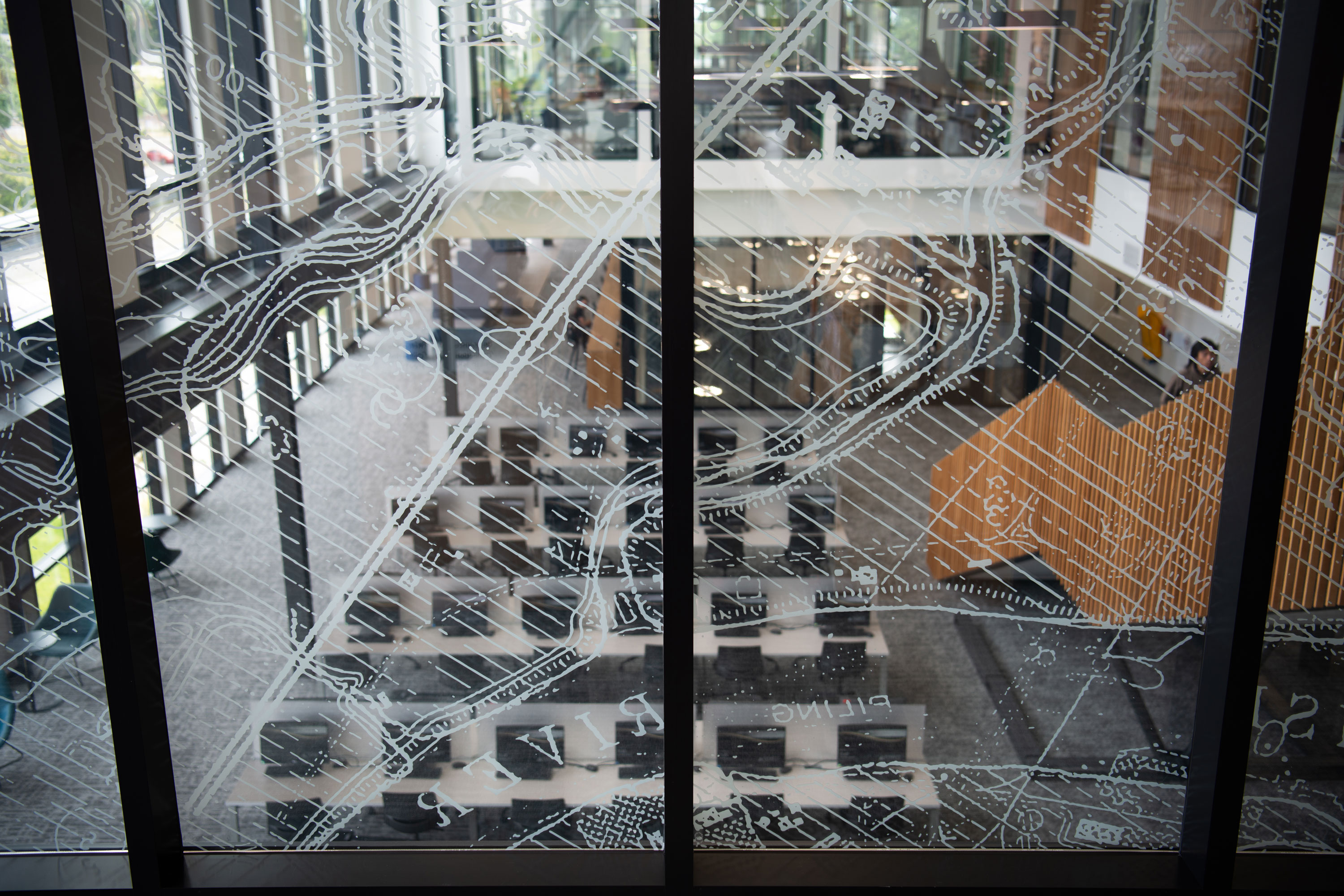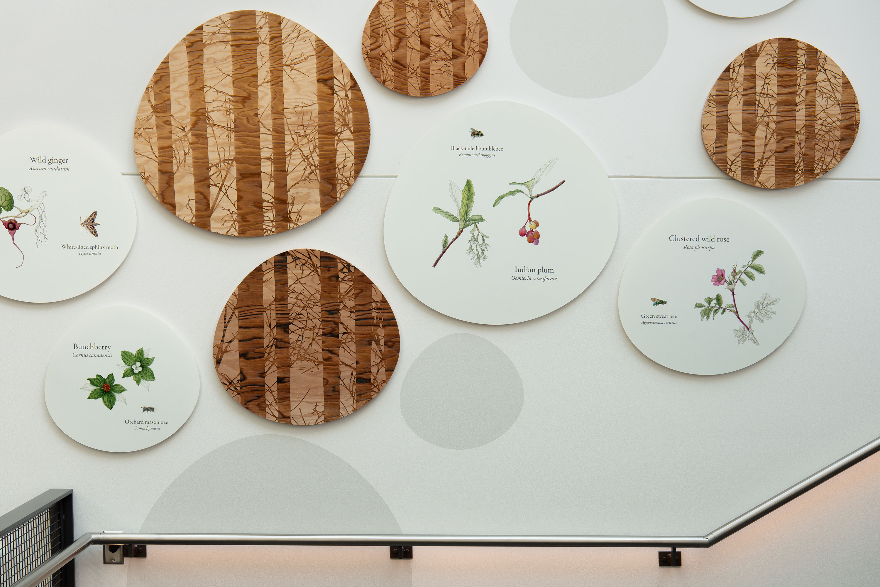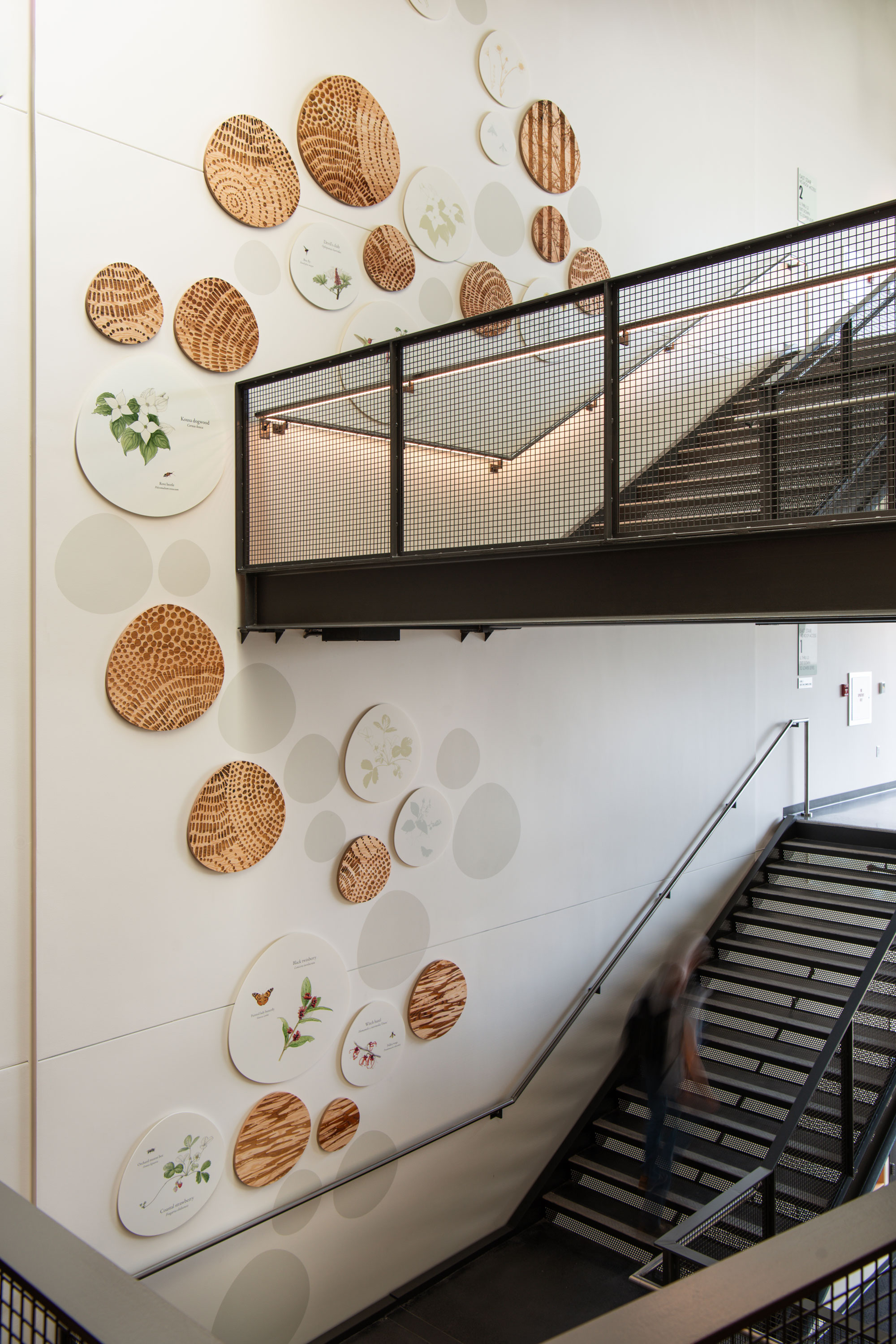 Innovation Hall is bathed in light. A skylit central atrium and monumental stair connect Innovation Hall’s levels and departments. Individual and group study spaces are distributed along this central mixing area, encouraging student collaboration and reinforcing a sense of community. The building is sited at the center of campus on a slope between wetlands and an upland conifer forest and surrounded by a landscape that supports climate adaptive plantings and local pollinators. The building identity and wayfinding is symbolized by an emergent motif inspired by the unique environmental attributes of the site and the building’s spirit of collaboration. To connect inside and outside, an installation inspired by sustainable planting initiatives present throughout the campus ecosystem are exhibited along the height of the monumental stair. The installation features pollinator-friendly plants and pollinators ranging from the wetlands to conifer forest. Illustrations in this exhibit were drawn by the botanical artist Janene Walkky.