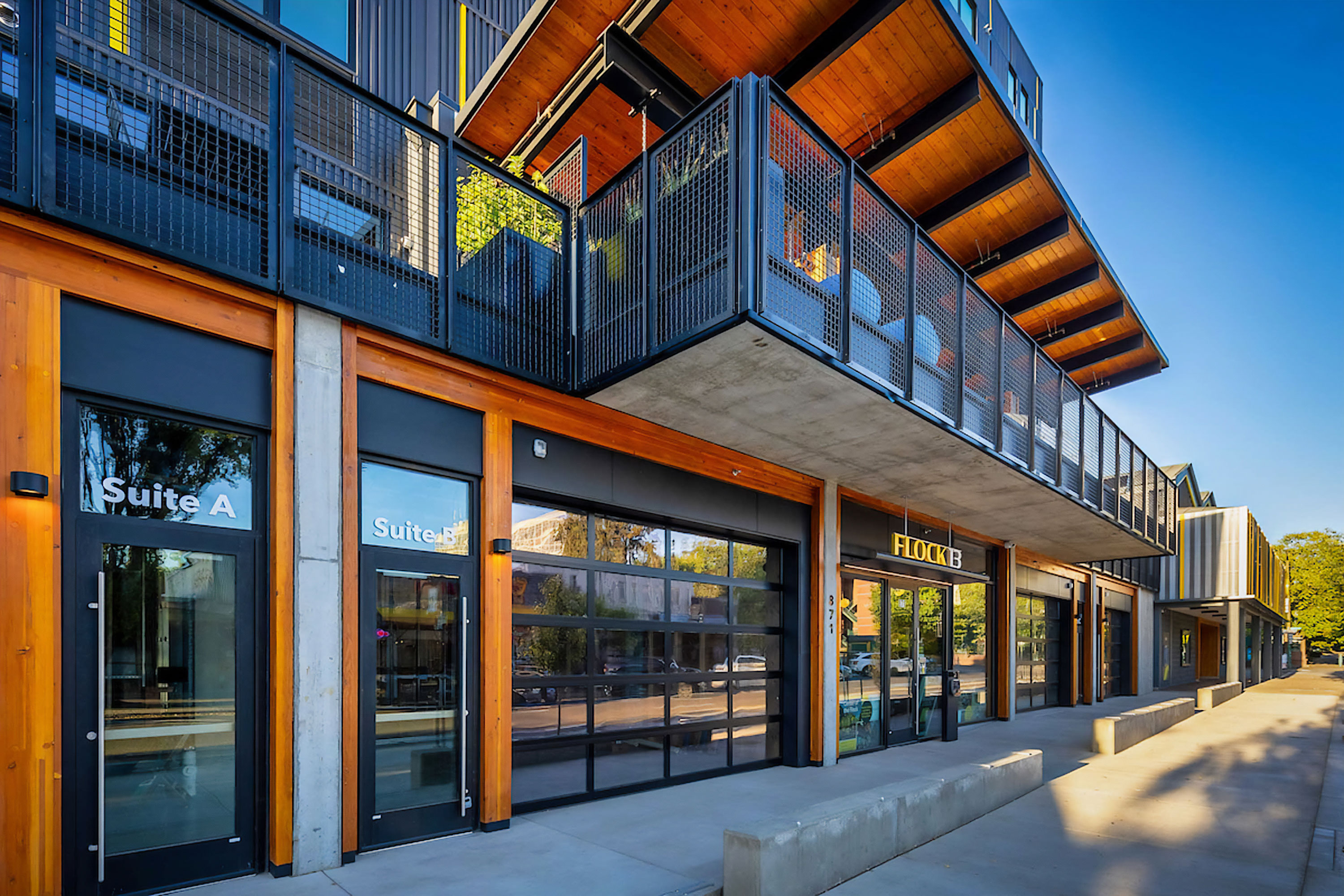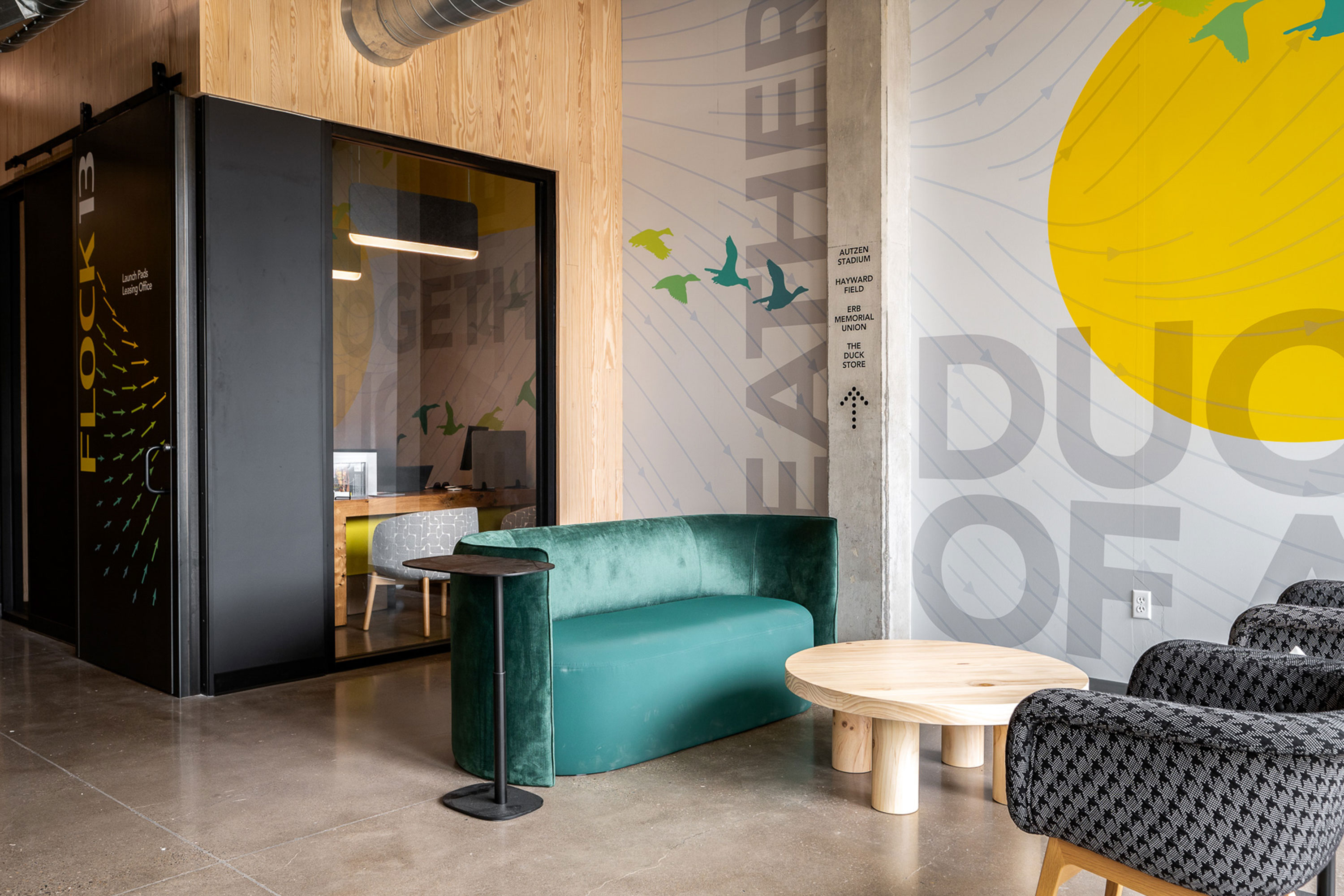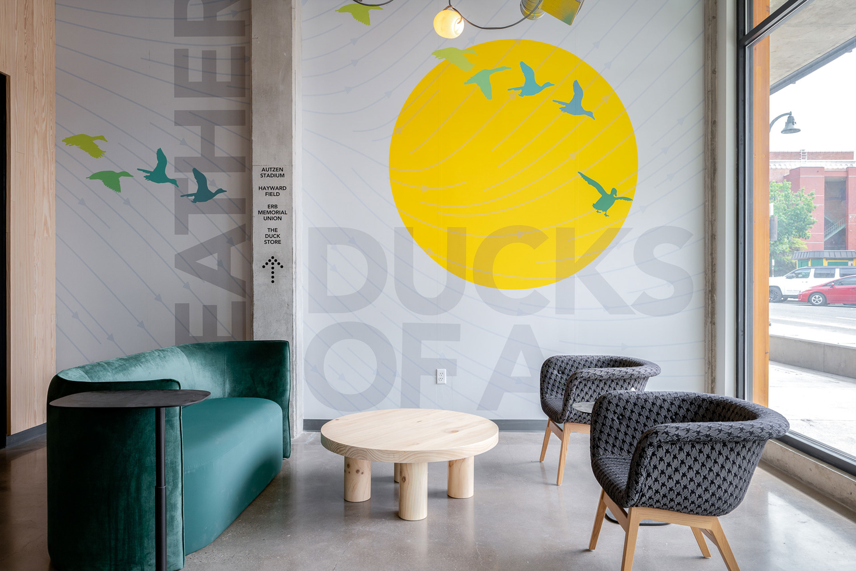 Flock13 is a high quality off-campus housing community that encourages collaboration and community in the most convenient district one step from campus. The building strengthens and enhances the vitality of 13th Avenue as the commercial center serving the students, staff, and visitors of the University of Oregon. Amenities include shared common space, the second-floor terrace, secure bike storage, pet washing area, and a mail room. Designed in conjunction with an exterior refresh of The Duck Store. The new façade of this flagship store introduces a wood-lined entry, graphic and illuminated signage over a perforated screen with metal panels. Each thoughtfully designed floor plan reflects a fresh, modern, and contemporary aesthetic. With a variety of outfitted study spaces and communal living rooms, the student experience strikes a balance between quiet contemplation and uplifting partnerships.