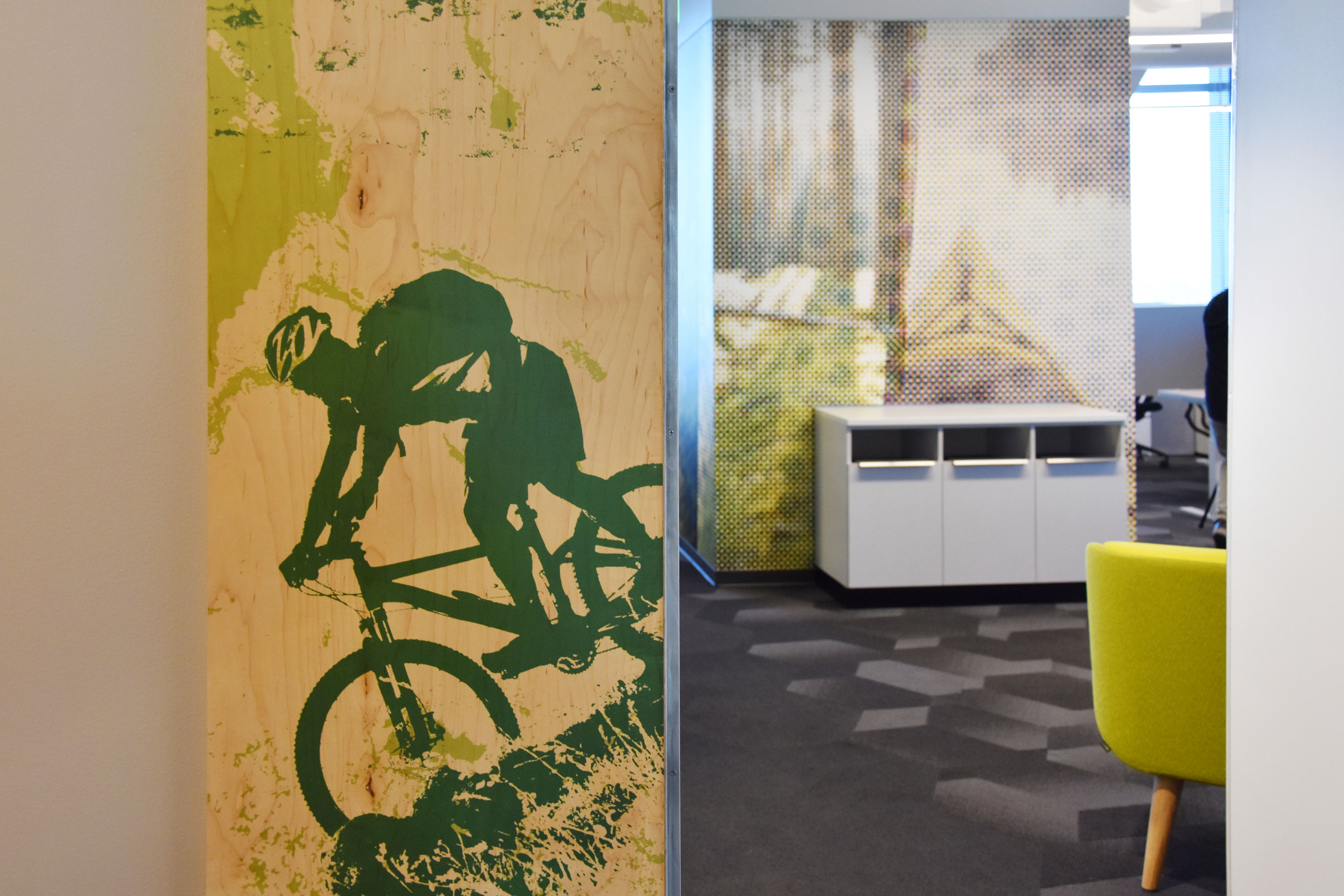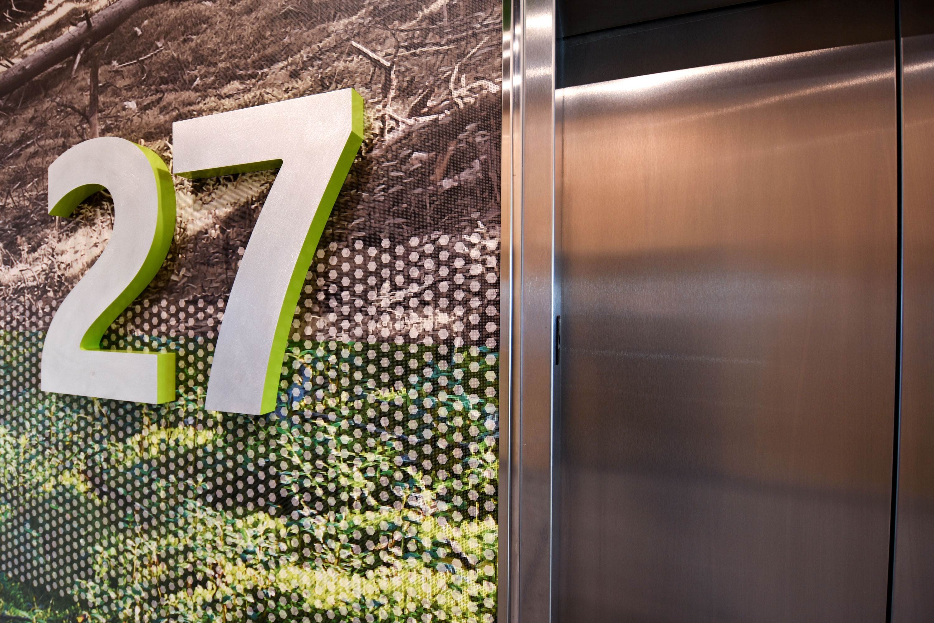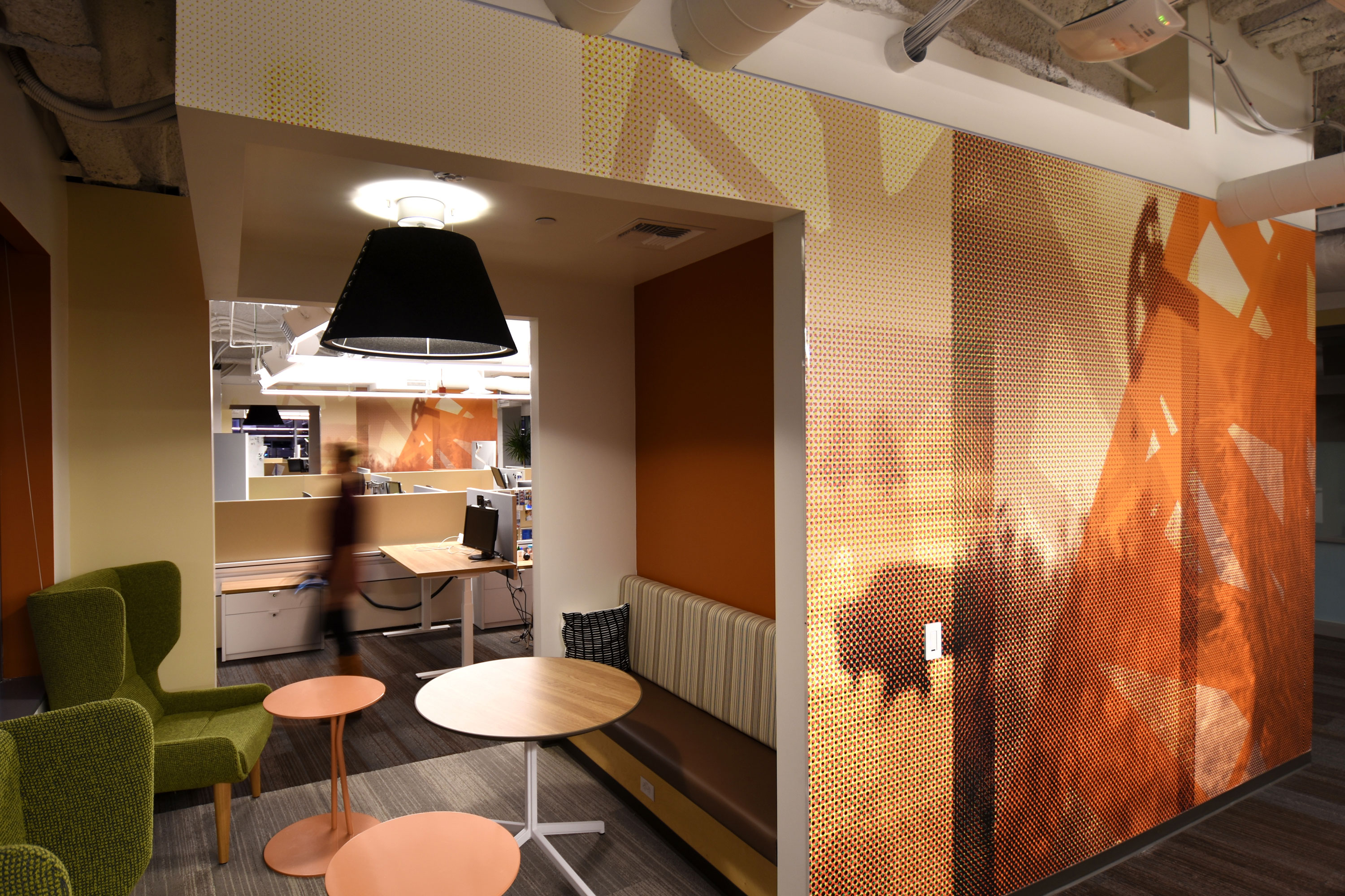 This office tenant improvement for a local tech company featured immersive wall graphics to complement new Interiors by Mithun. Designed in collaboration with Robert Murray, the interior design schemes and graphic content evoke geographical regions of the United States. The graphic package included conference room wall wraps, corner wayfinding displays and elevator lobby numbers with floor-to-ceiling wall murals. The graphics, ranging from abstract to iconic, provide character, interest, distinction, and continuity between the seven floors of the office spaces. An eco-friendly wall-covering material complemented sustainable carpet tiles and low-voc paints throughout all the floors.