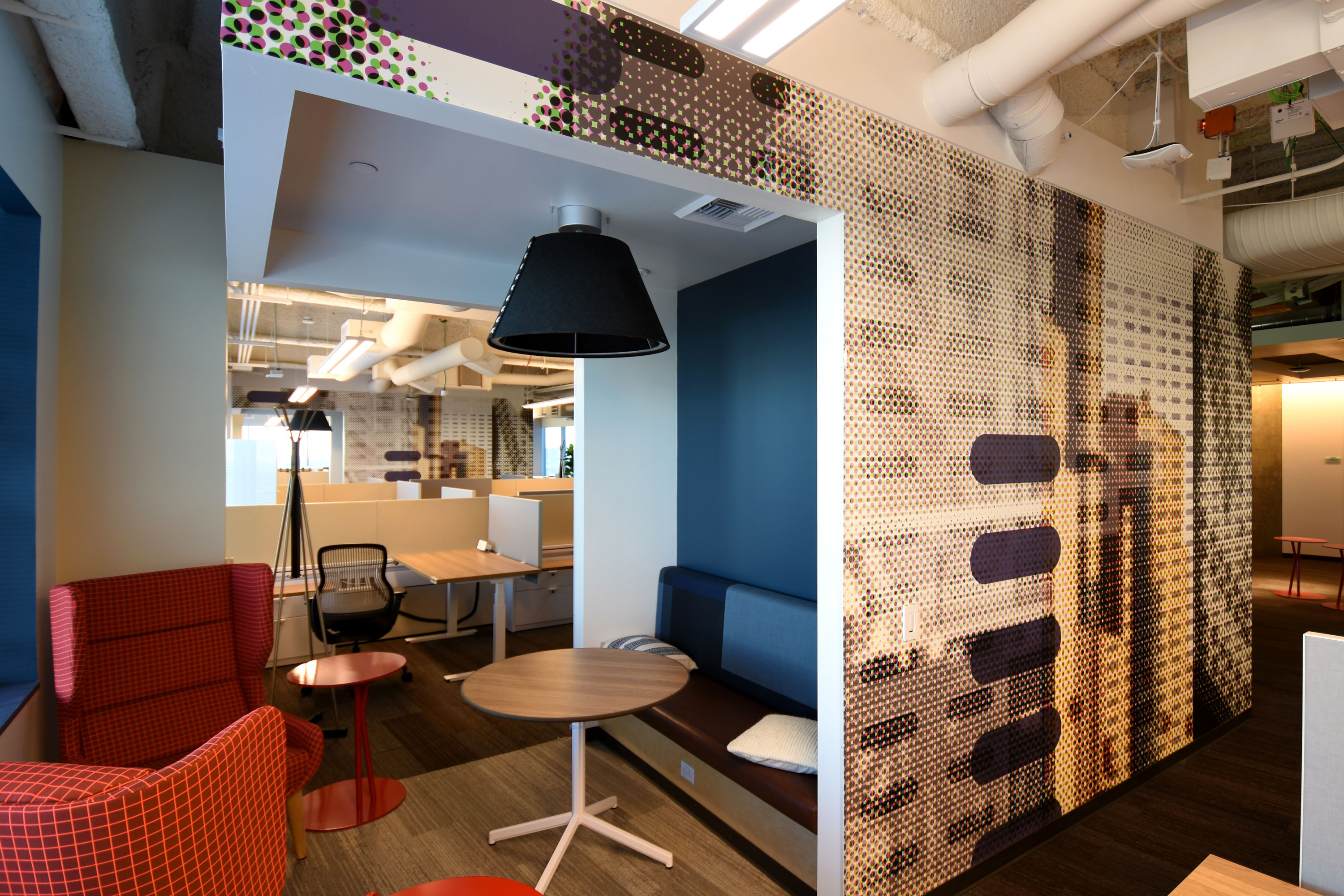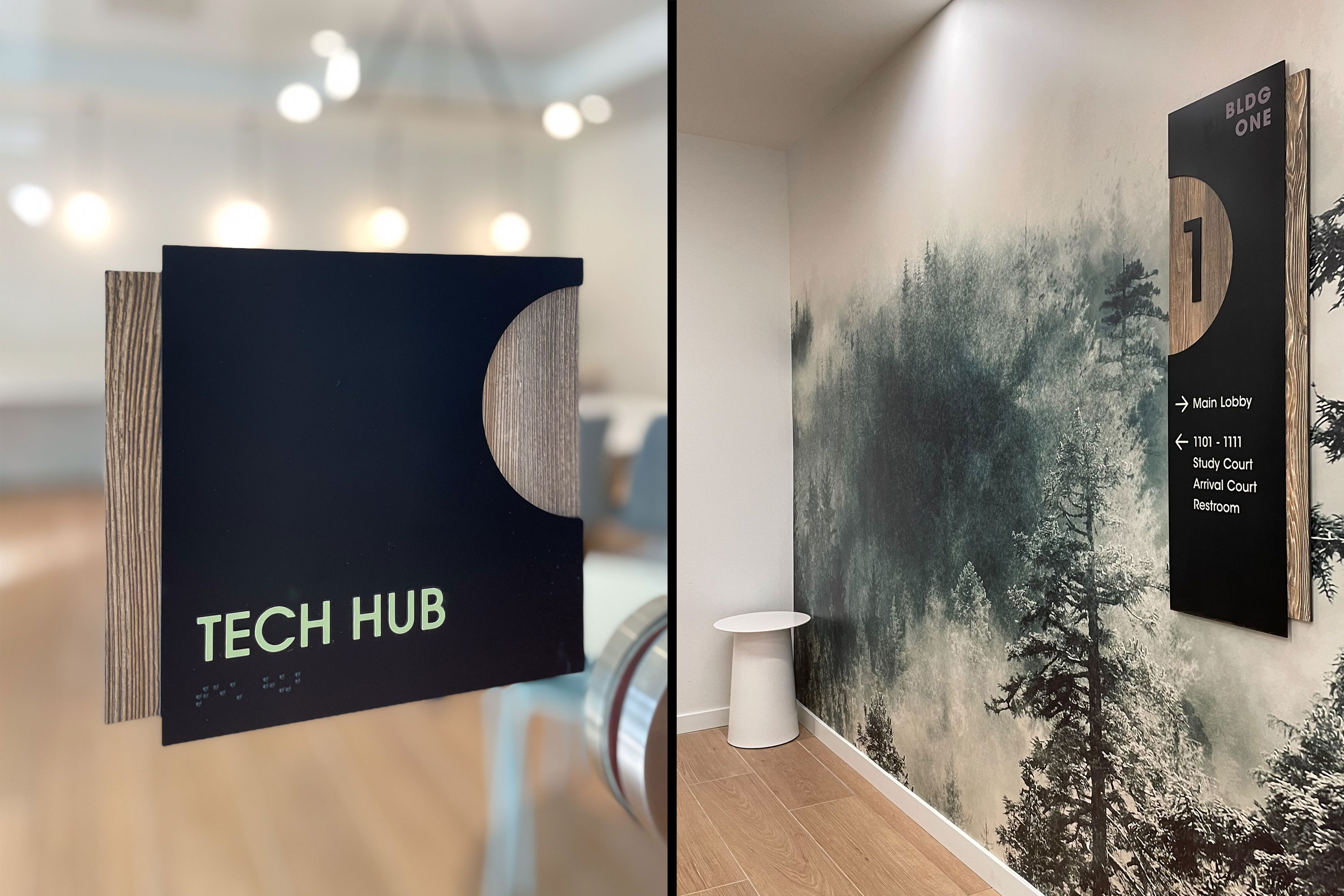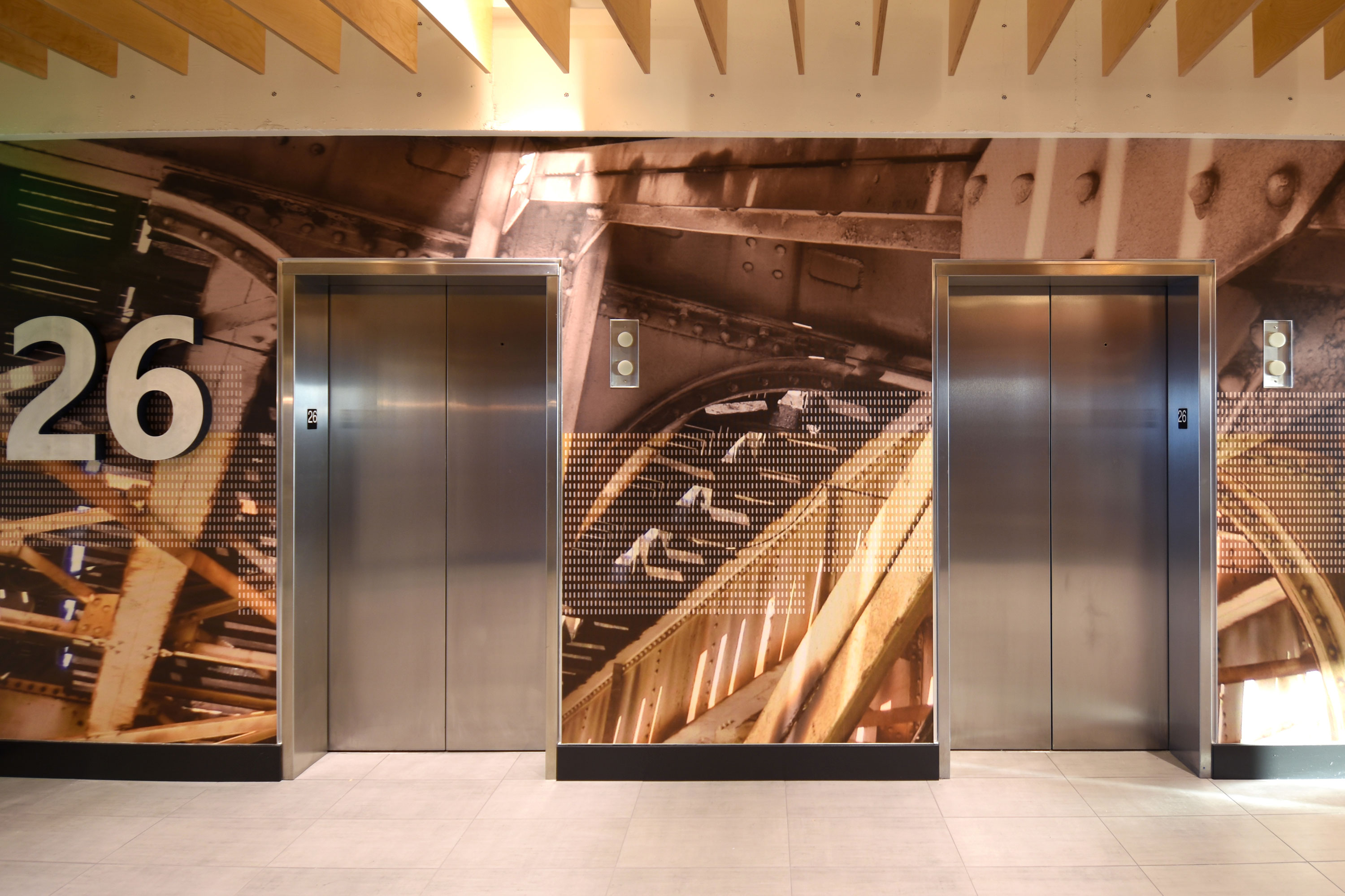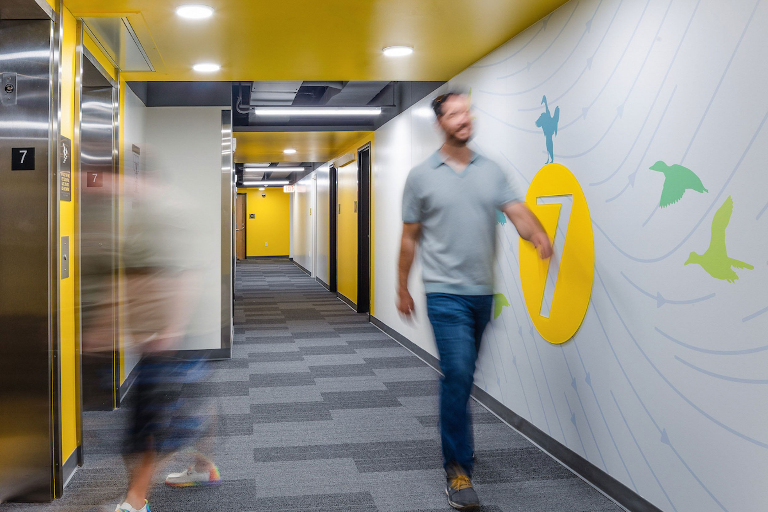 This office tenant improvement for a local tech company featured immersive wall graphics to complement new Interiors by Mithun. Designed in collaboration with Robert Murray, the interior design schemes and graphic content evoke geographical regions of the United States. The graphic package included conference room wall wraps, corner wayfinding displays and elevator lobby numbers with floor-to-ceiling wall murals. The graphics, ranging from abstract to iconic, provide character, interest, distinction, and continuity between the seven floors of the office spaces. An eco-friendly wall-covering material complemented sustainable carpet tiles and low-voc paints throughout all the floors.