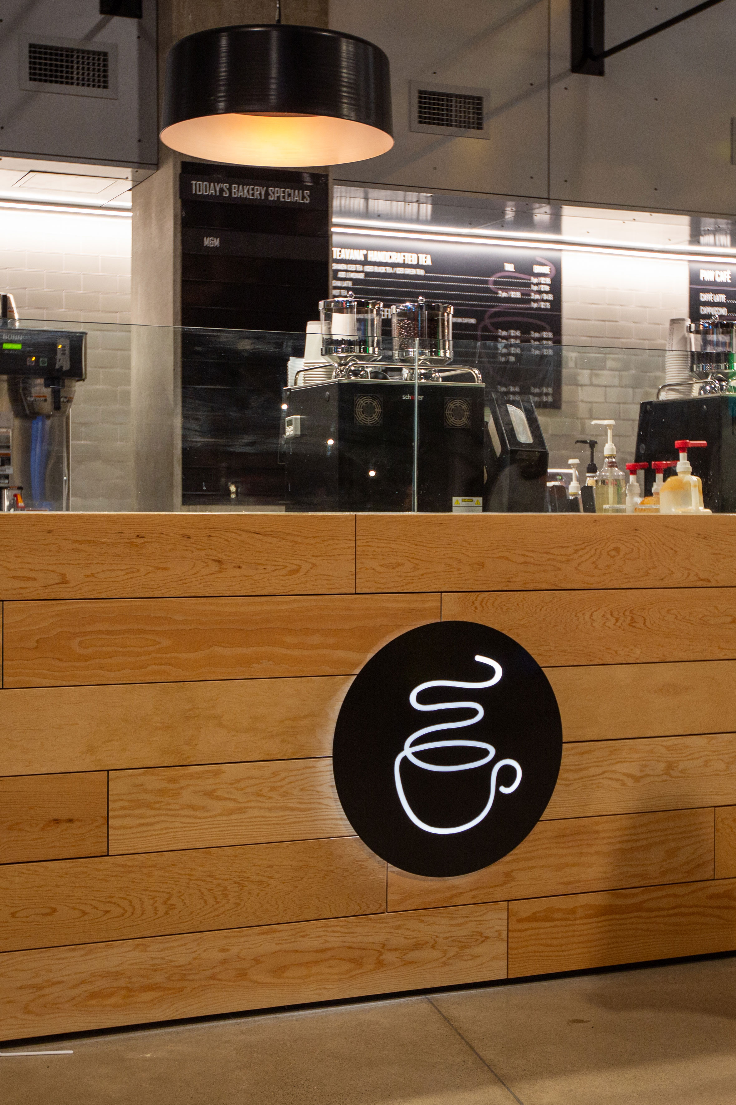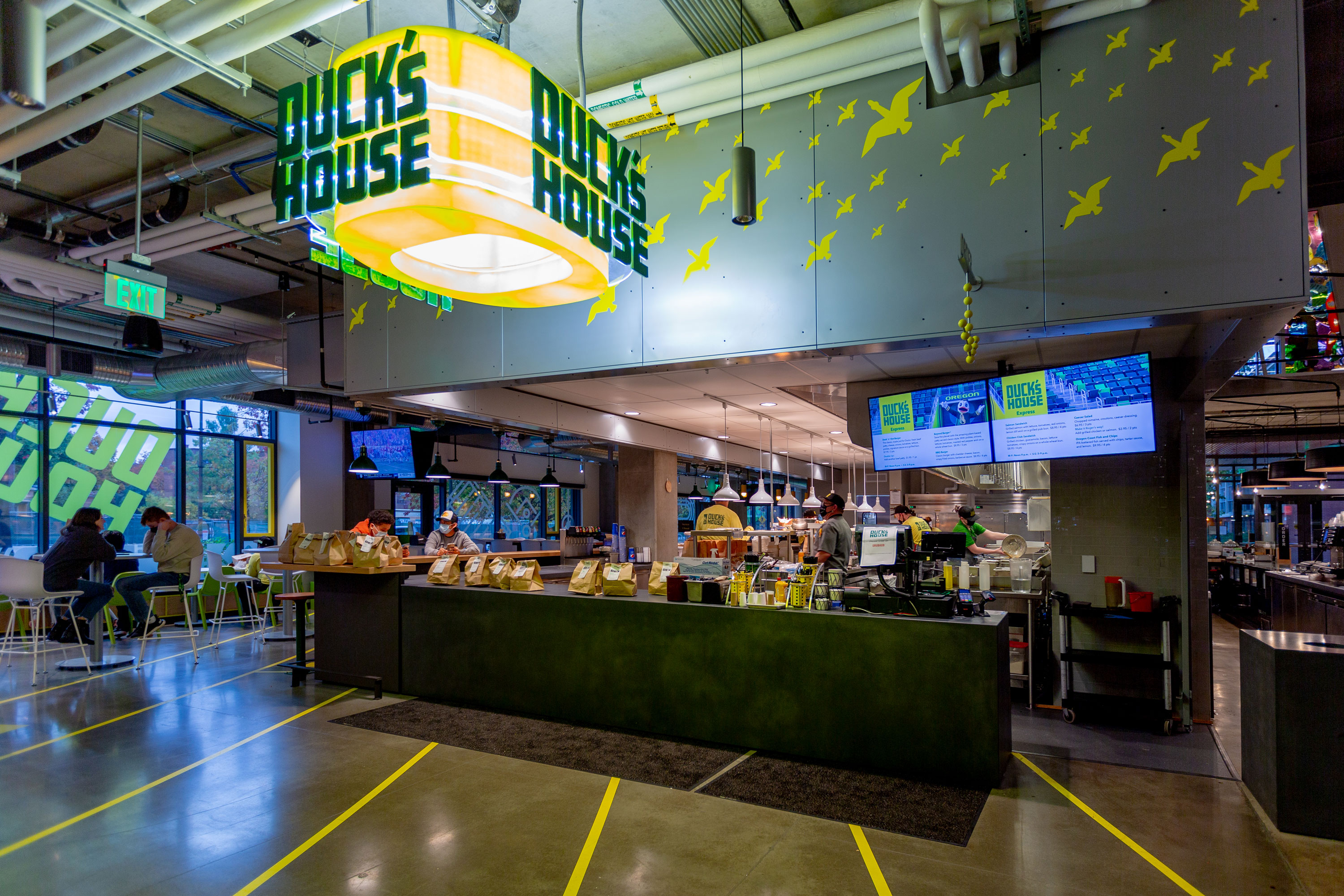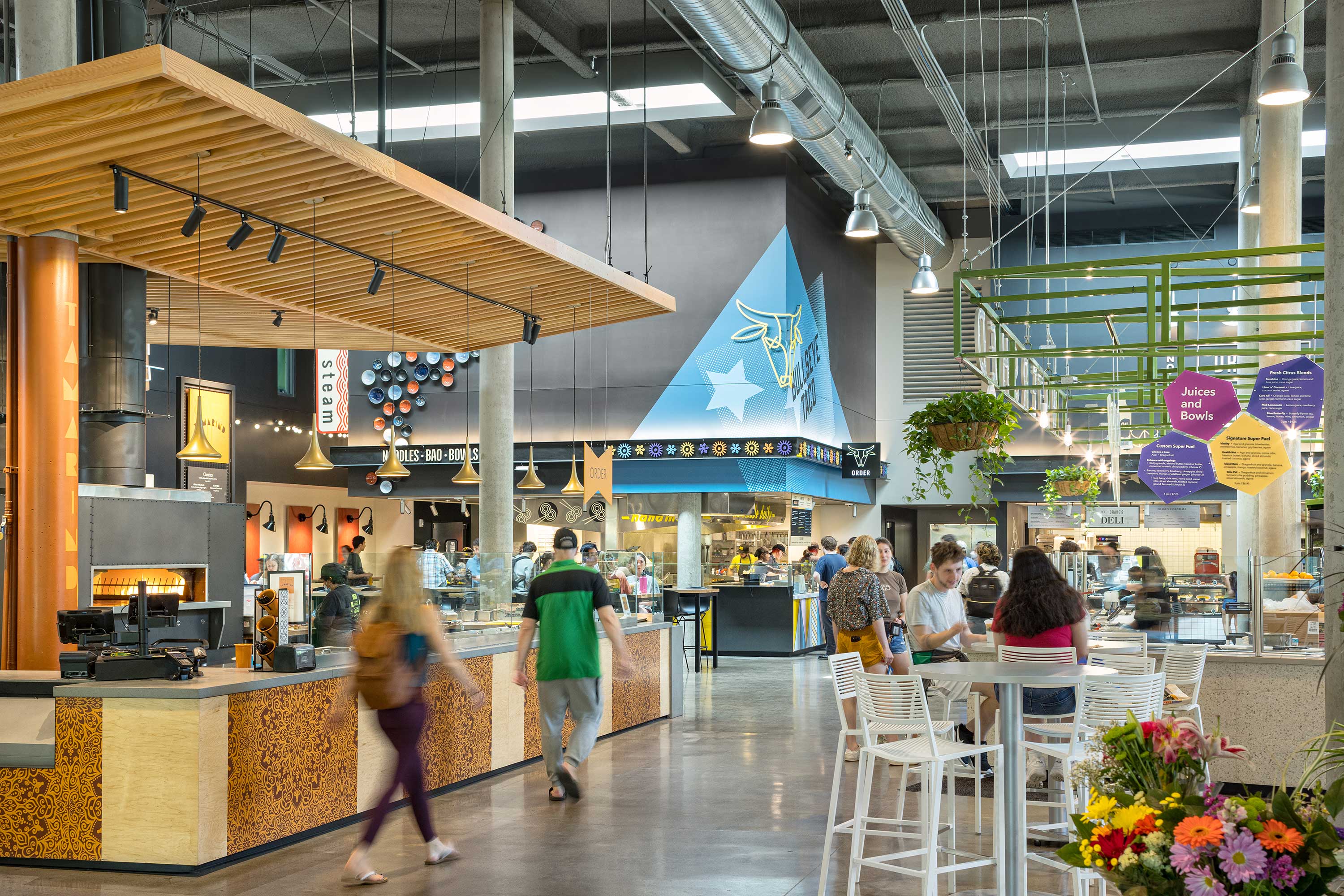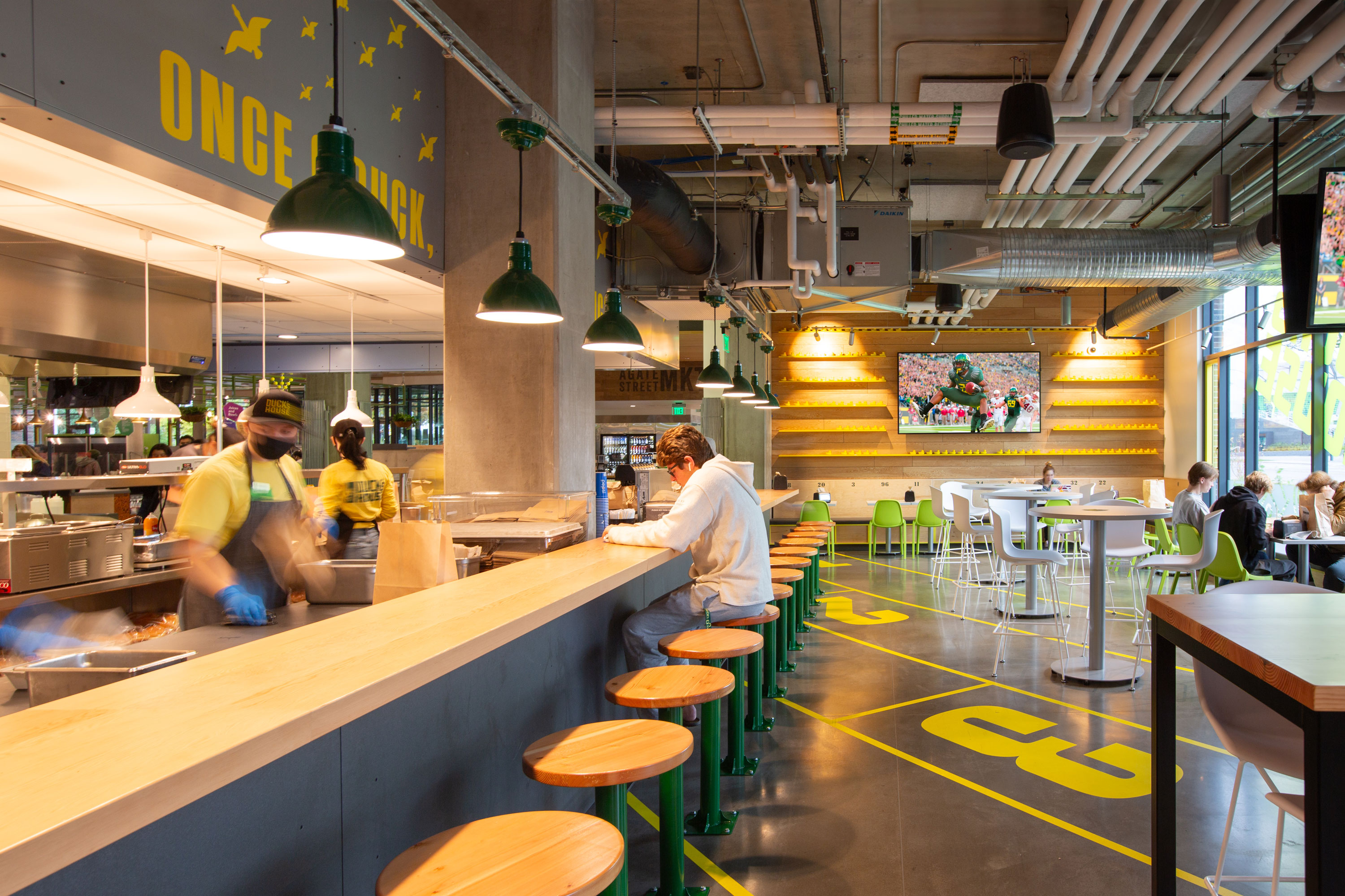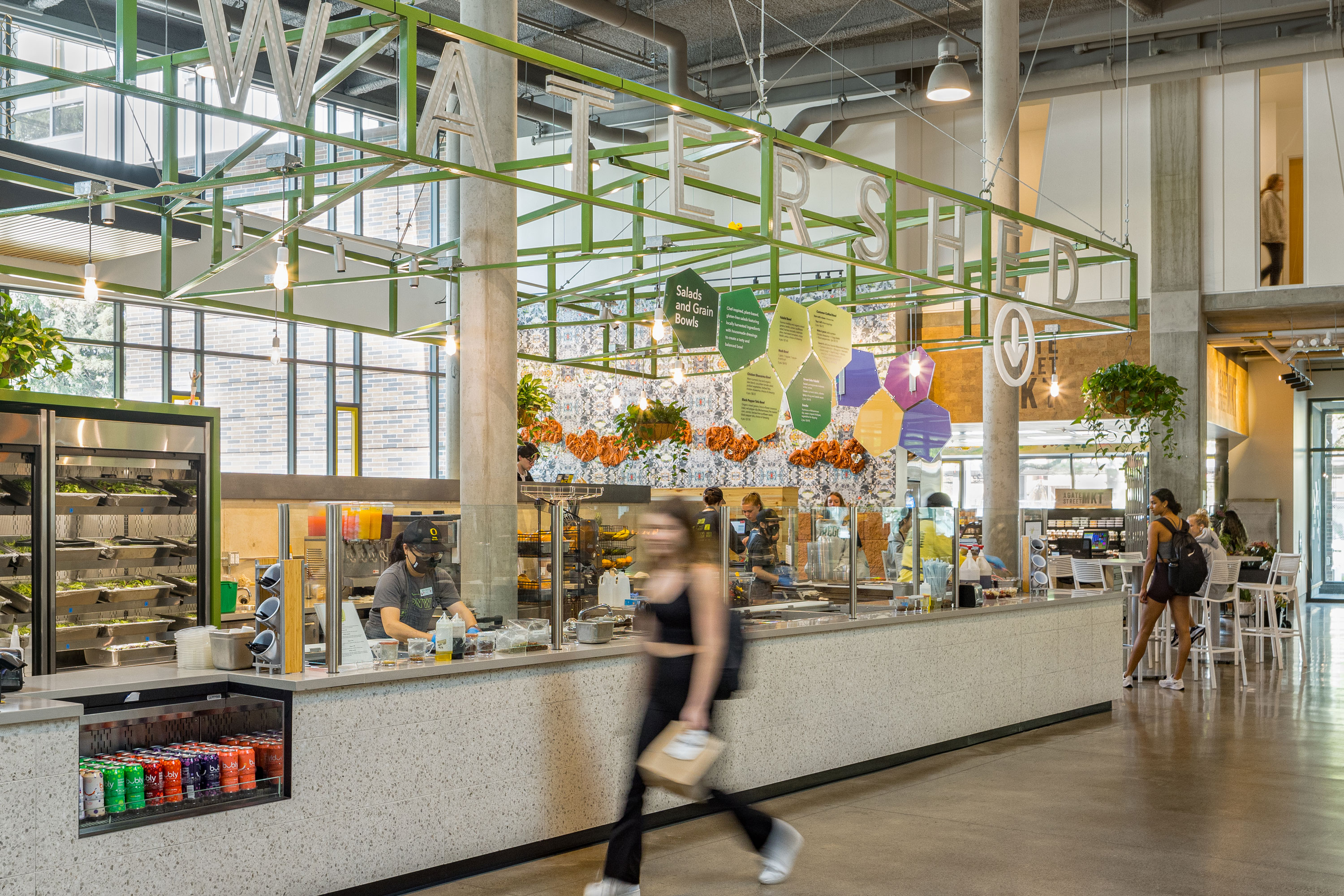 Adjacent to the Welcome Center, the PNW Market, the largest dining venue on campus, encompasses nine food venues, a range of seating areas, and multiple art installations from local artists. Open, layered, and well-lit, the eclectic food venues range from bao and noodles, a deli counter, and biryani to wood-fired pizza, and pub-style fare, Duck’s House. Ingredients are locally sourced from more than 25 farms in the surrounding Willamette Valley. Each venue was designed with a unique identity and menu, but collectively the impression embodies a unified spirit and the area’s rich history of handcrafted and locally made food.