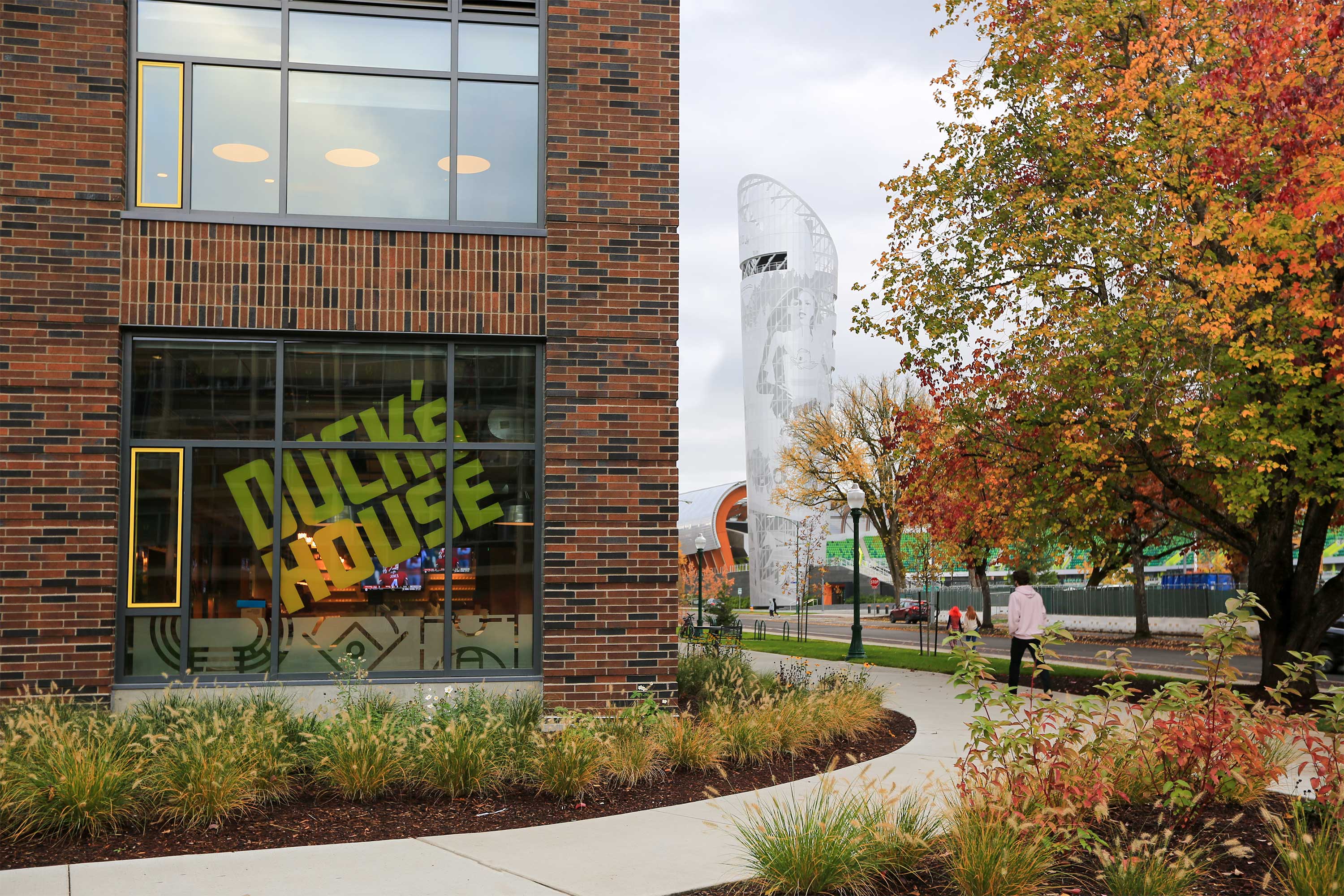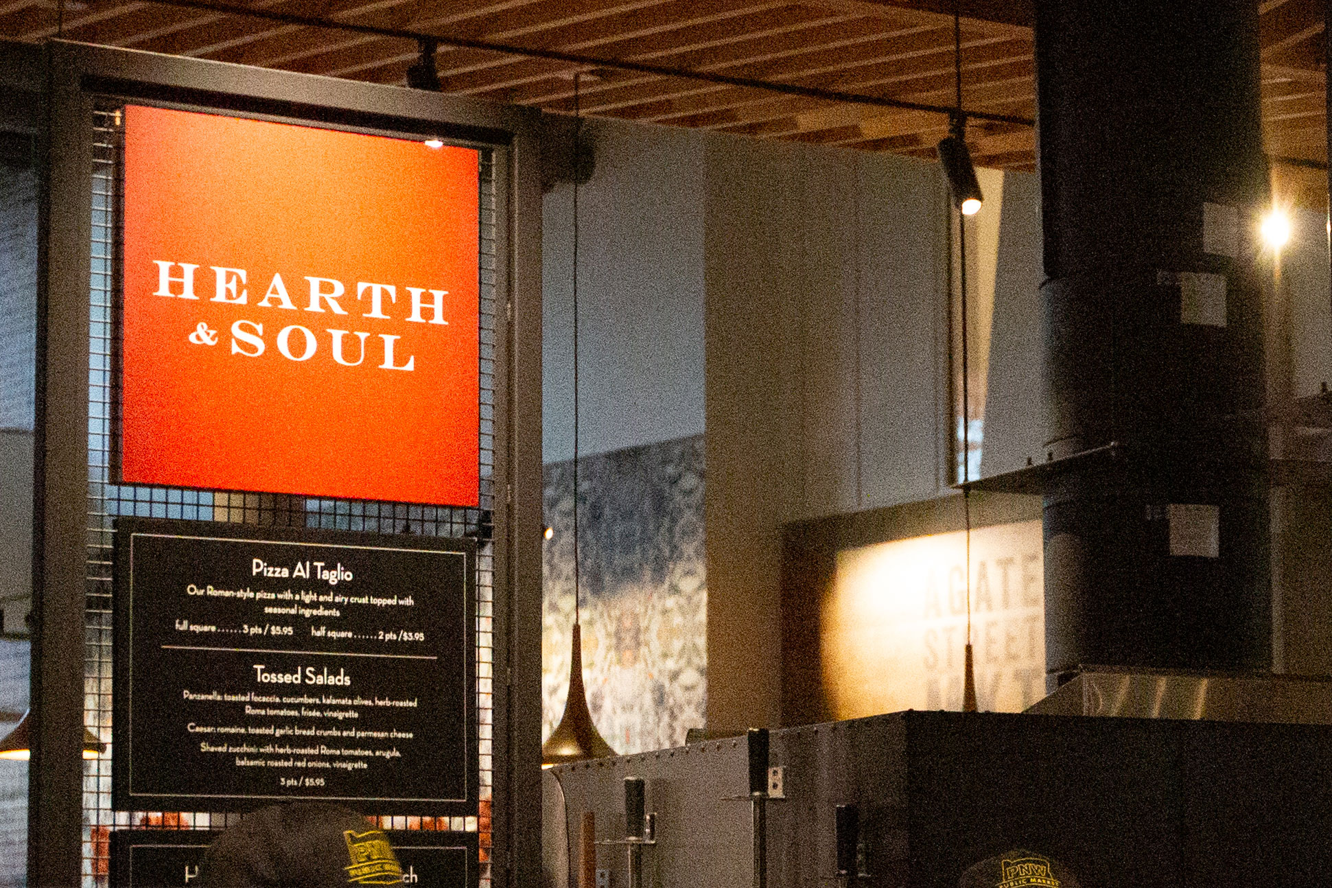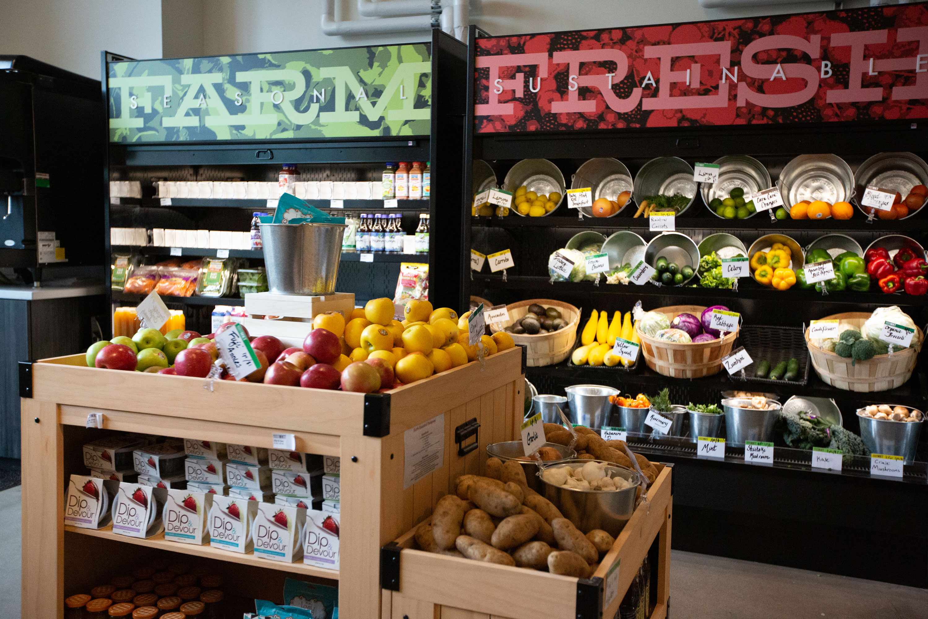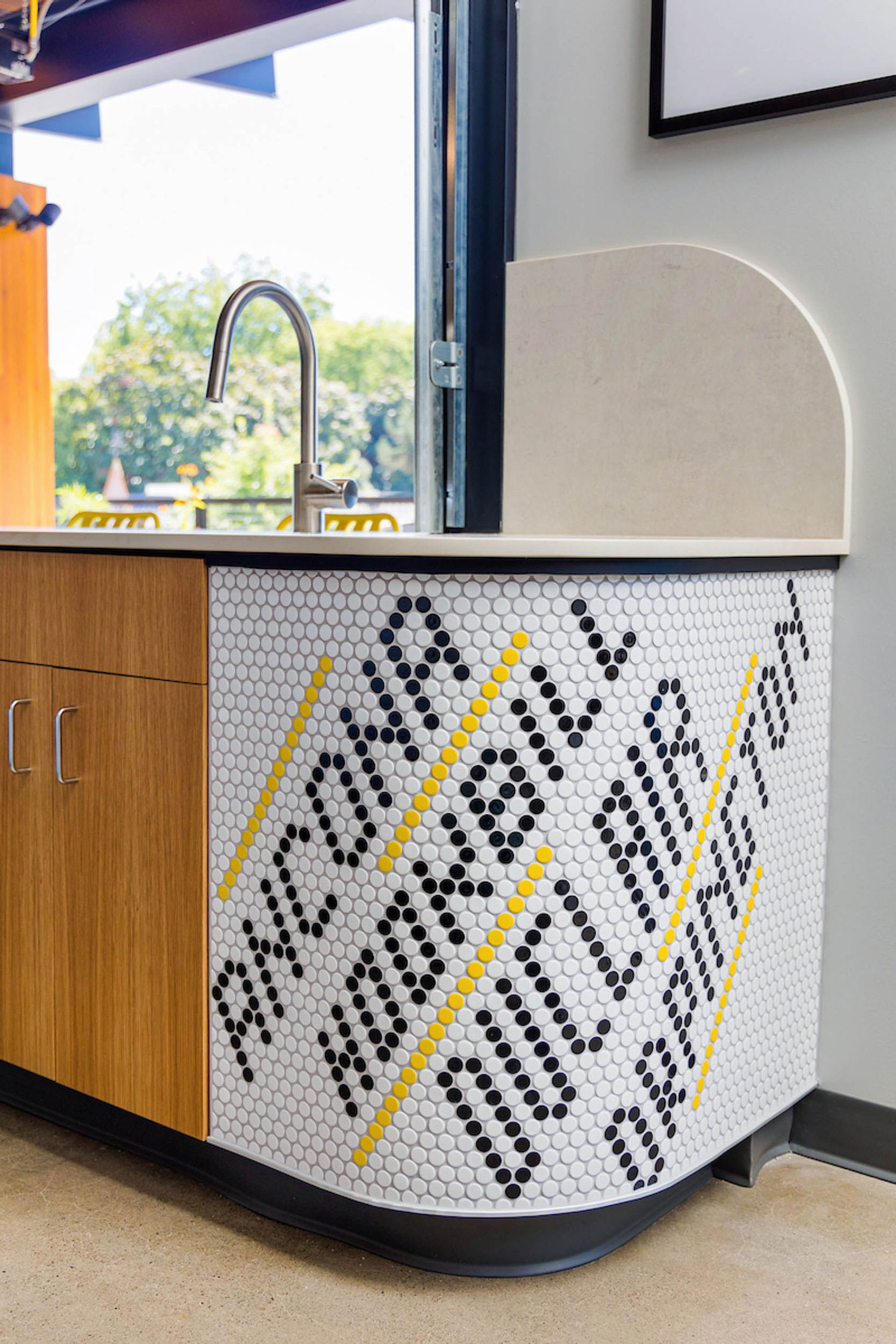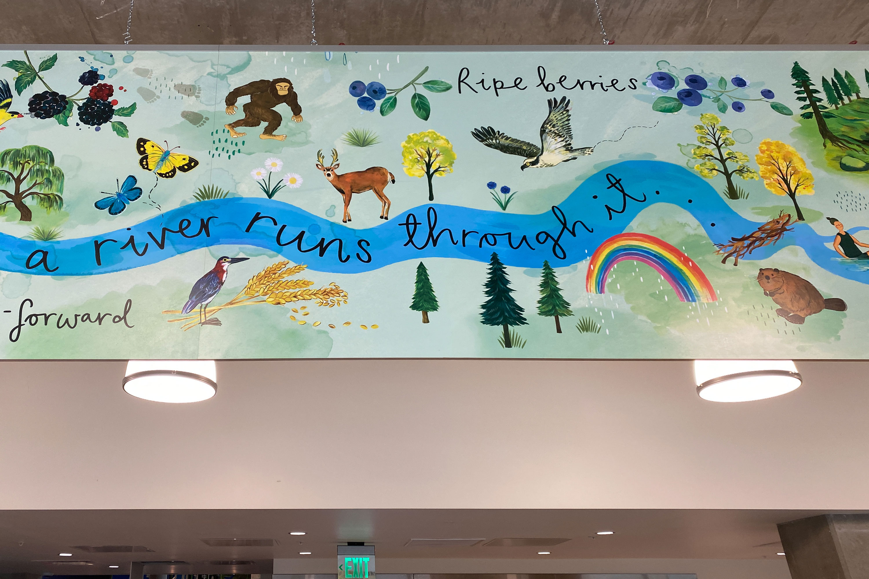 Adjacent to the Welcome Center, the PNW Market, the largest dining venue on campus, encompasses nine food venues, a range of seating areas, and multiple art installations from local artists. Open, layered, and well-lit, the eclectic food venues range from bao and noodles, a deli counter, and biryani to wood-fired pizza, and pub-style fare, Duck’s House. Ingredients are locally sourced from more than 25 farms in the surrounding Willamette Valley. Each venue was designed with a unique identity and menu, but collectively the impression embodies a unified spirit and the area’s rich history of handcrafted and locally made food.