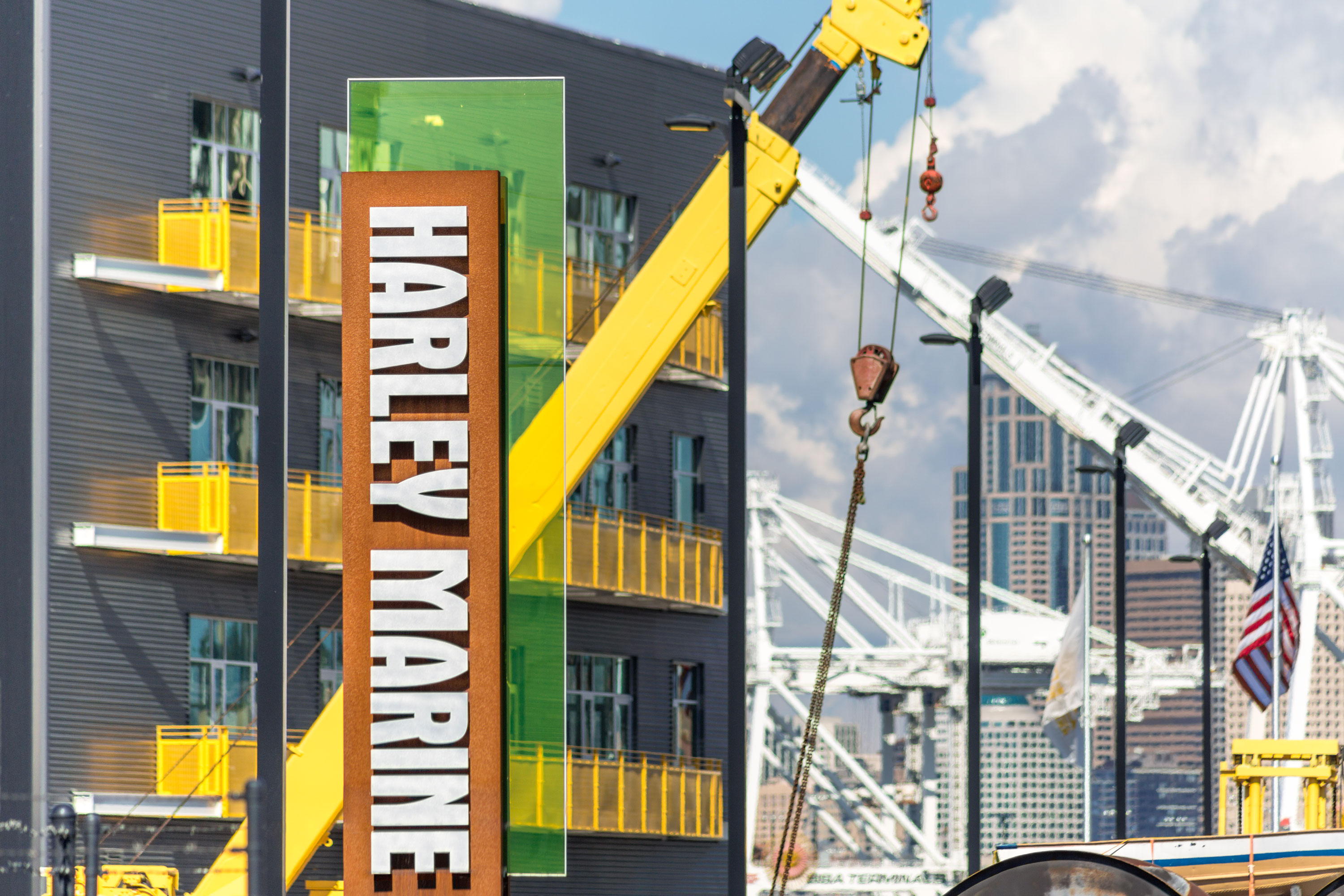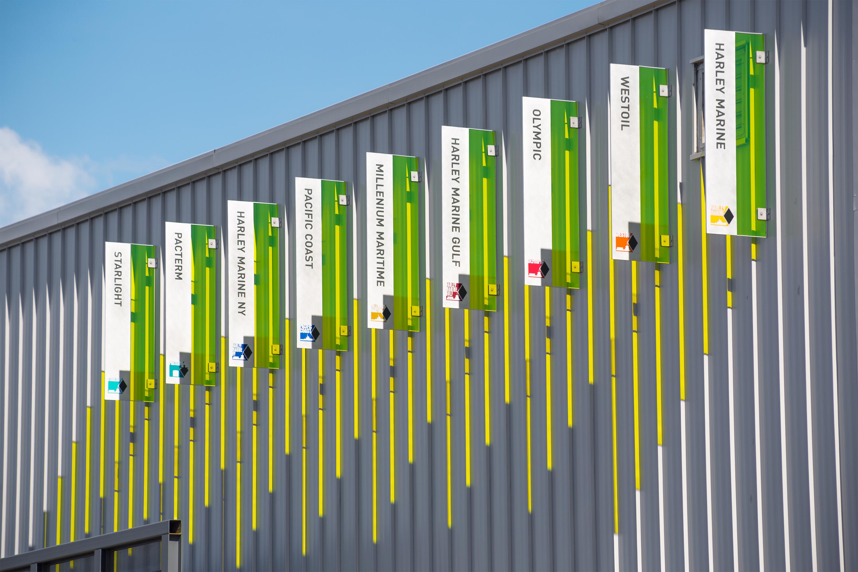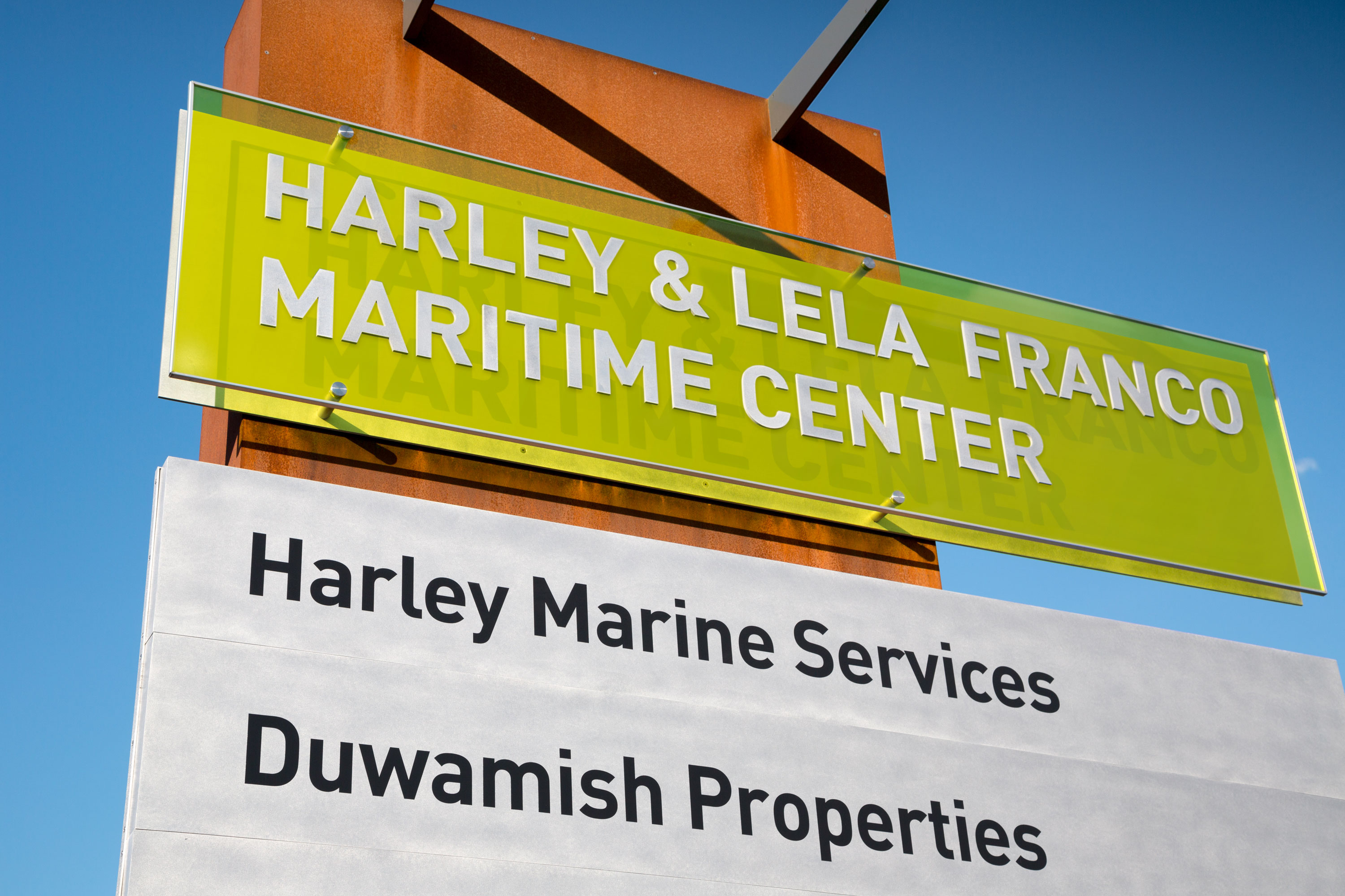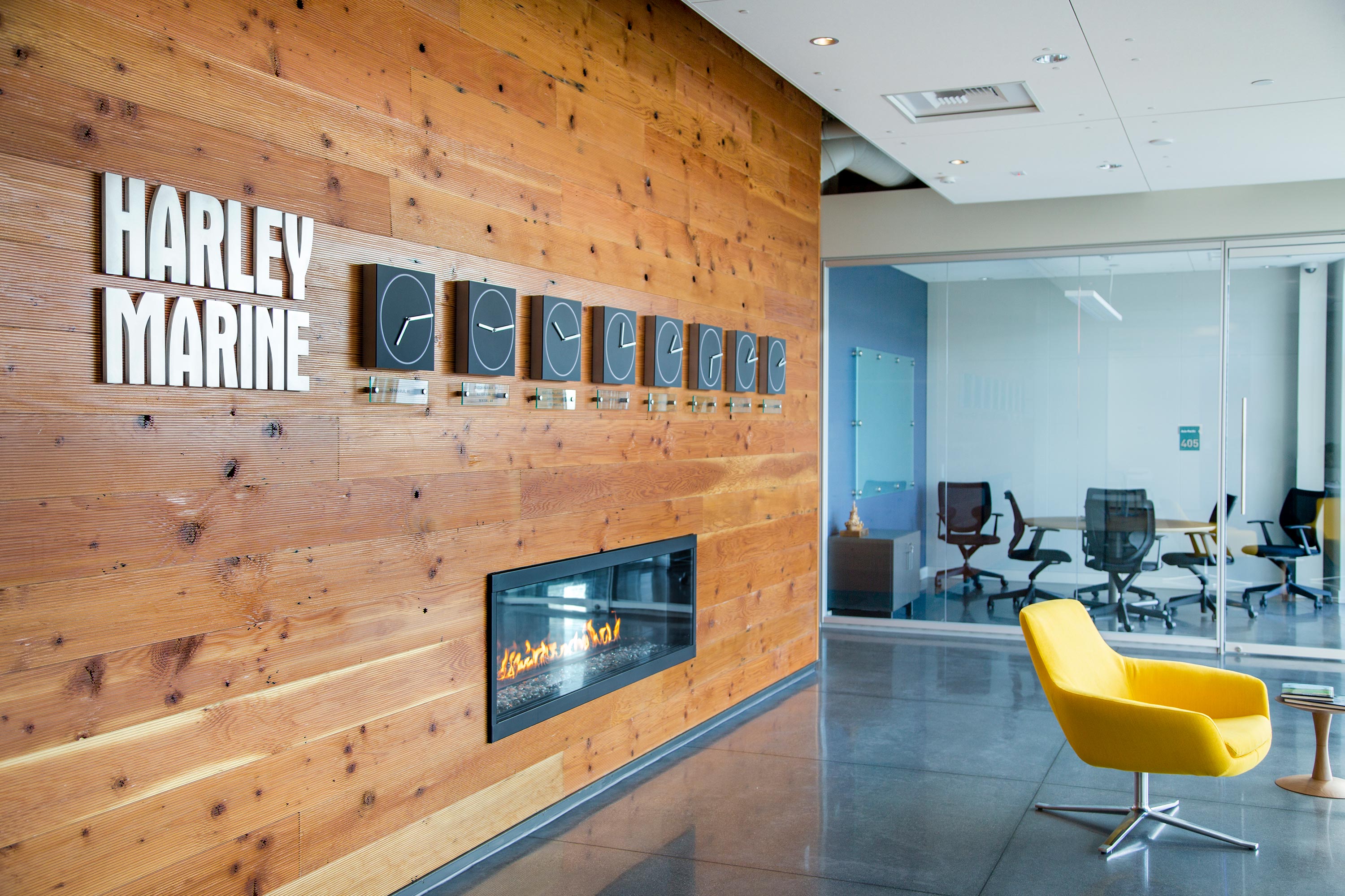 Environmental graphics highlight the Maritime Center inside and out. On approach to the site, Corten steel monuments and building entrance signage extend the Mithun building design and materials palette. Along the outside west wall of the shop, Harley Marine Services companies are displayed proudly on glass and metal banners. Inside, the company history and locations are featured on a world map installation across from the main conference room overlooking the Duwamish. In the lobby, a time zone display featuring illuminated clocks and company logo demonstrate operations are 24/7 in the maritime business. Throughout the office interior, conference rooms and office signage draw inspiration from the HMS identity and nautical themes.