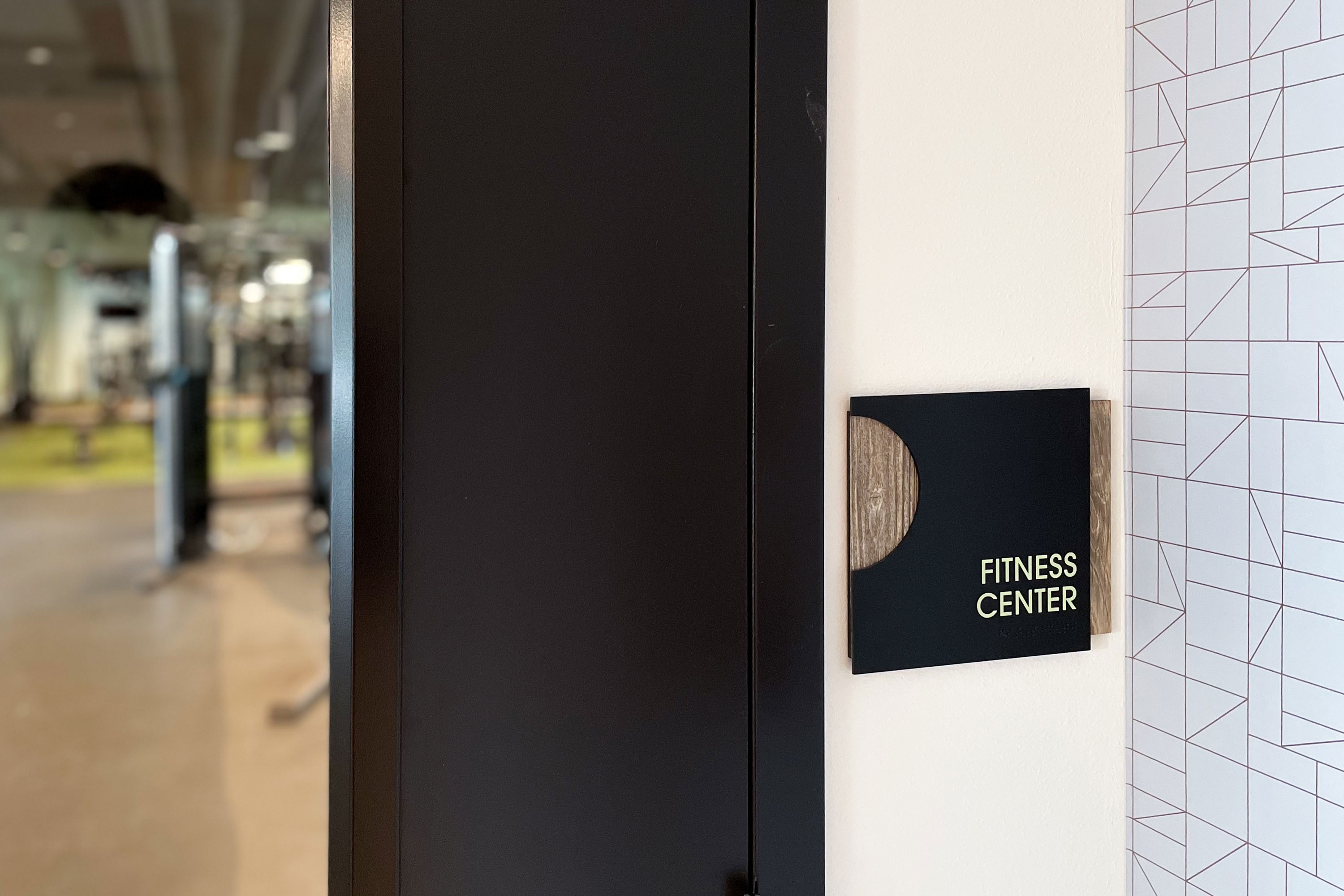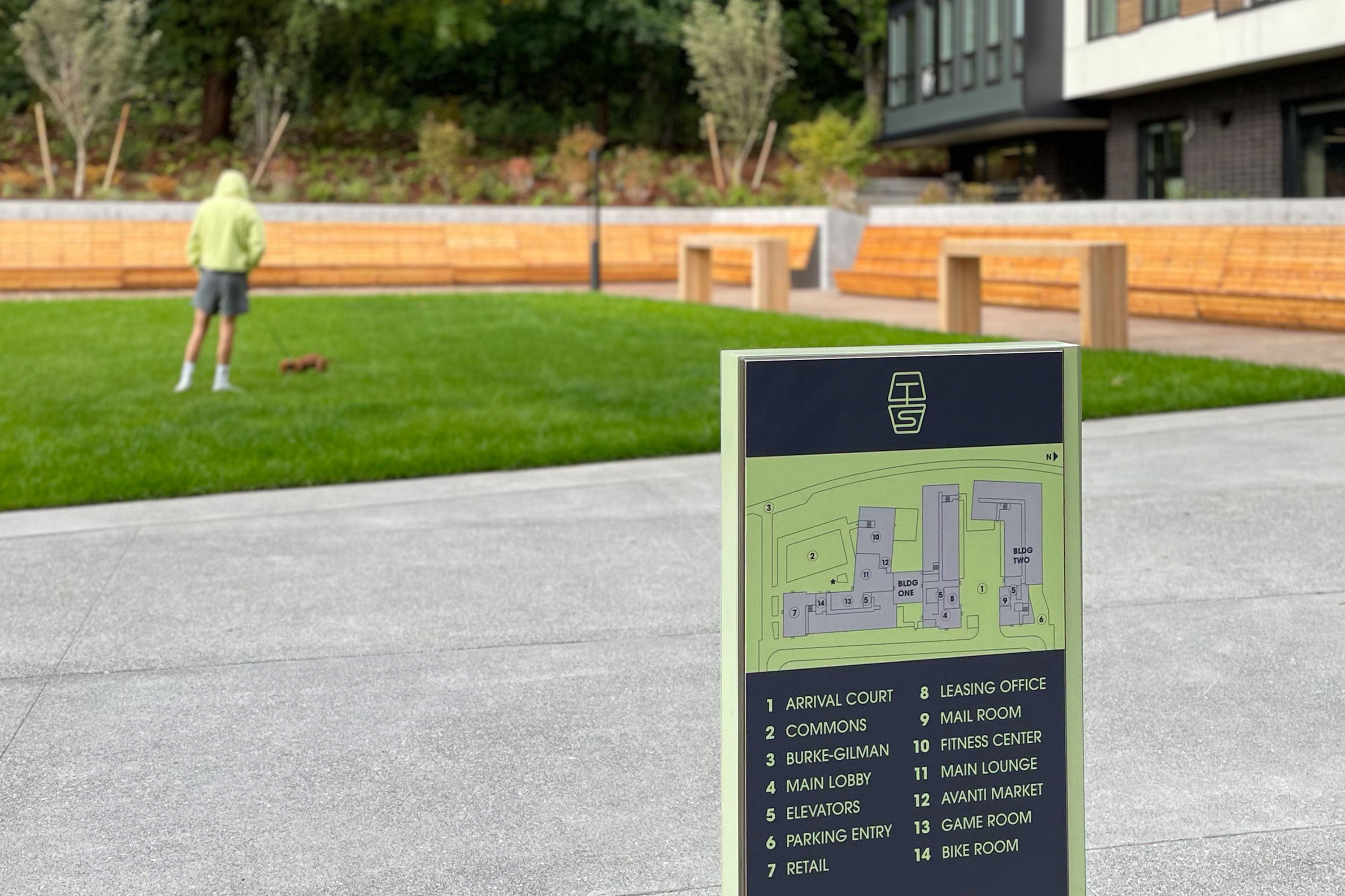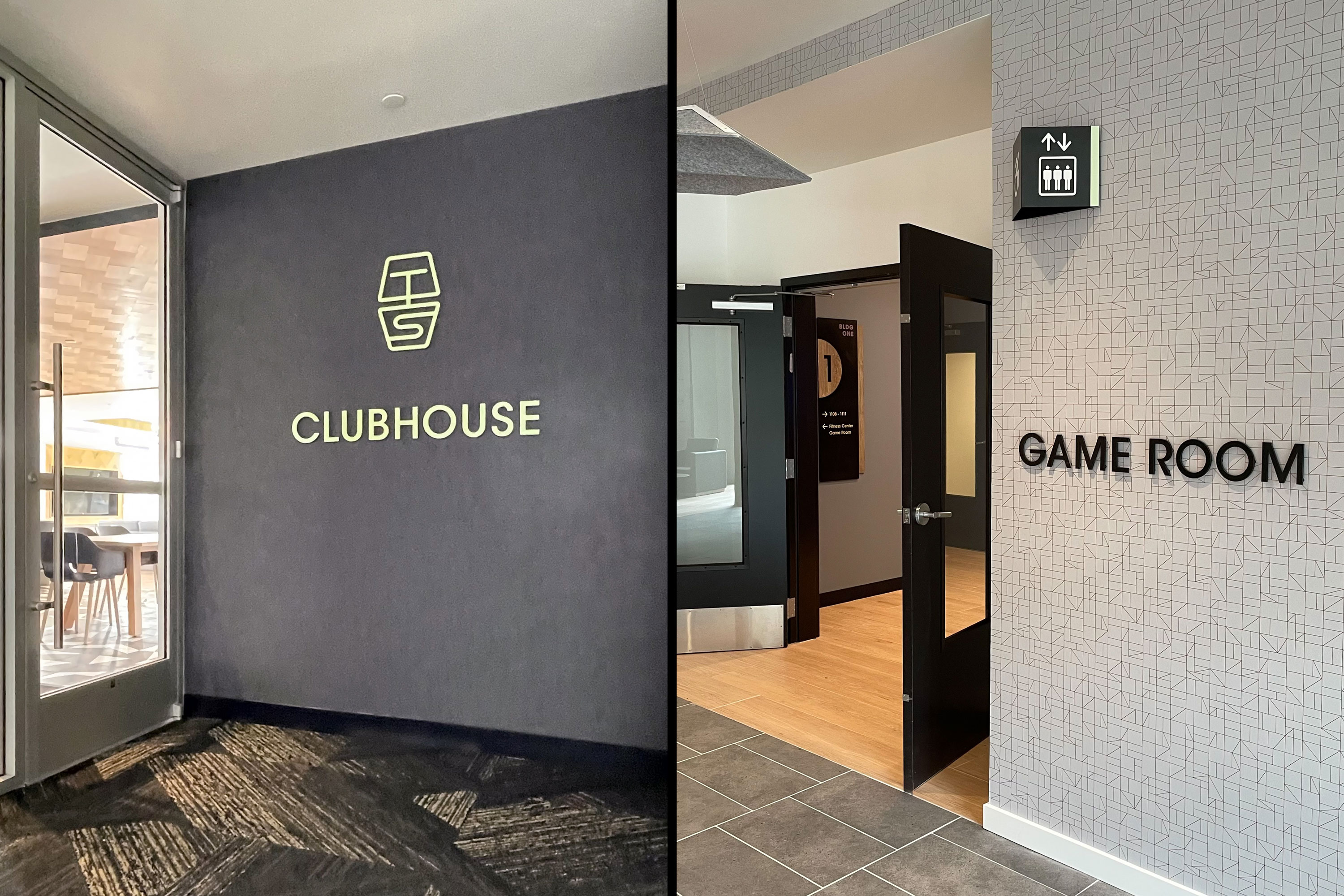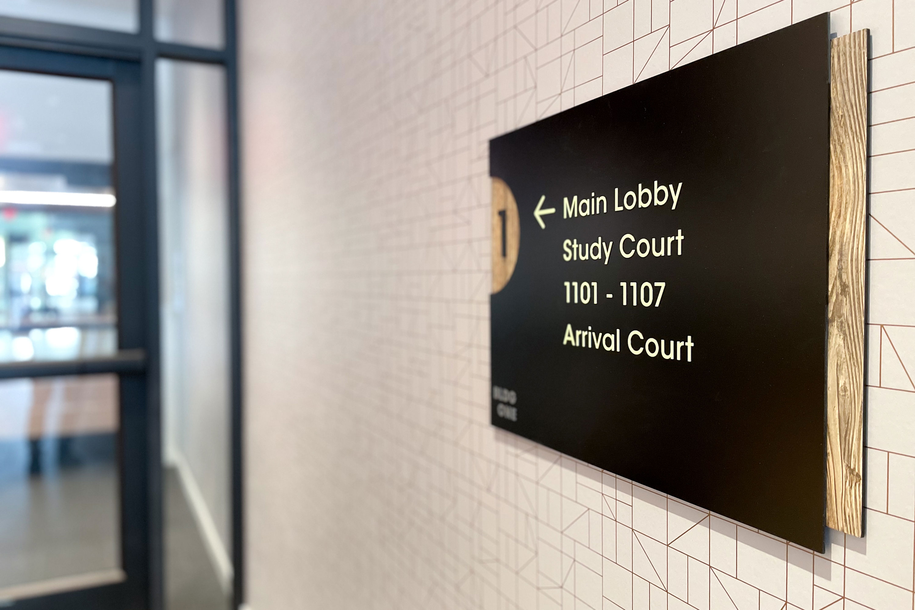 Two seven story residential blocks, with plentiful common areas and green spaces, evoke the building identity which draws inspiration from the active lifestyle along the Trail. Wayfinding signage is integrated into the surrounding landscape at the Arrival Court and Trailside Commons, complemented by naturalistic wayfinding and room signage on the interior that invites the outdoors in. The plethora of common areas have a variety of sign types, from the welcome lobby and the clubhouse to the commons and dog run. Altogether, the outdoorsy palette coupled with the sleek urban city vibe proves student living does not need to be garish or unrefined.