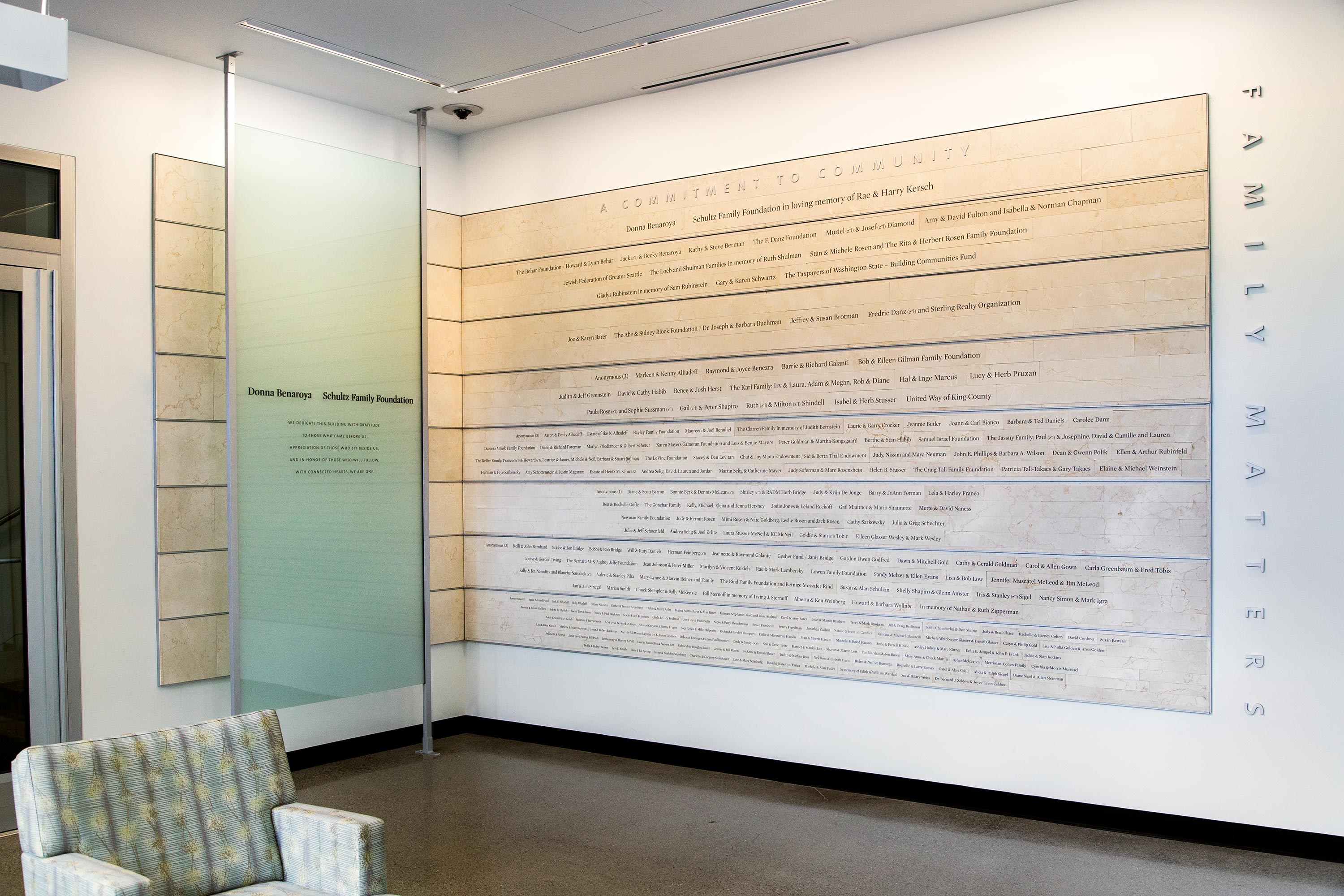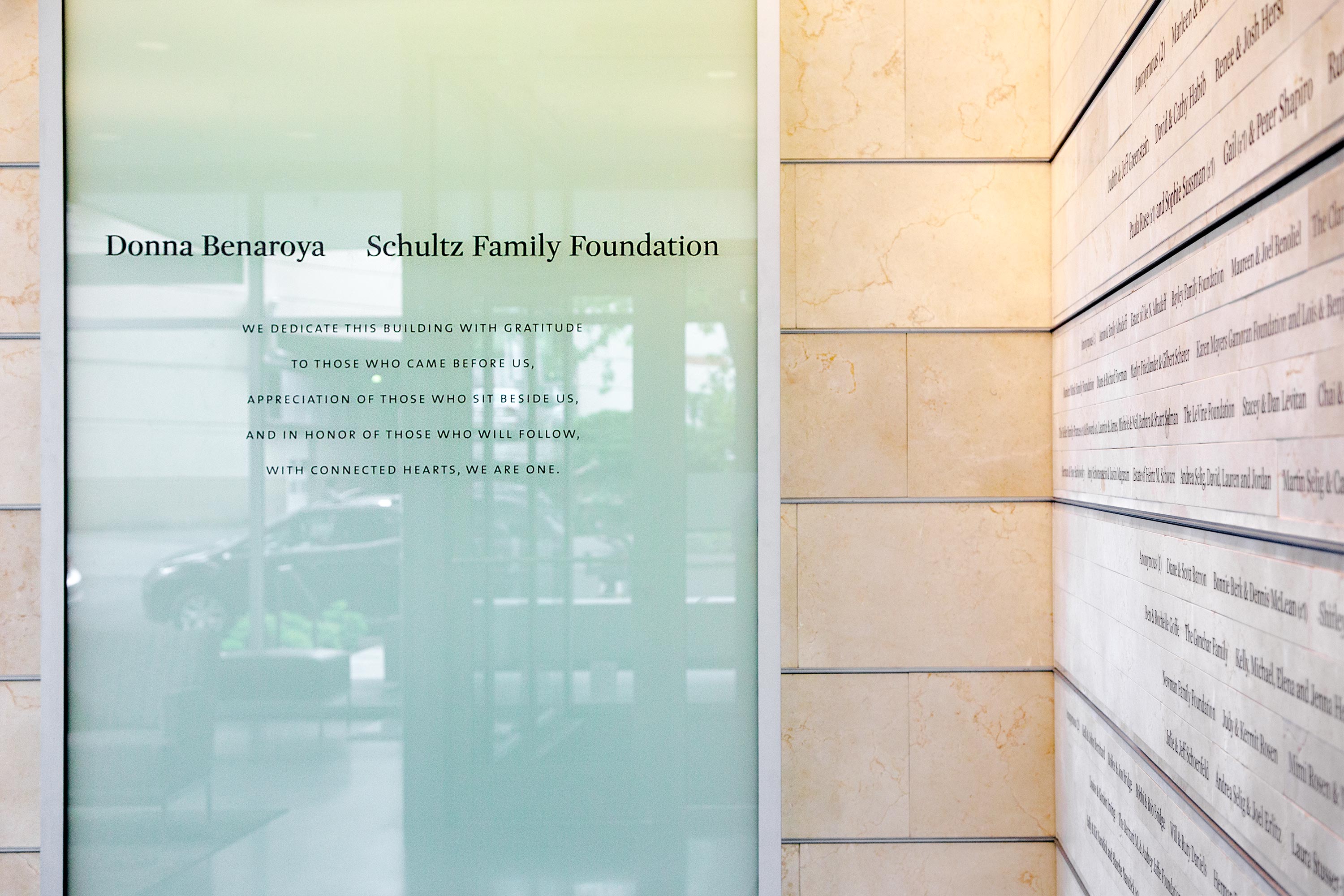 Over 200 donors made this building possible with many generous gifts to the JFS Family Matters Campaign. The names of these donors have been inscribed on a permanent donor wall and spaces throughout the new building in heartfelt appreciation and recognition of their unique commitment to our local community. The donor names inscribed on Jerusalem limestone affirms a lasting commitment that “we are all in this together” and is consistent with the Jewish Family Service mandate to treat people with dignity and respect in times of need by providing strong responsive programs and services in a welcoming and accessible new facility. The building designed by Weinstein AU draws inspiration from these words by creating an entry passage of inviting design forms leading into the lobby and up through the office and meeting spaces of the building. The timeless and respectful materials complement the thoughtful architecture and traditions of a modern Jewish agency.