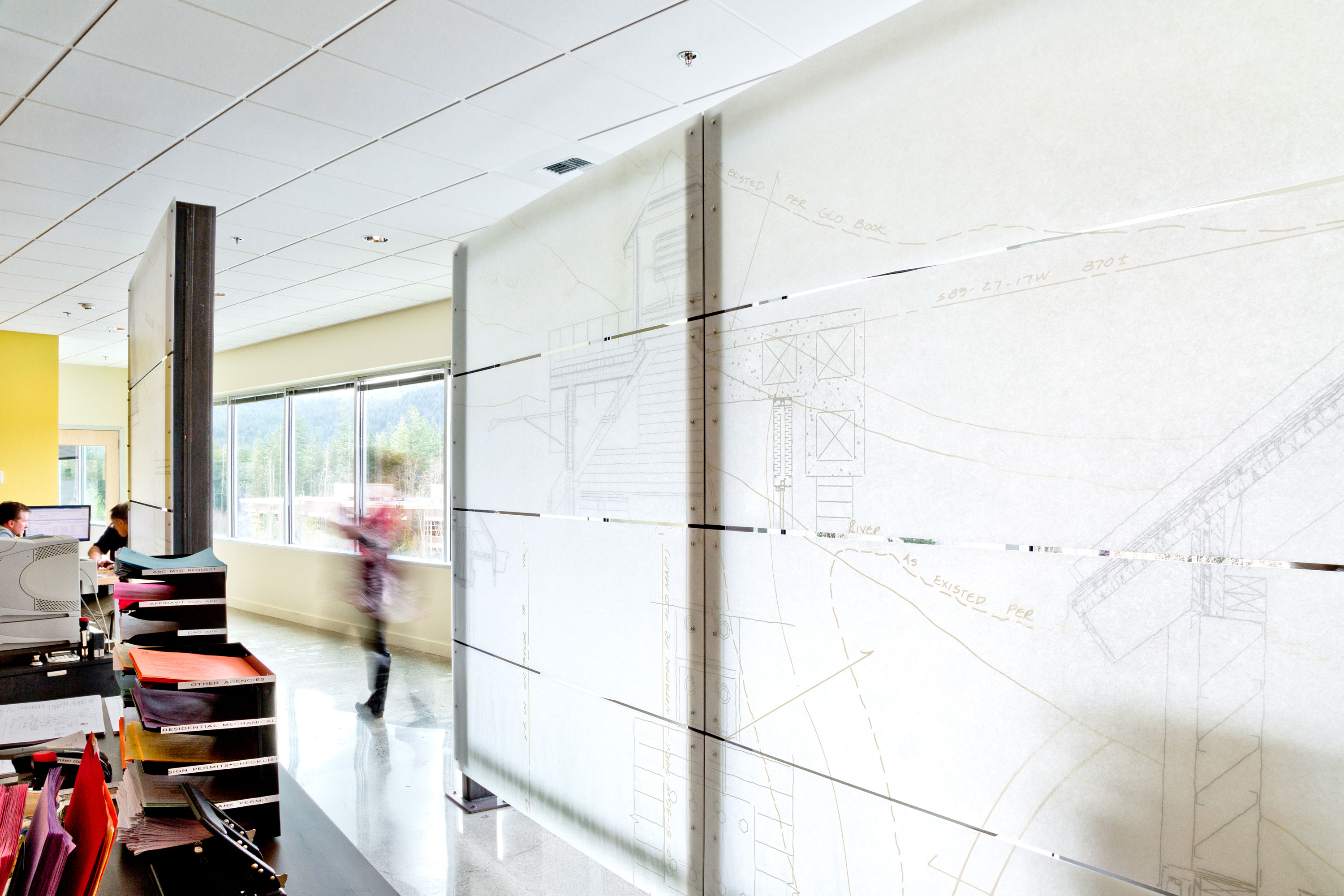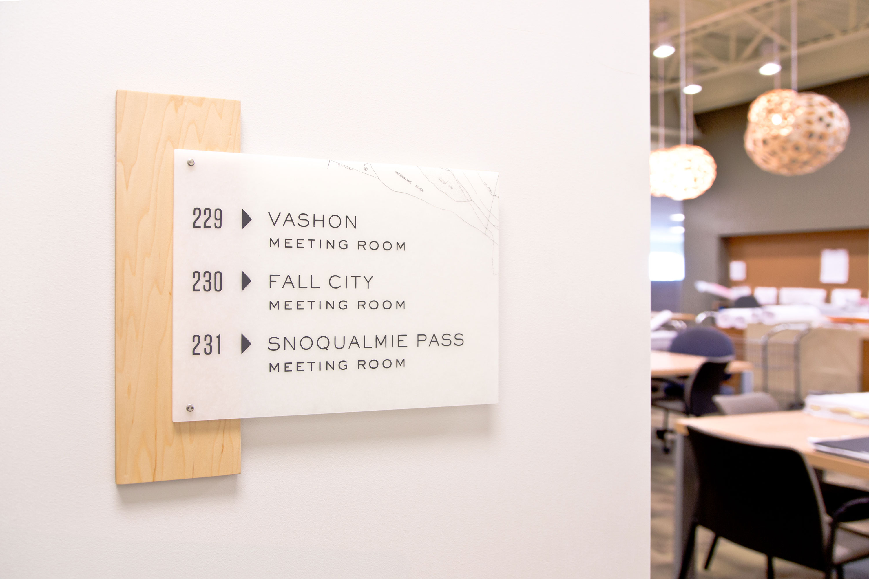 At the heart of the project, the main welcome desk delivers on the Mithun design theme of transparency and honest materials in the form of a multi-panel translucent screen made of Lumasite. The surface of the screen was a perfect opportunity to apply an atmospheric graphic depiction of land use and building motifs. With a focus on rural properties and construction plans, the composition highlights plats and building parts with an emphasis on sustainability in the form silhouetted reeds at the base of the wall. In addition, the office entry identity and lobby counter signs are built from simple unadorned building materials which complement each of the conference rooms that are named after nearby locales featuring plat diagrams on simple Lumasite panels.