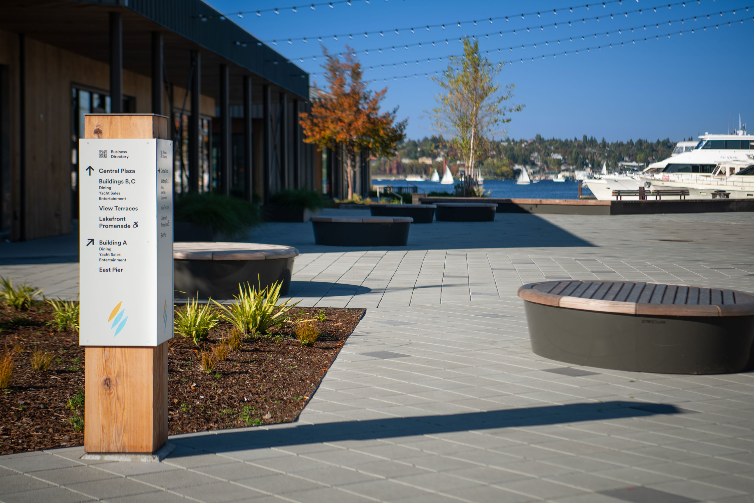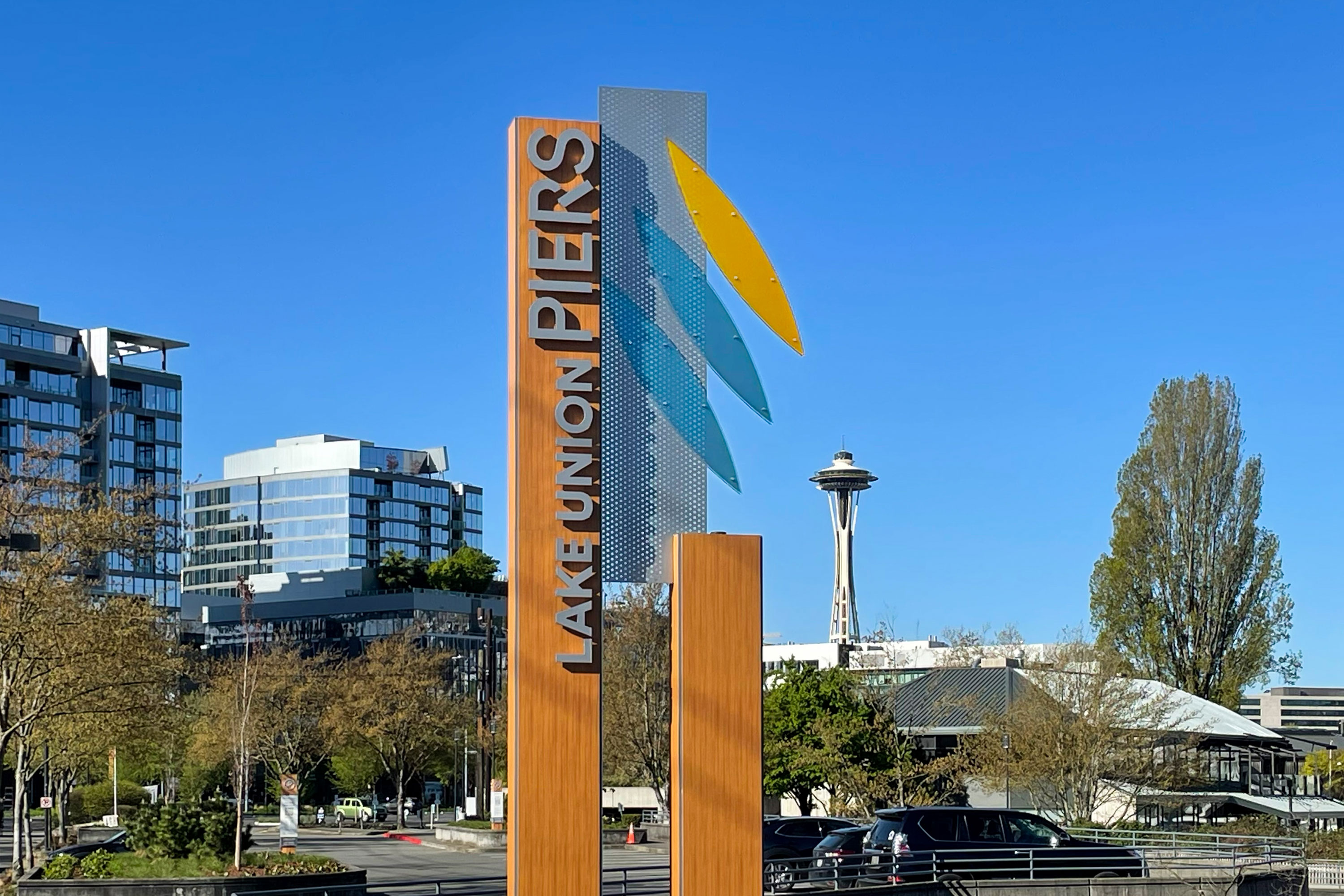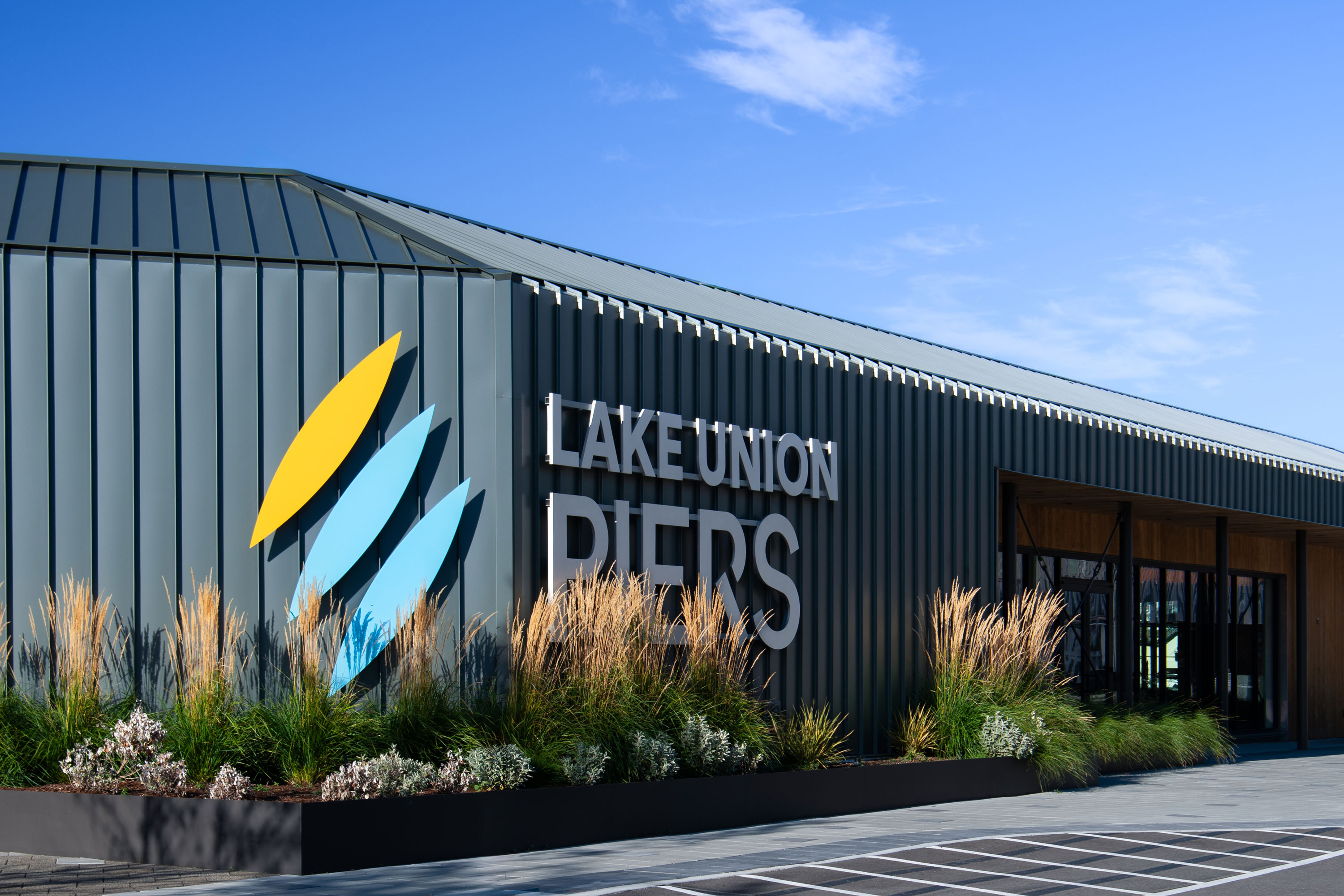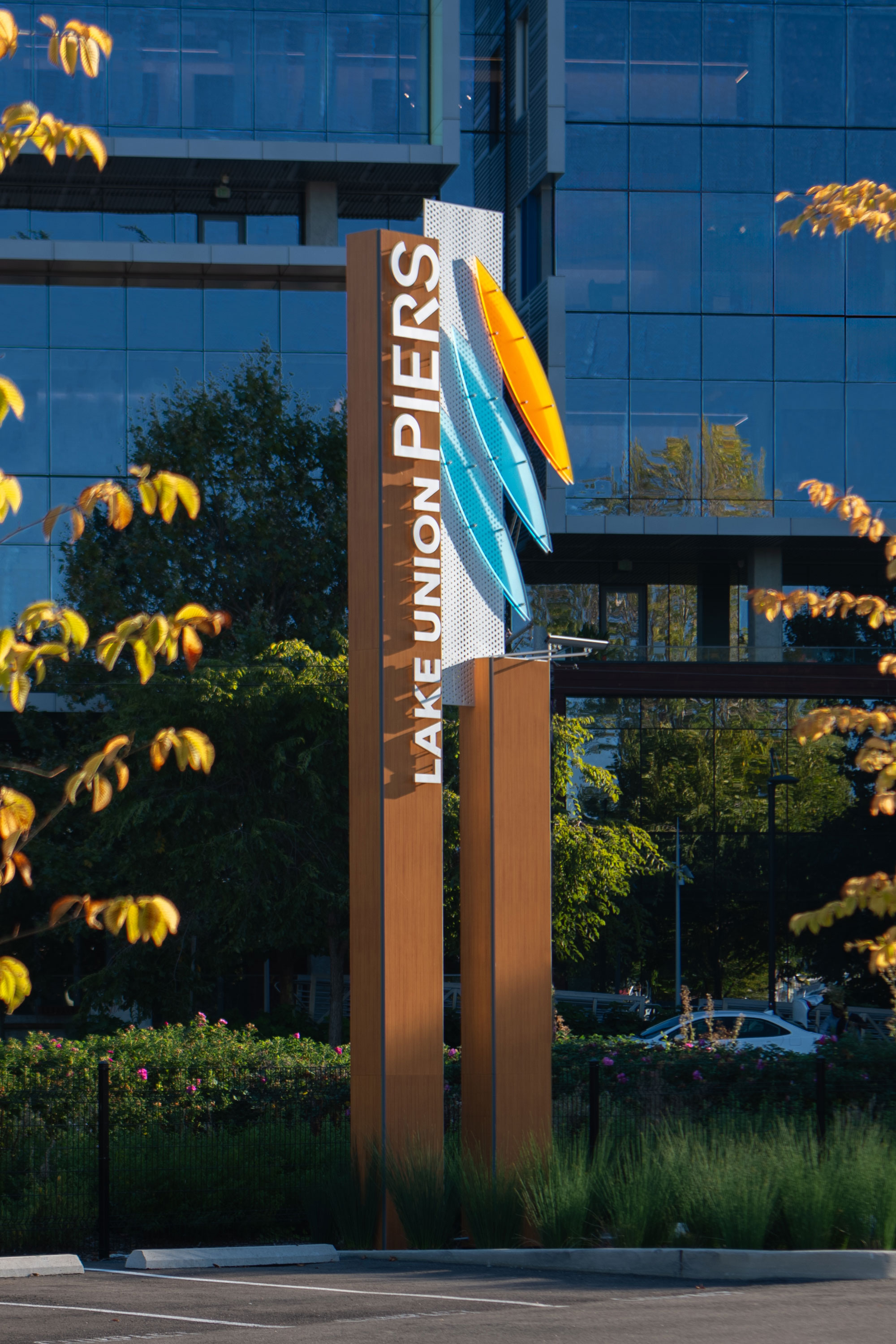 In recent years, thoughtful redevelopment remade the area as an innovative center for human health, recreation, and technology, continuing its long tradition of transformation and adaptation to change. The architectural team, Miller Hull, studied a variety of solutions for the site, ranging from complete demolition and new construction to light-handed renovations of the existing structures. Ultimately, a comprehensive renovation of the existing architecture gave new life to the site, and an improved lakefront experience in keeping with the neighboring park. The rebranding of the site as Lake Union Piers acknowledges this direct connection to the lake and park with symbolism to evoke the ever-present watercraft that have long visited its shores. Throughout the site, integrated wayfinding provides continuity, and upon approach, well-placed site identity welcomes visitors to this vibrant destination along the water.