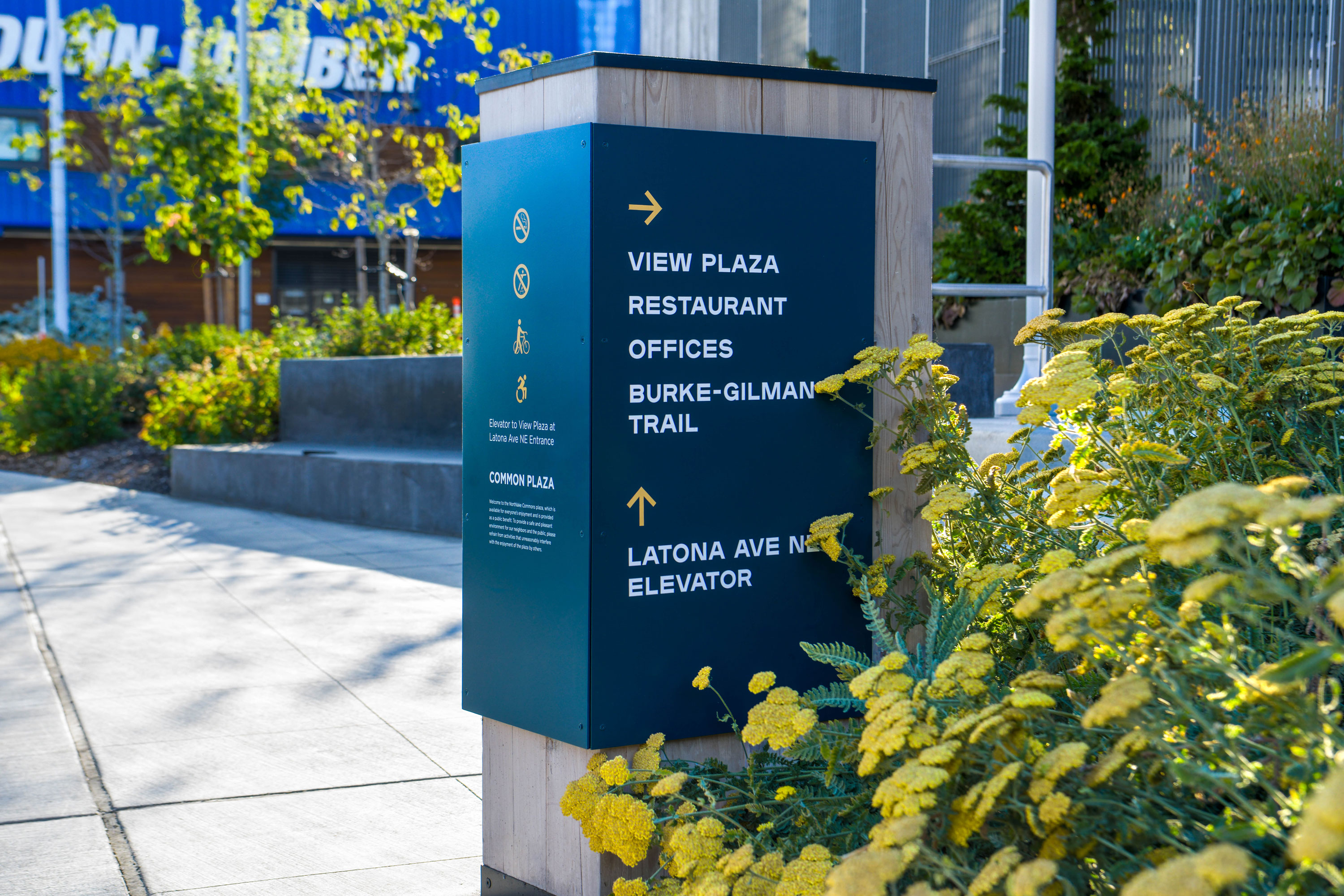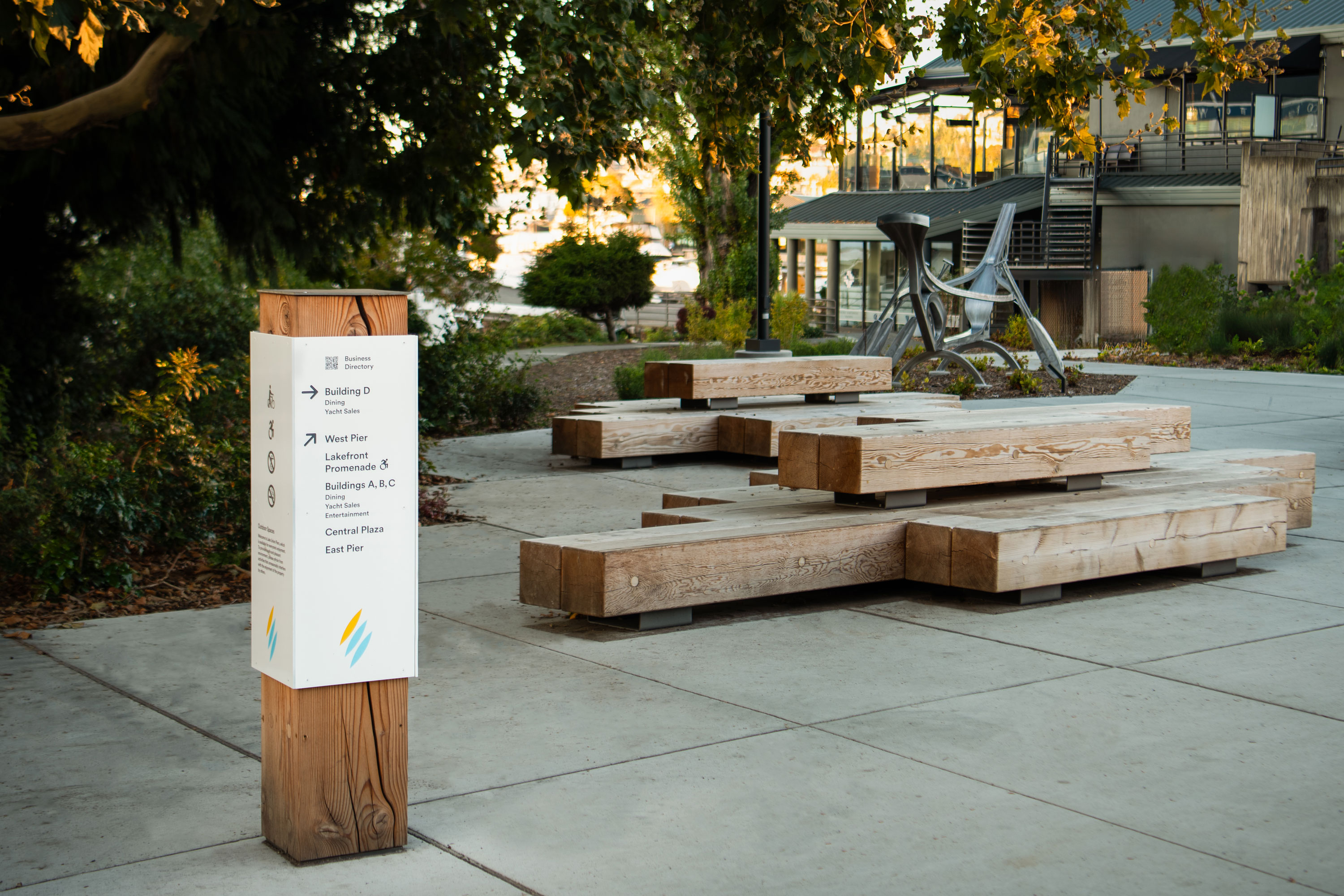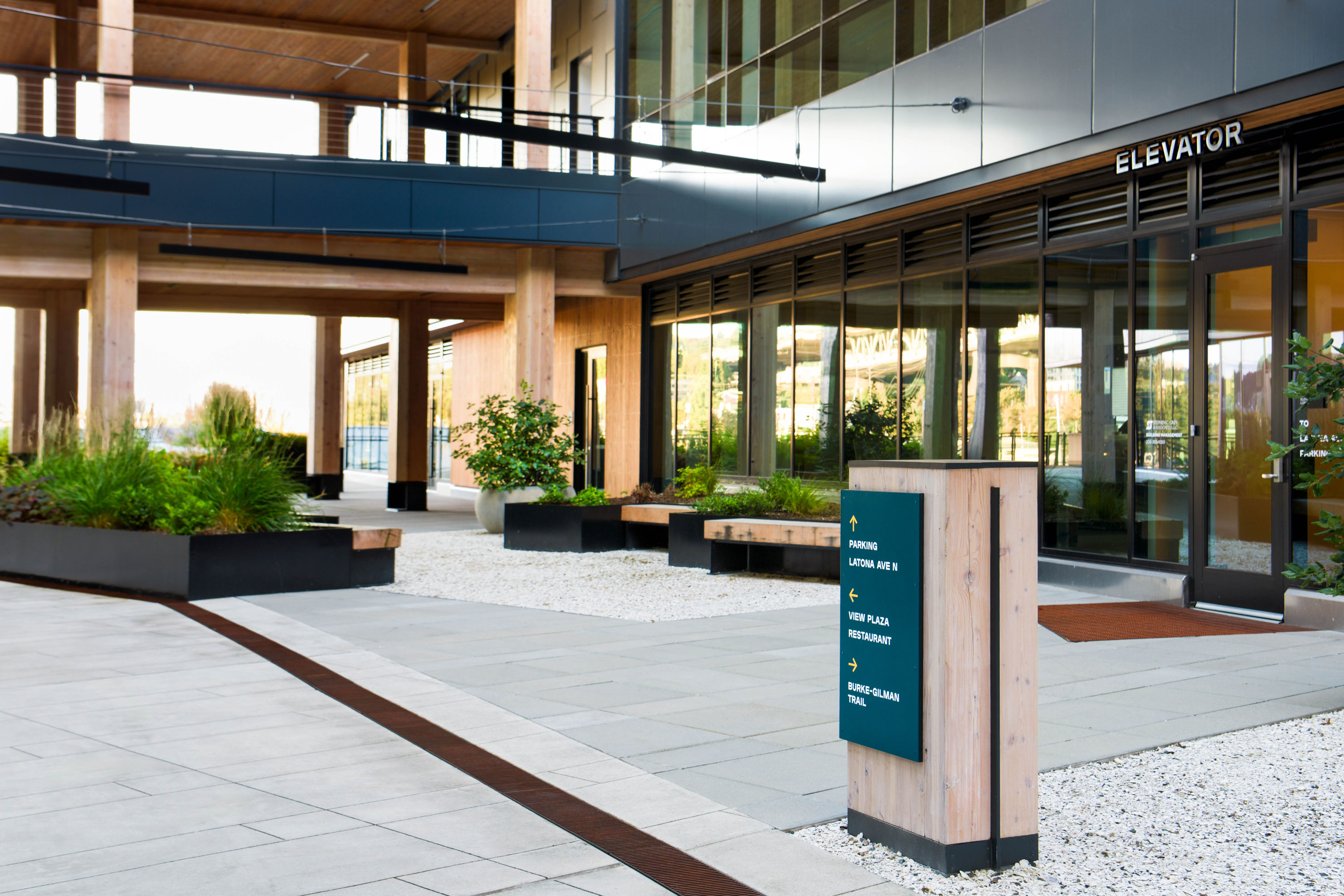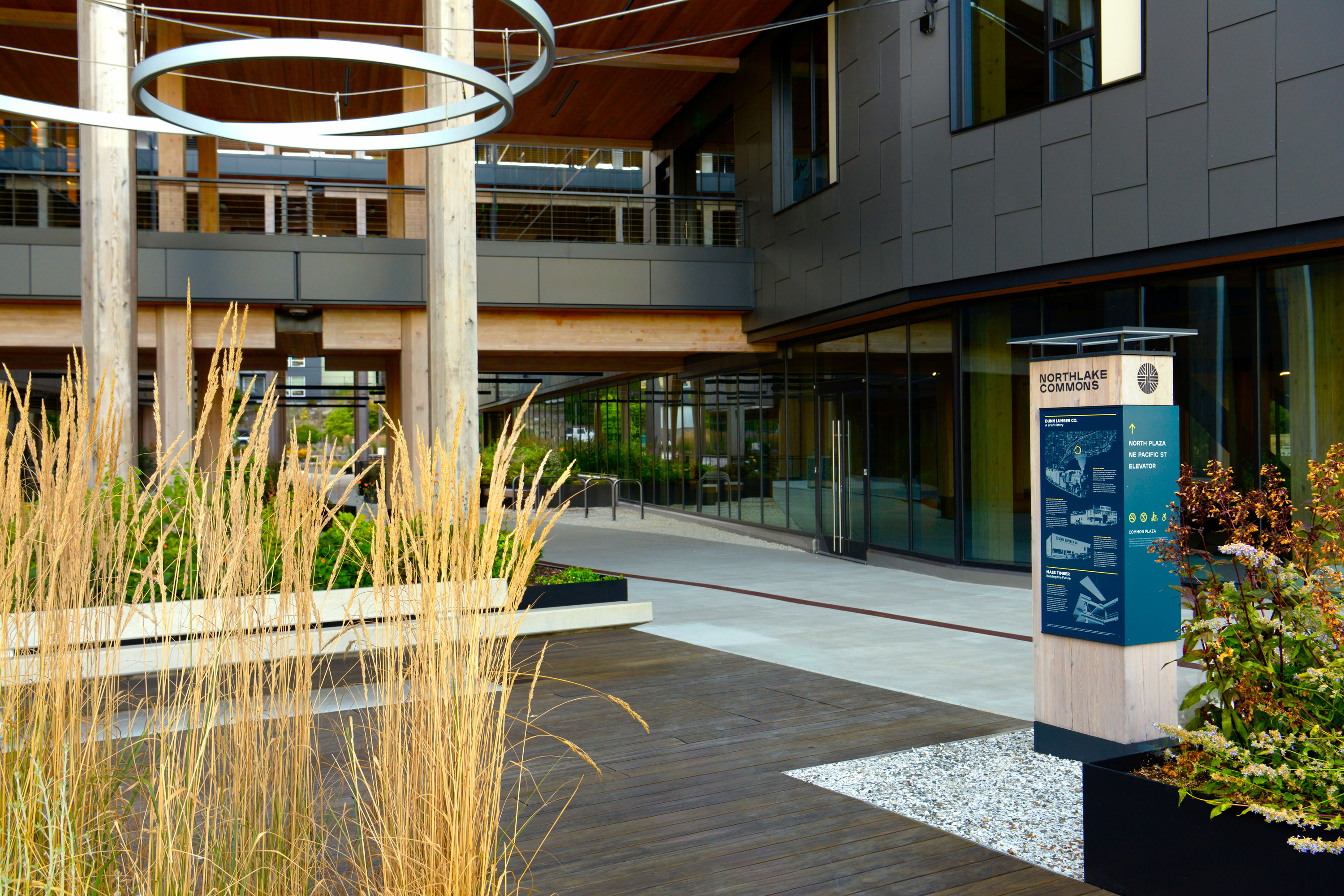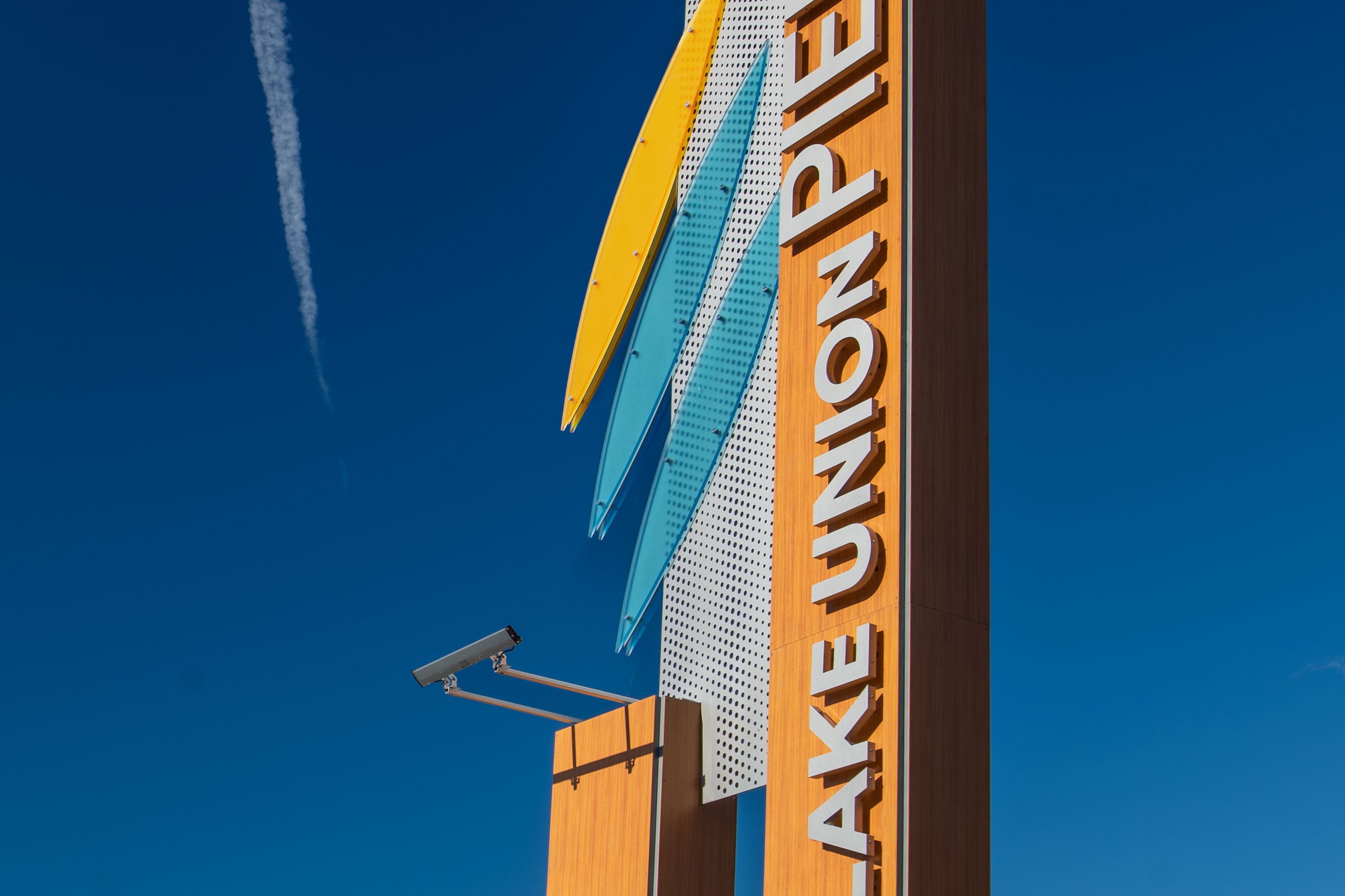In recent years, thoughtful redevelopment remade the area as an innovative center for human health, recreation, and technology, continuing its long tradition of transformation and adaptation to change. The architectural team, Miller Hull, studied a variety of solutions for the site, ranging from complete demolition and new construction to light-handed renovations of the existing structures. Ultimately, a comprehensive renovation of the existing architecture gave new life to the site, and an improved lakefront experience in keeping with the neighboring park. The rebranding of the site as Lake Union Piers acknowledges this direct connection to the lake and park with symbolism to evoke the ever-present watercraft that have long visited its shores. Throughout the site, integrated wayfinding provides continuity, and upon approach, well-placed site identity welcomes visitors to this vibrant destination along the water.