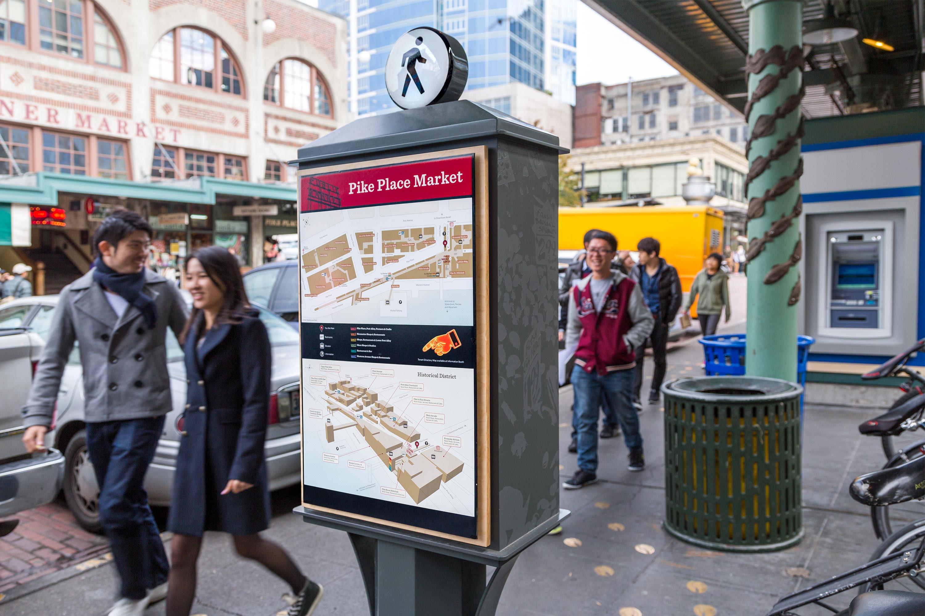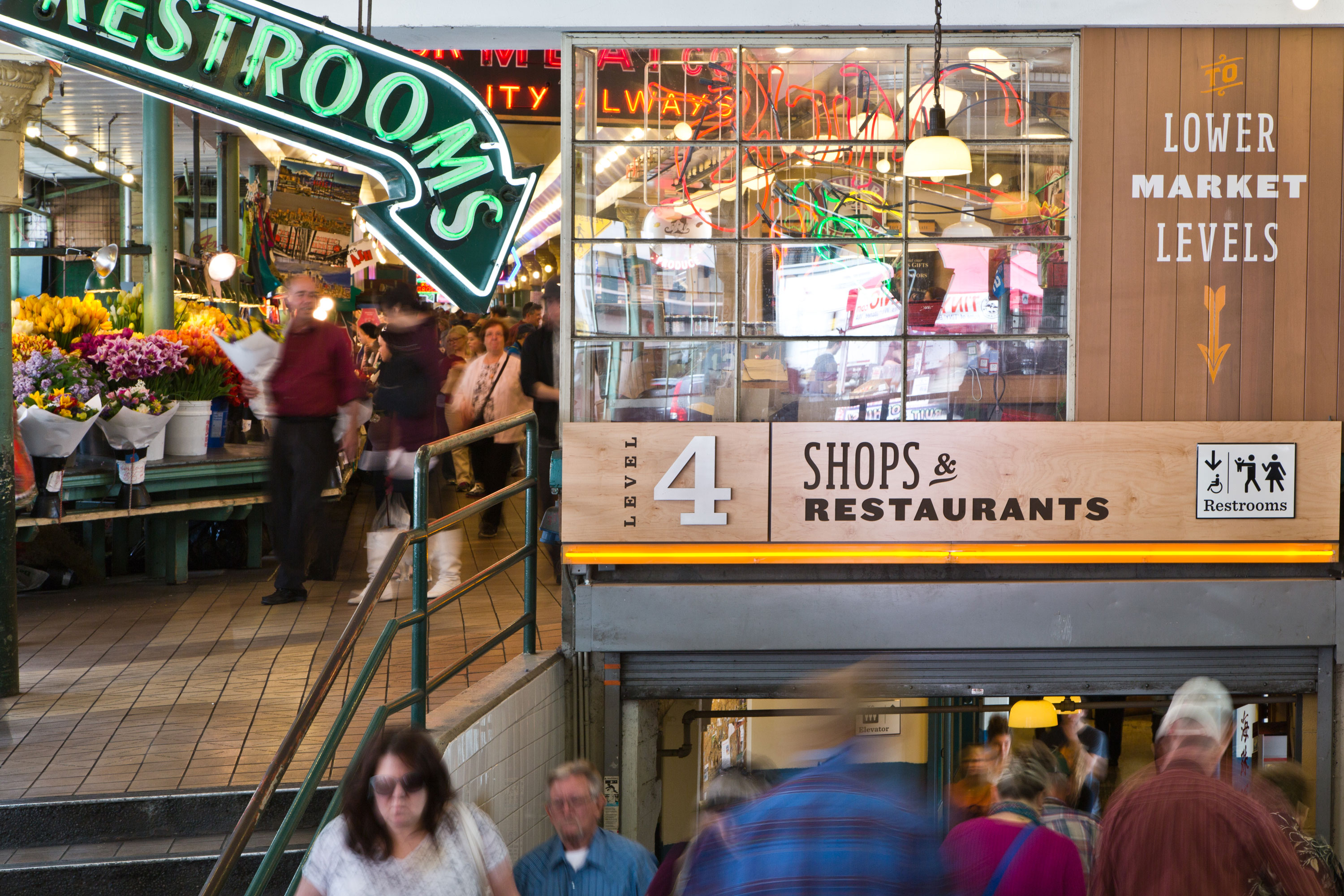 Upon completion of a three-year renovation to replace aging infrastructure and rebuild the Pike St. Hillclimb, this wayfinding program was designed to highlight renovated areas and draw attention to new restrooms and elevators. The wayfinding included the design of map pedestals to communicate the breadth and story of the historical district with carefully sited orientation maps at specific locations. In addition to orientation, these free-standing pedestals provide important facts and history about the Market. Made of utilitarian high-contrast enamel and the use of whimsical iconography to stand out in the bustling environment they retain a playful character and sense of fun. Entrance headers to the lower levels are integrated with wood and neon to distinguish the levels and carefully designed to complement the historic structures. To emphasize the importance of the historical district, new signs were coupled with street signs to communicate the threshold and arrival at the district.