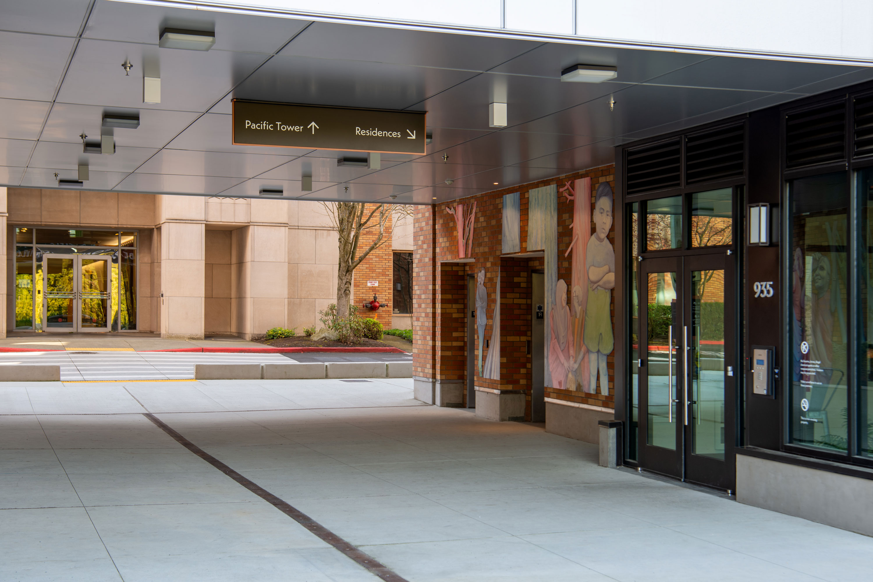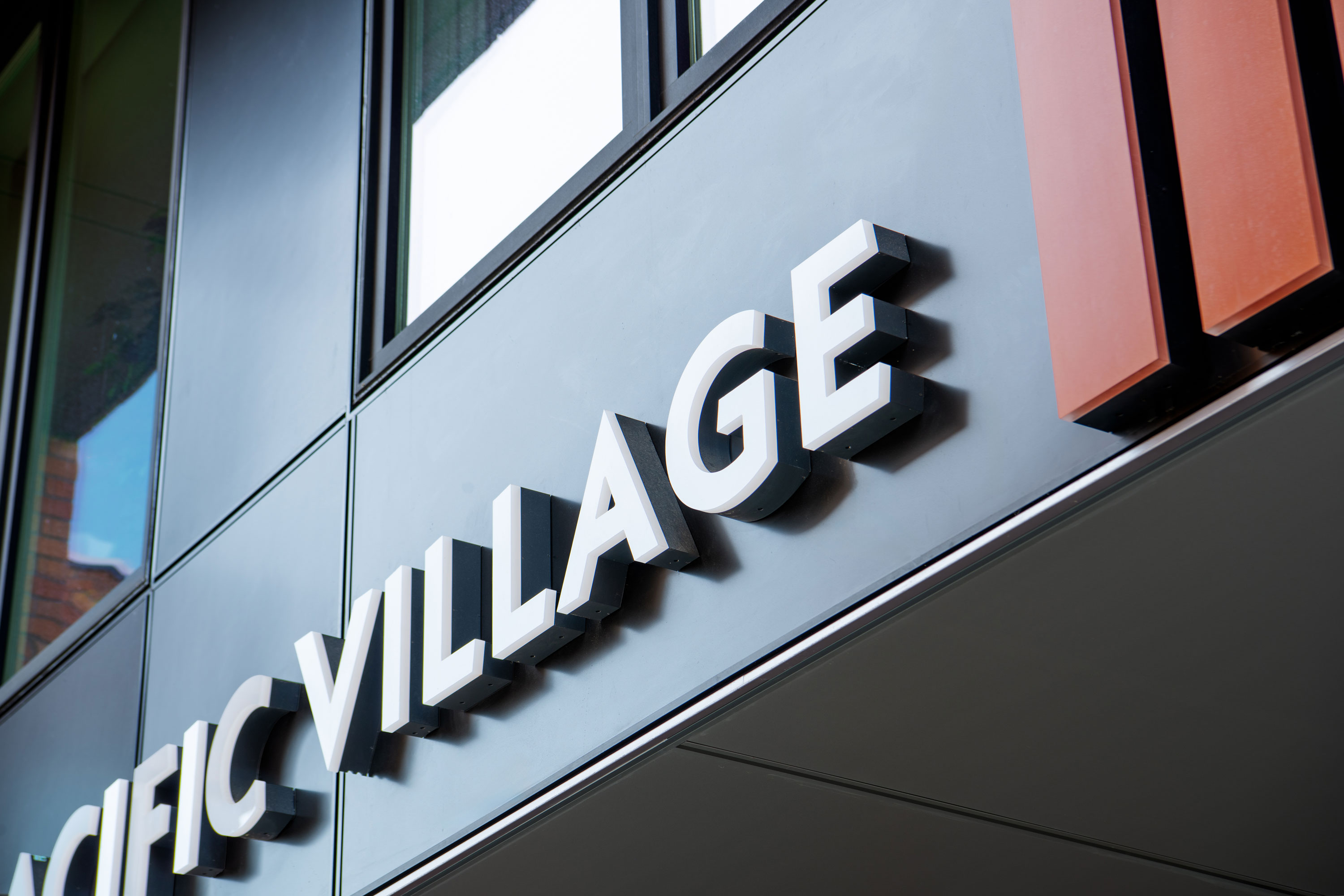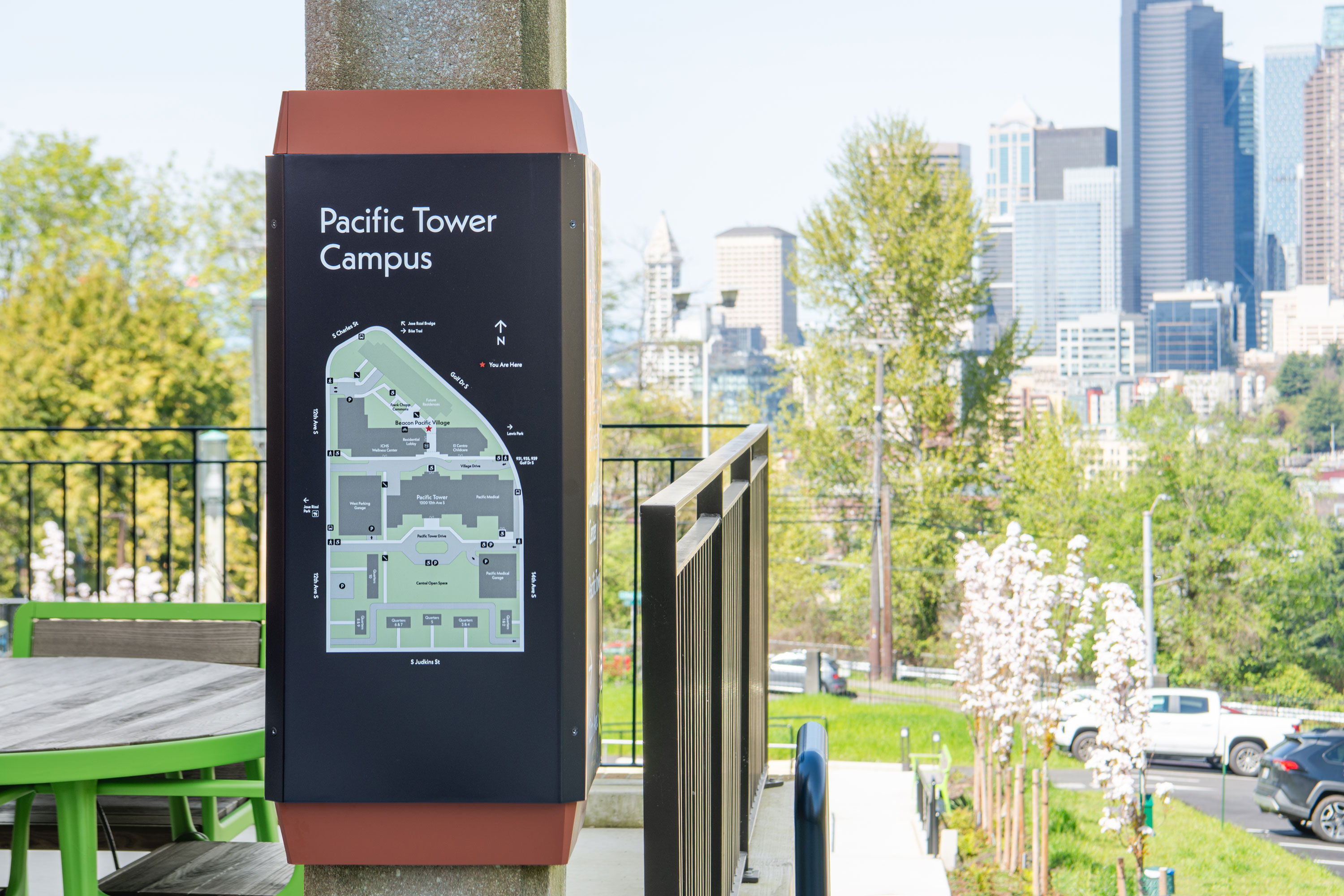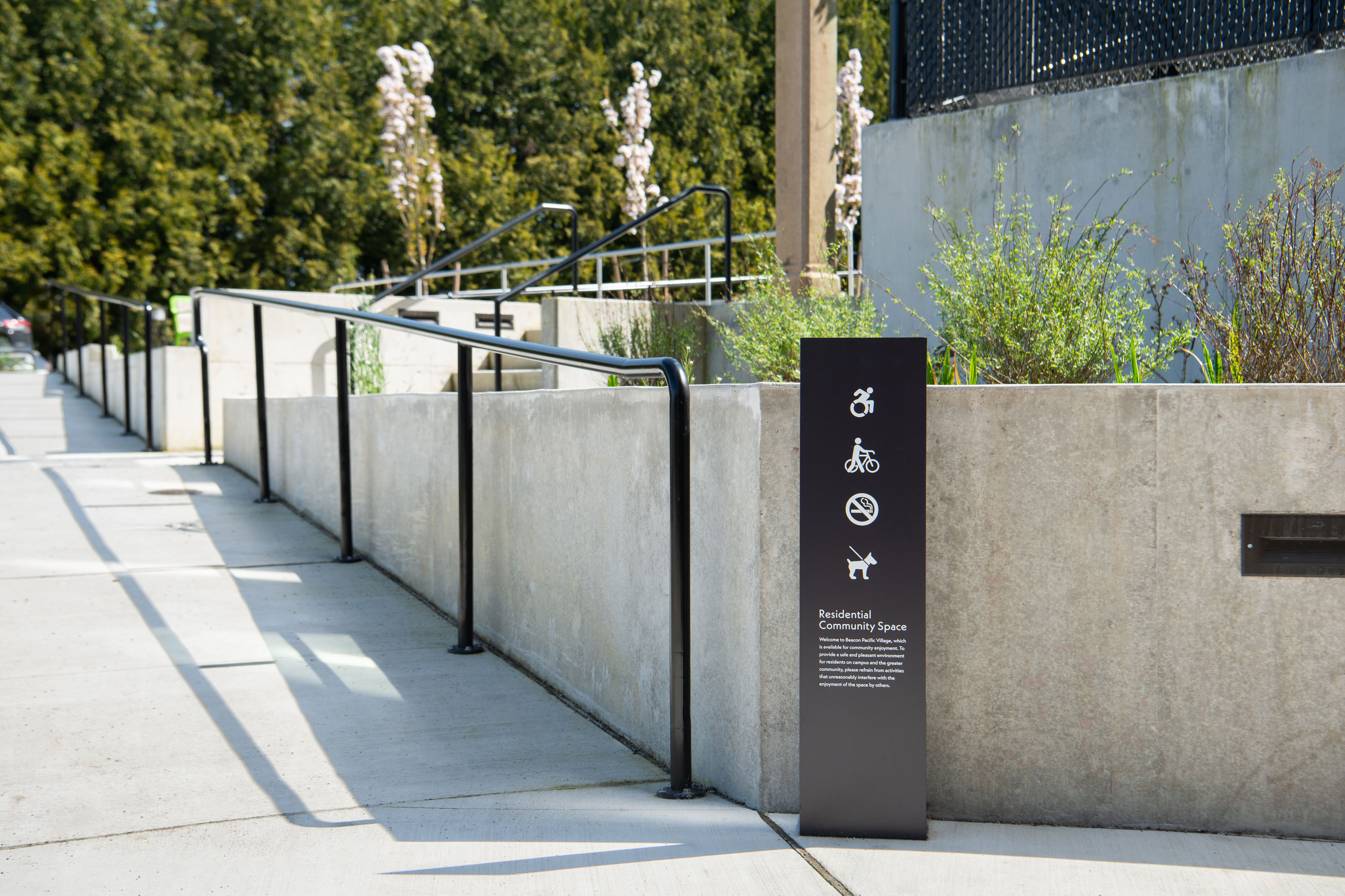 Sharing the grounds with the iconic Pacific Tower, the visual identity evokes design details of the historic landmark and an inclusive ‘Village’ name to reflect the hub of social services and multi-cultural programs that have long-resided on campus. At pedestrian-friendly arrival points, identity markers and wayfinding welcome visitors to campus. Along the internal Village Drive, a prominent façade mounted identity announces the main entry portal to the residences. And for site design continuity, historic campus lampposts were salvaged and repurposed along the new pathways to become ideal placements for wayfinding and campus orientation maps.